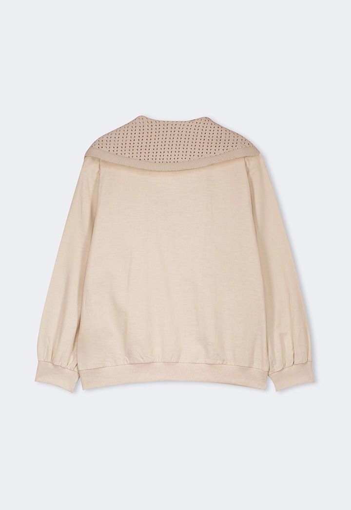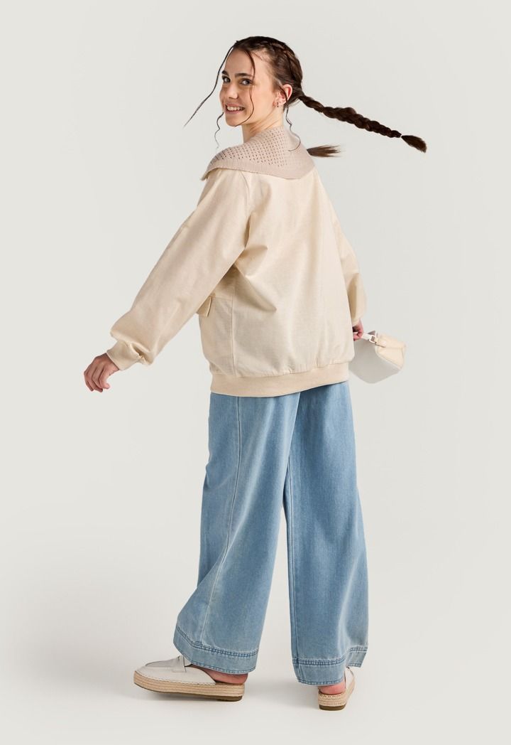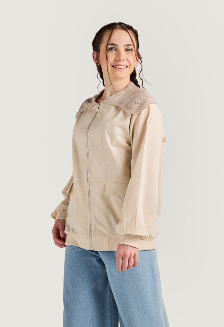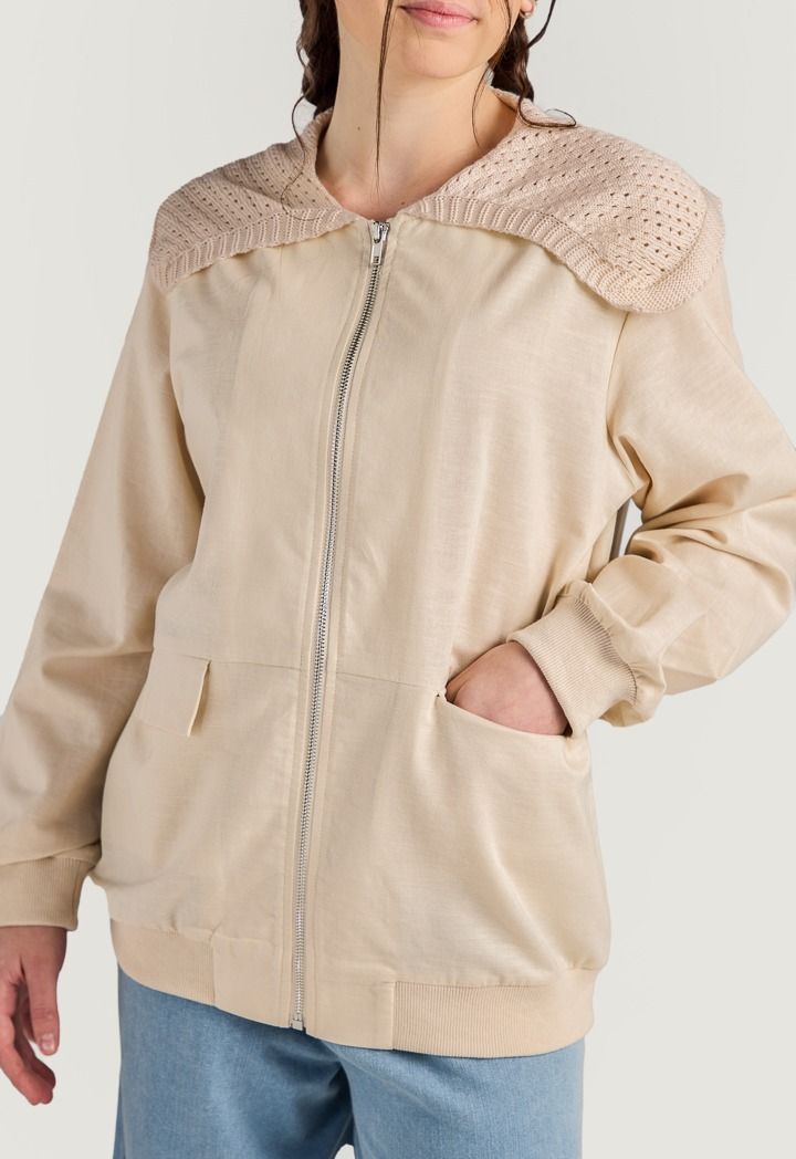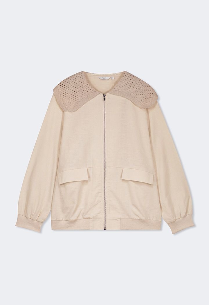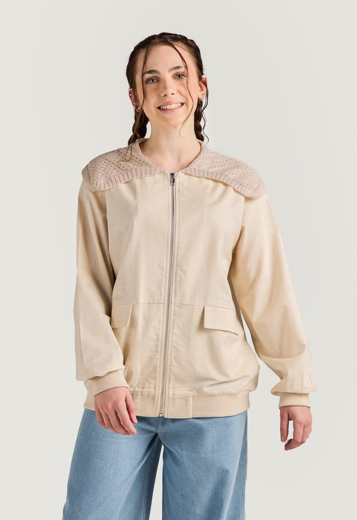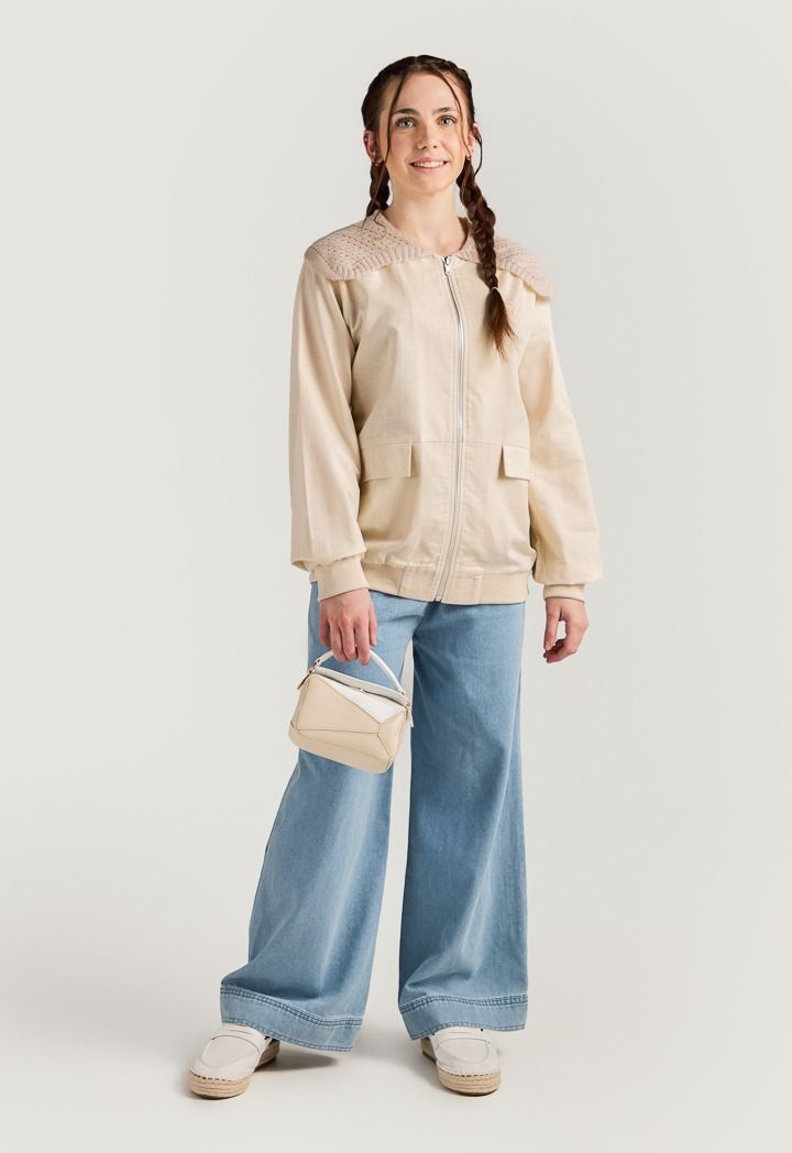 Expand your style wit this jacket, featuring a linen design and crochet shoulders.