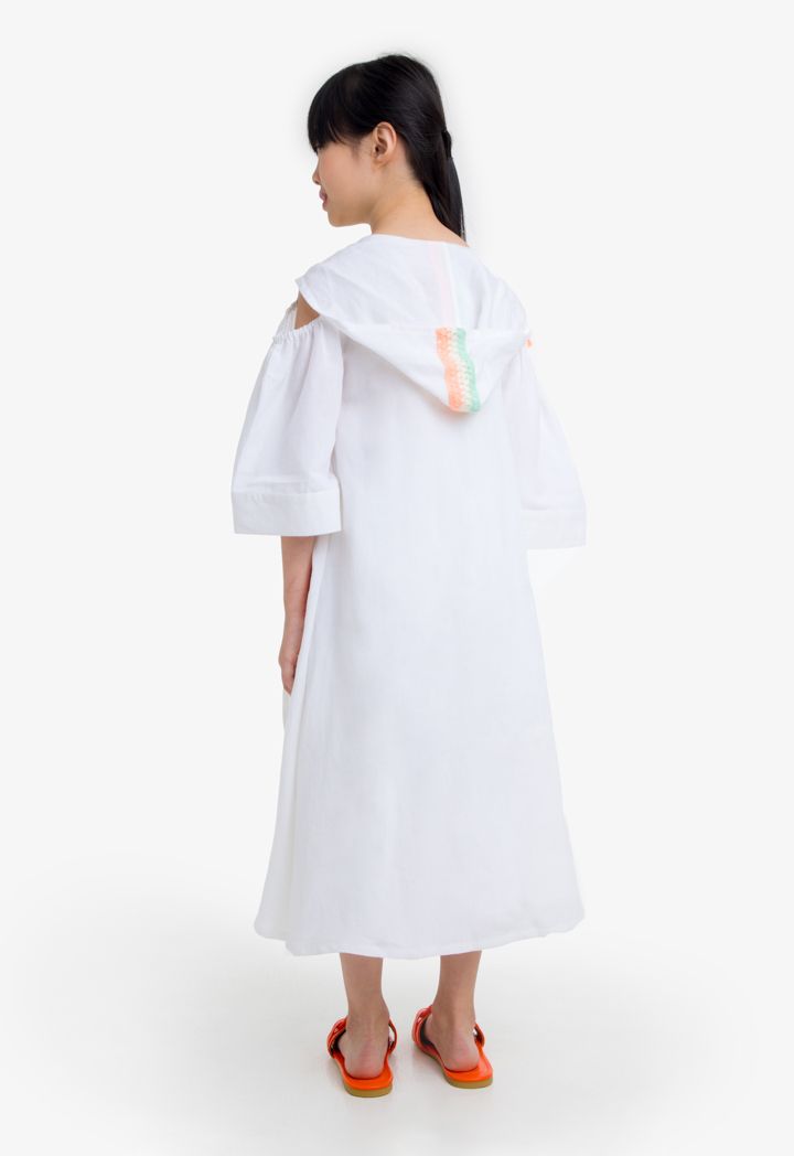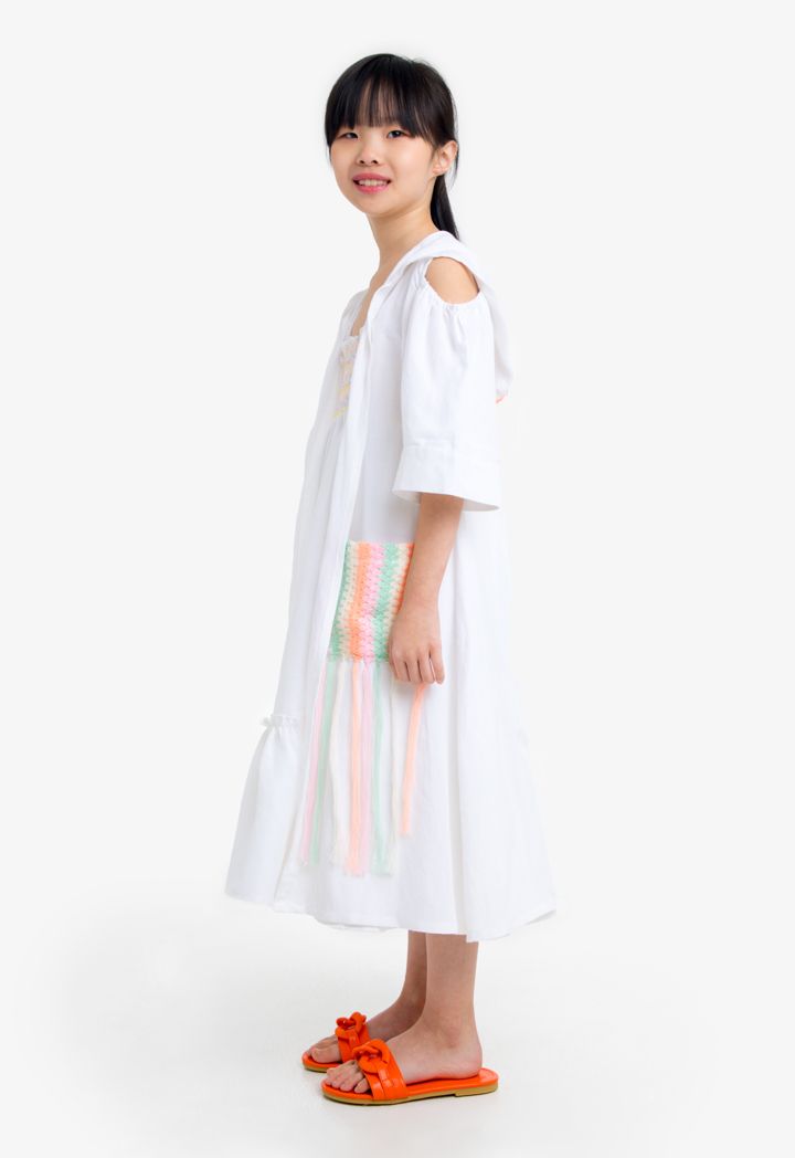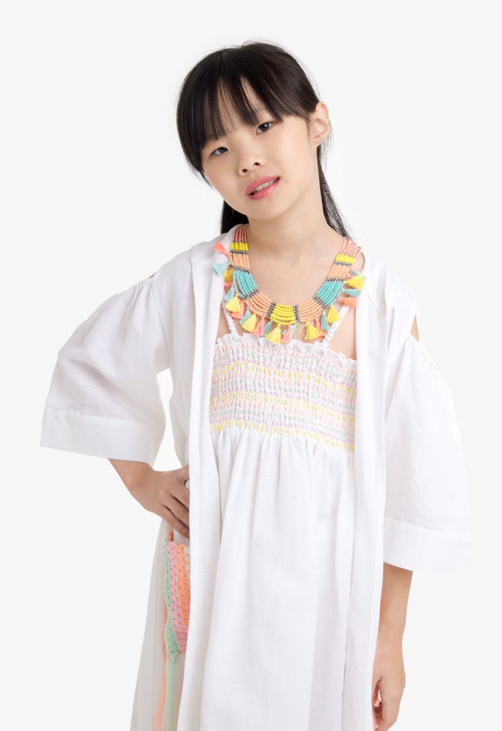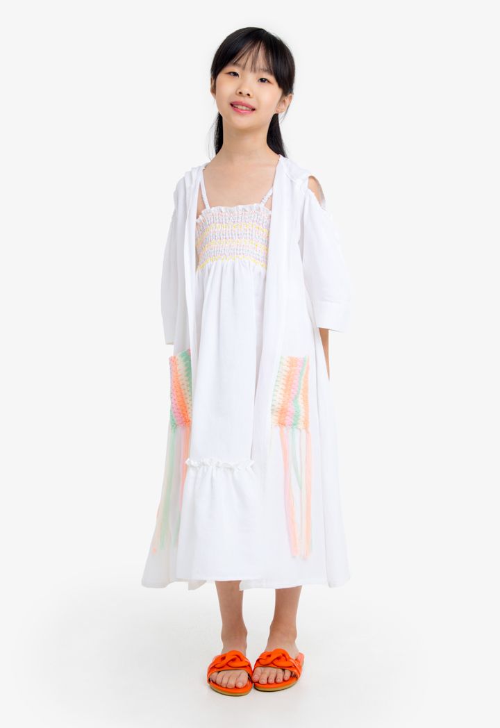 A Classy addition is coming to your girl collection with this set. The Cold Shoulder, Hooded Abaya comes with a crochet detailing at front patch pockets is an eye catching piece. Smocked, Ruffled Hem Dress.
