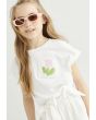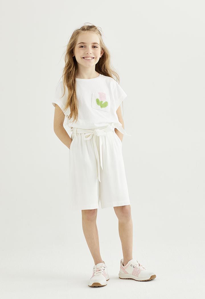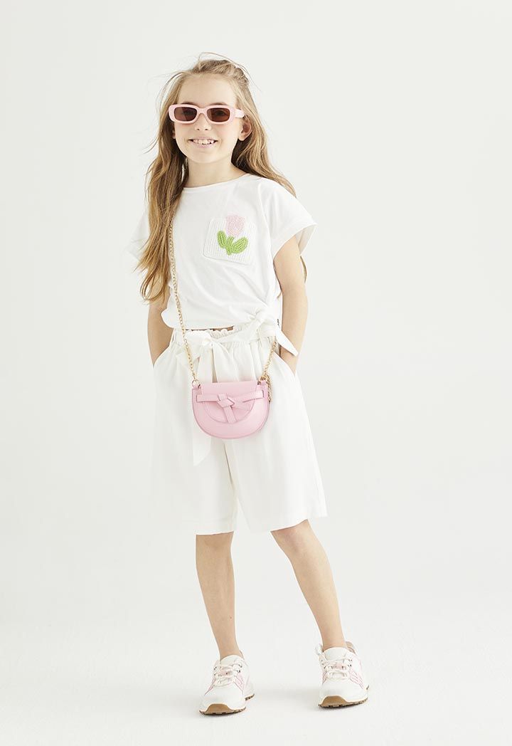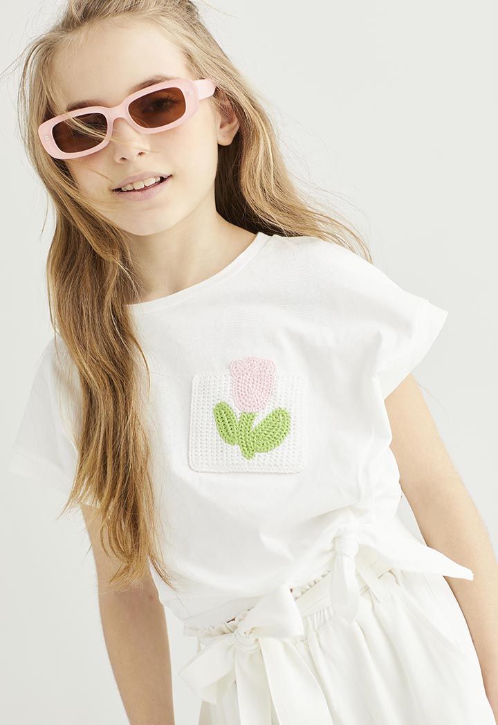 A versatile design of a t shirt thanks to its solid design which is amplified by the embellishment of a crochet pocket and tie hems.
