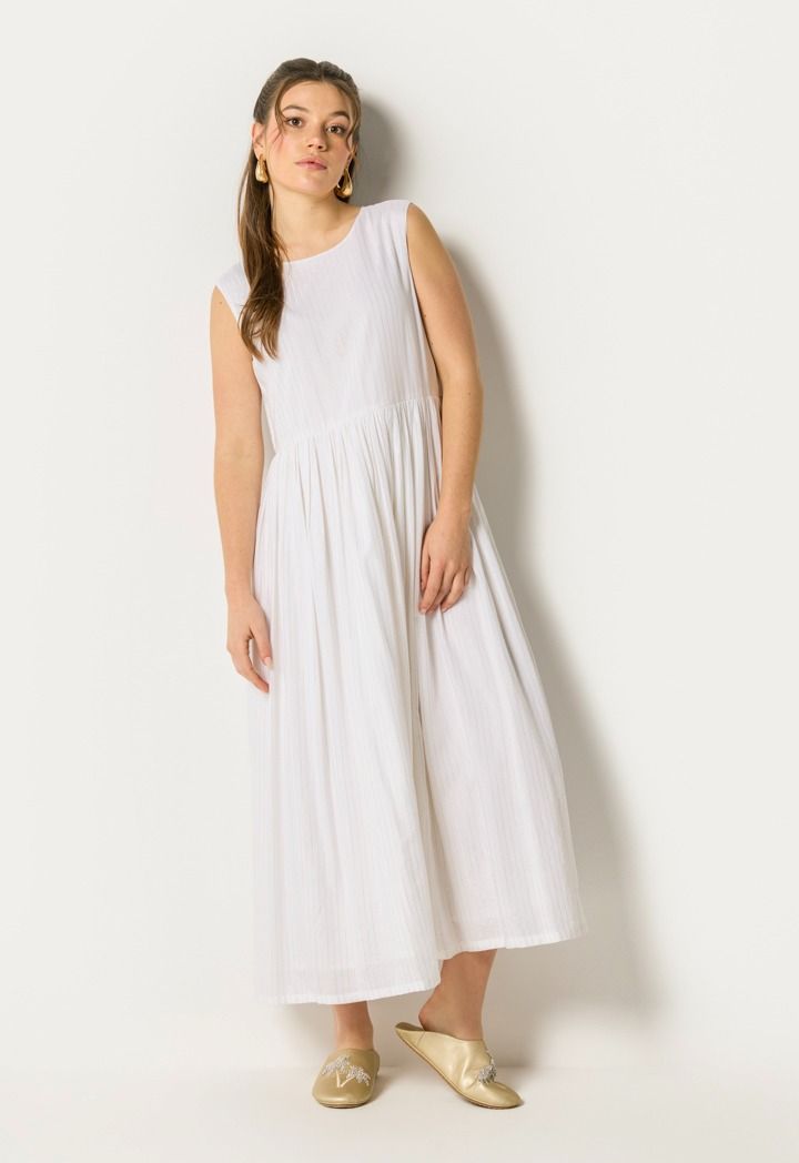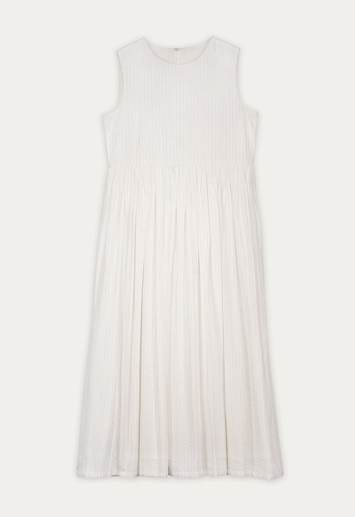Design : Contrast, Stripes, Lurex, Embroidered, Tassels, Inner Sleeveless Solid Pleated Dress, Attached Lining