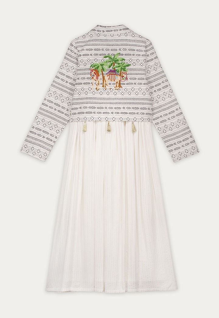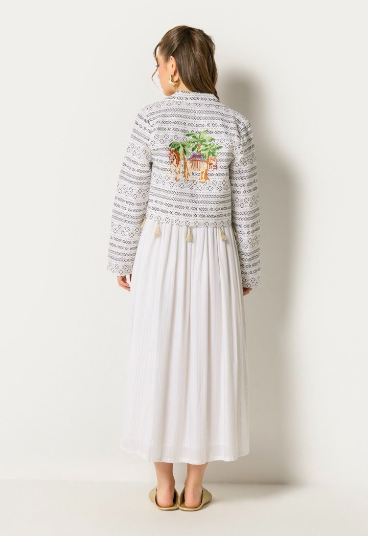 Soft stripes and playful Camal embroidery give this dress a fun, desert-inspired touch for relaxed Ramadan gatherings.
