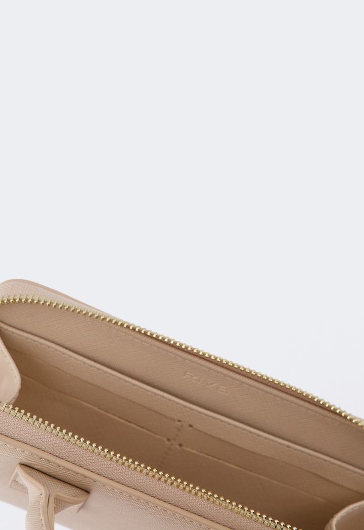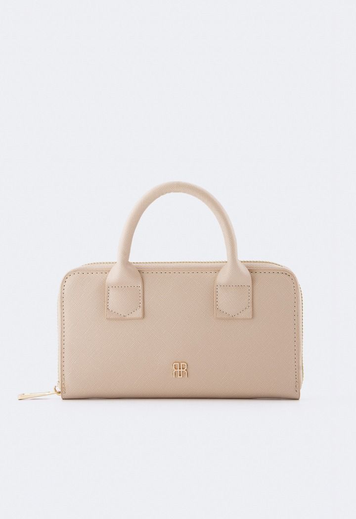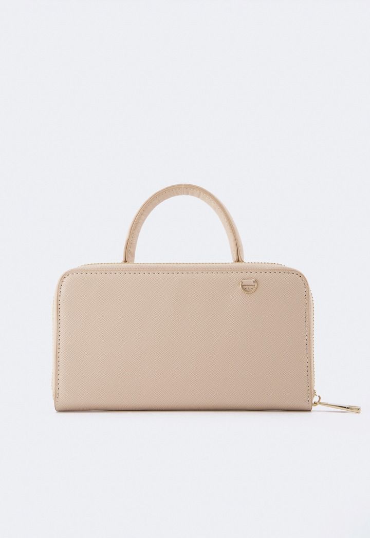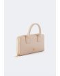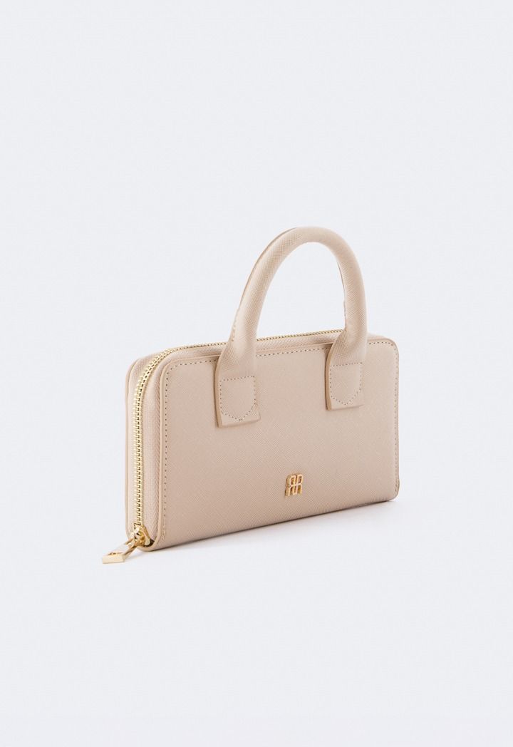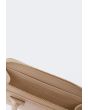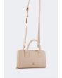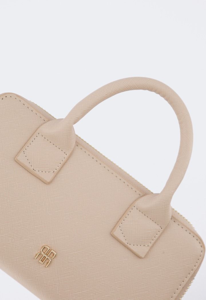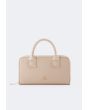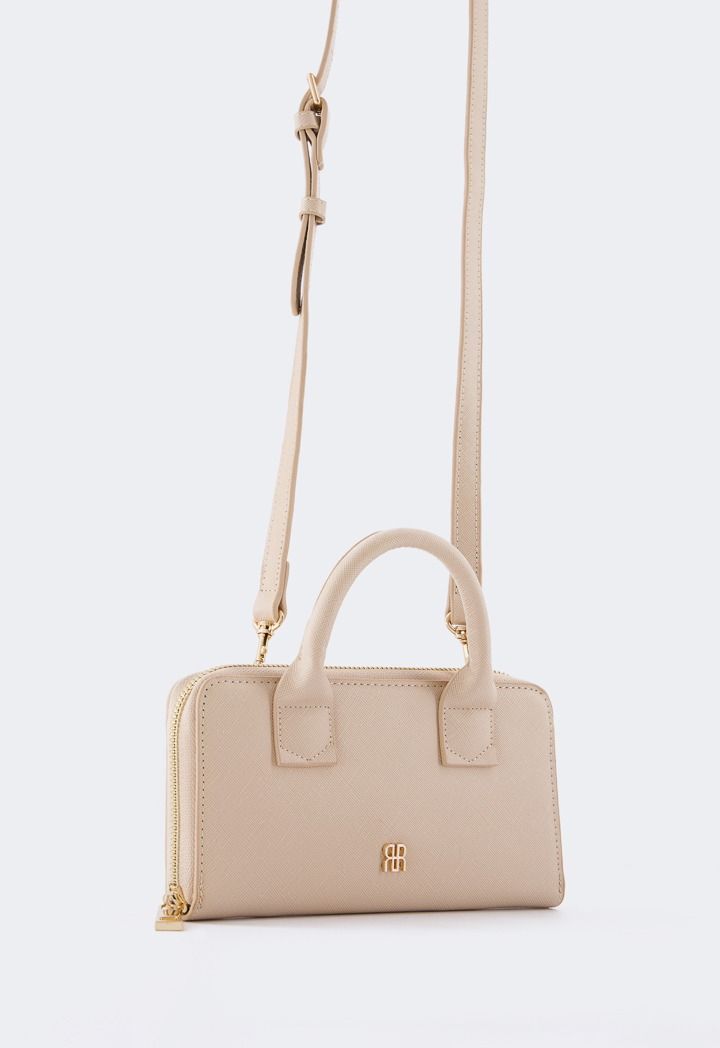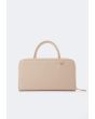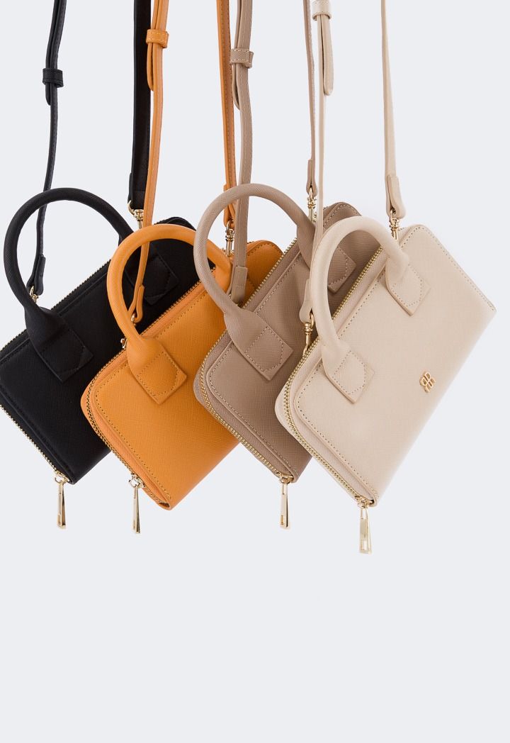 A solid pouch that features a top handle, inner compartments and a shoulder strap.