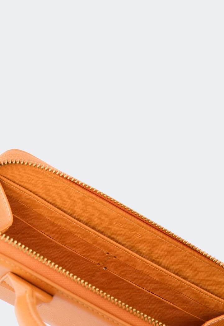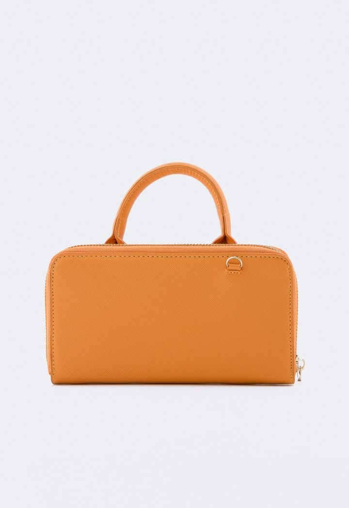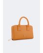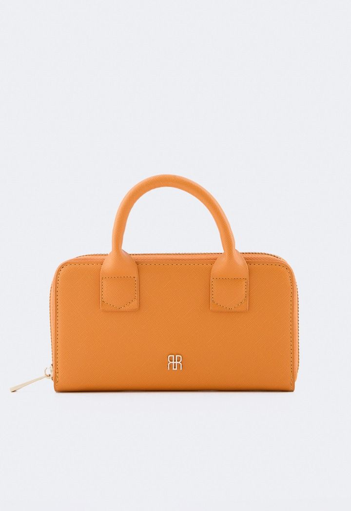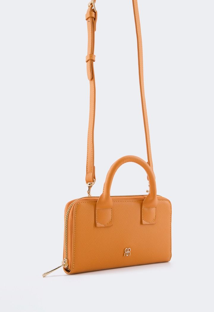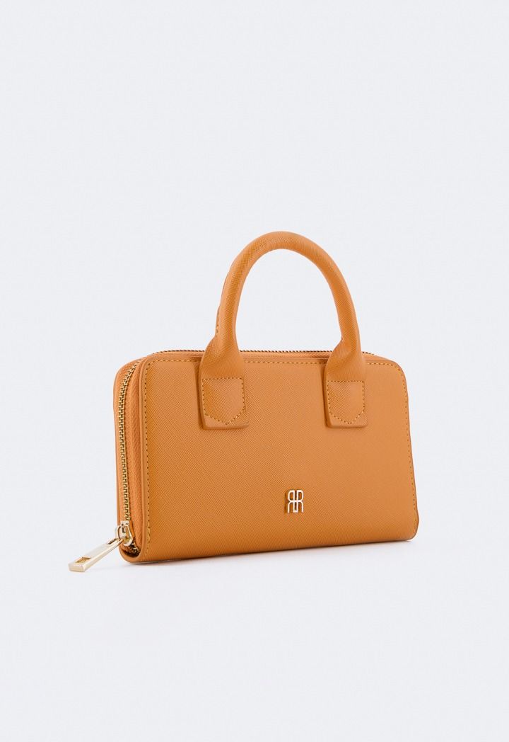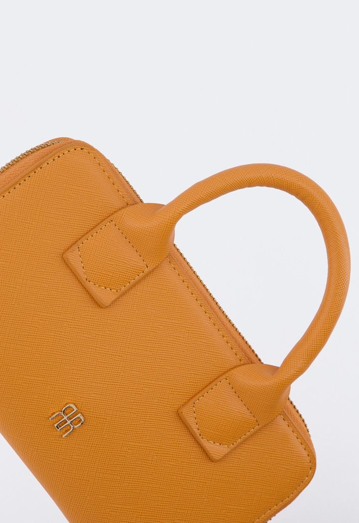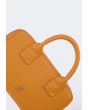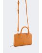 A solid pouch that features a top handle, inner compartments and a shoulder strap.