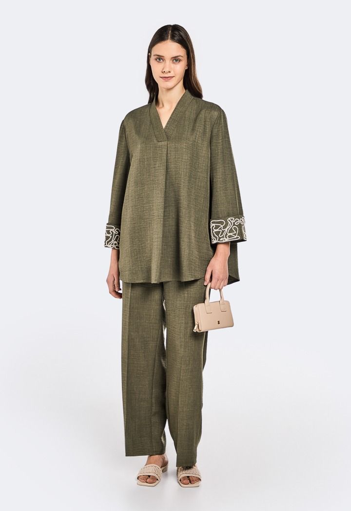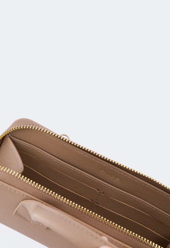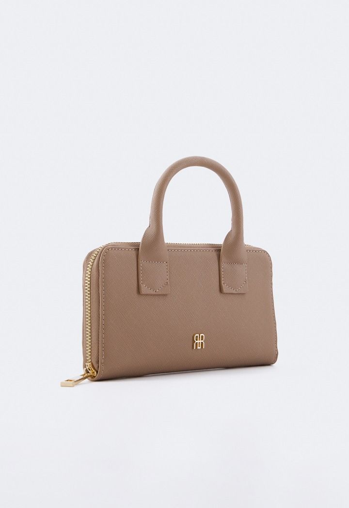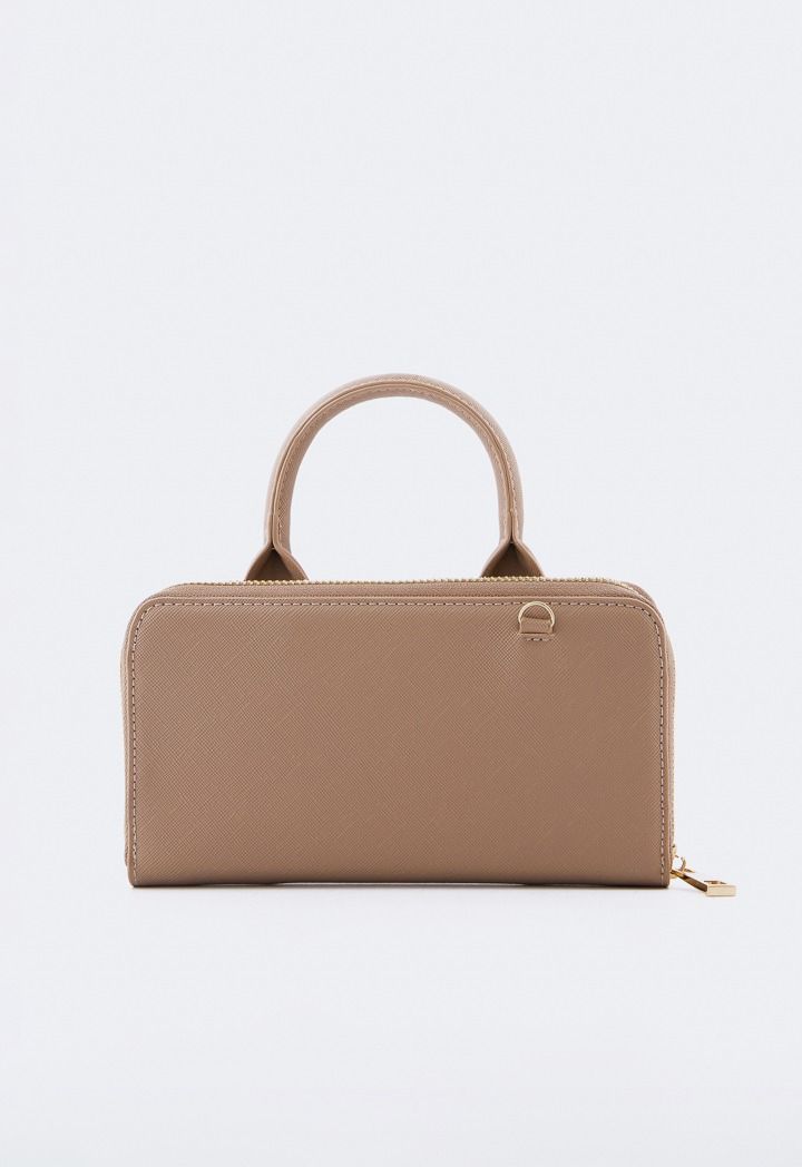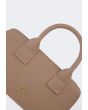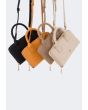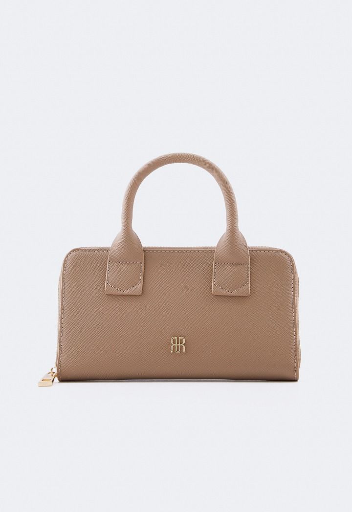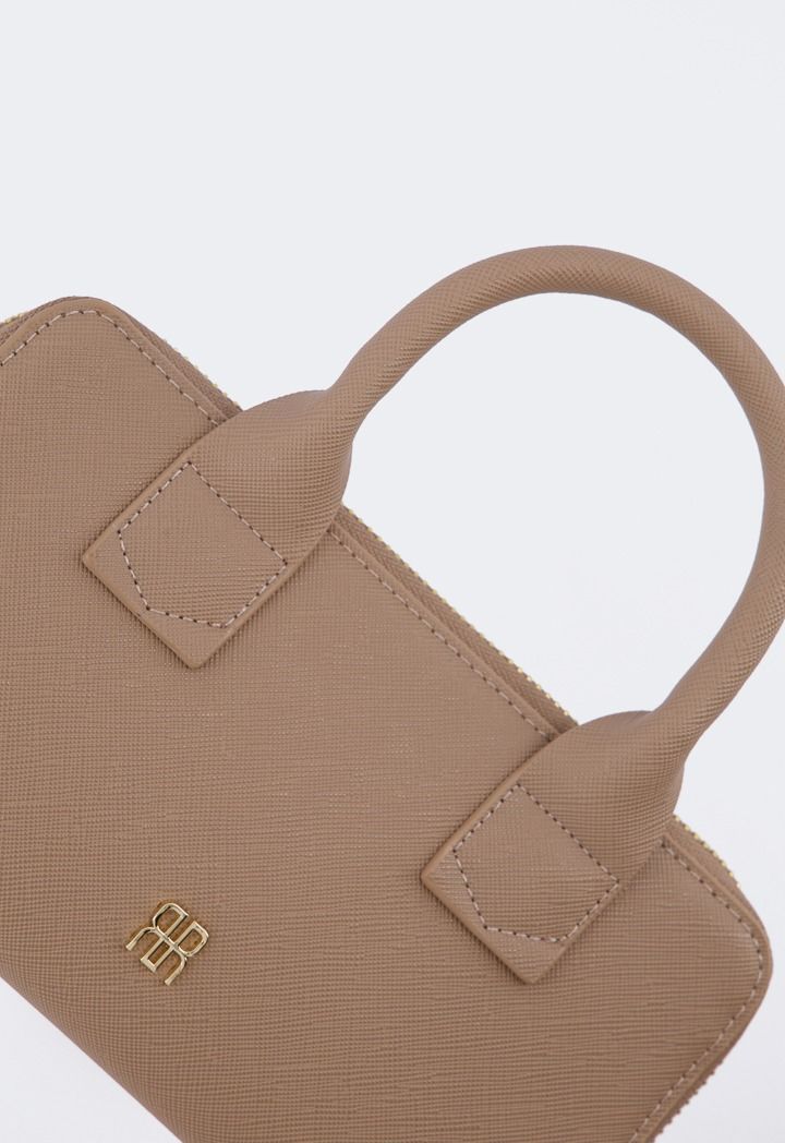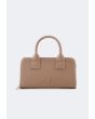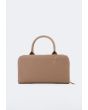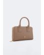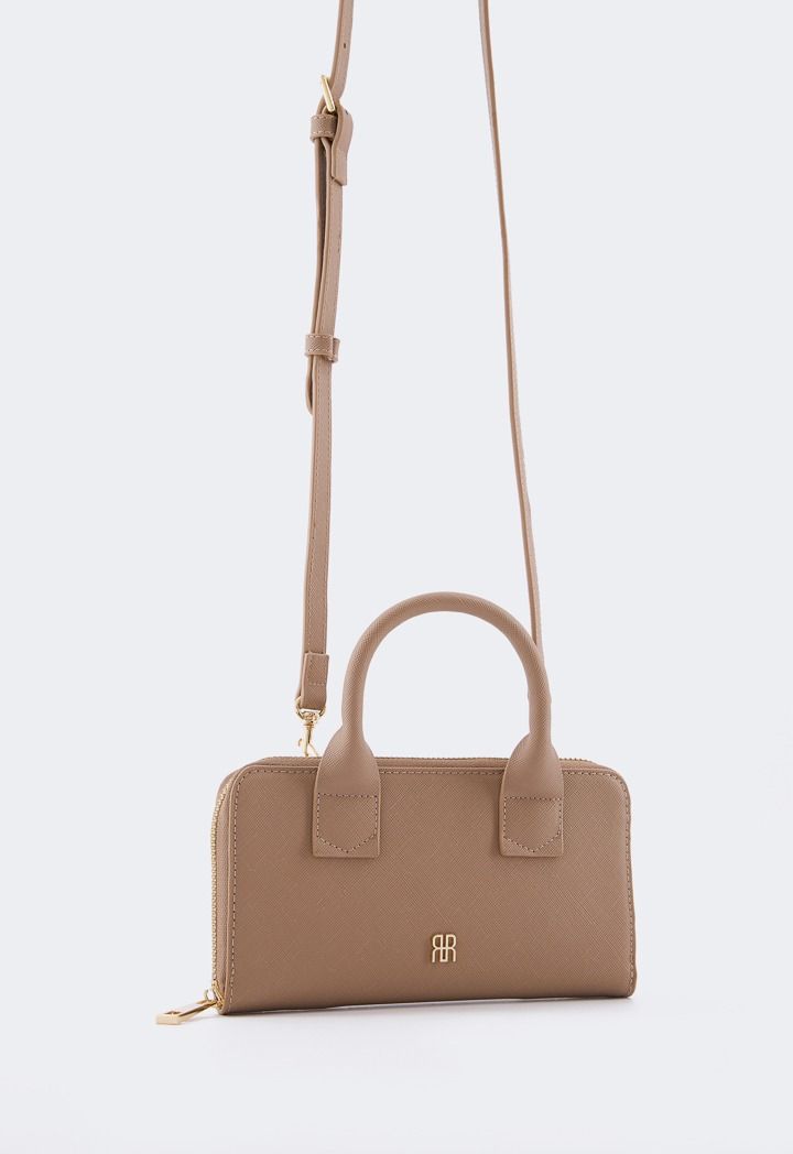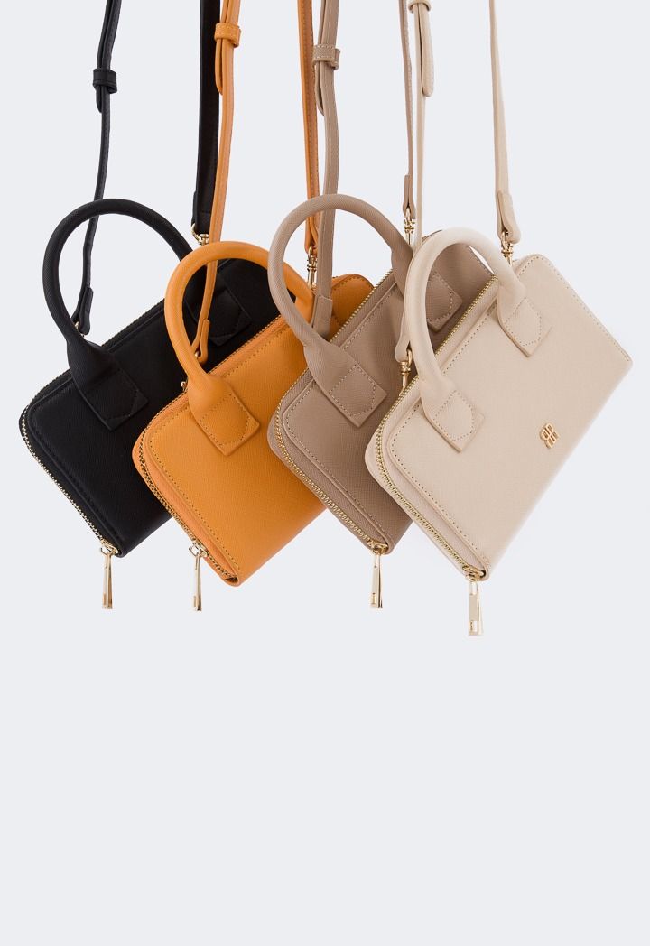 A solid pouch that features a top handle, inner compartments and a shoulder strap.