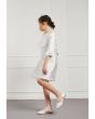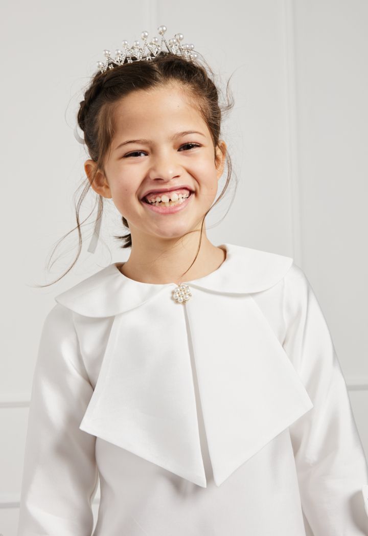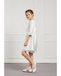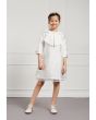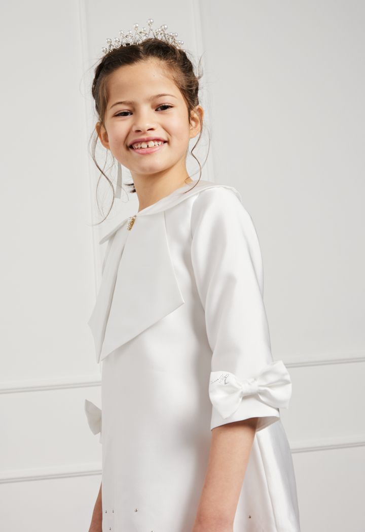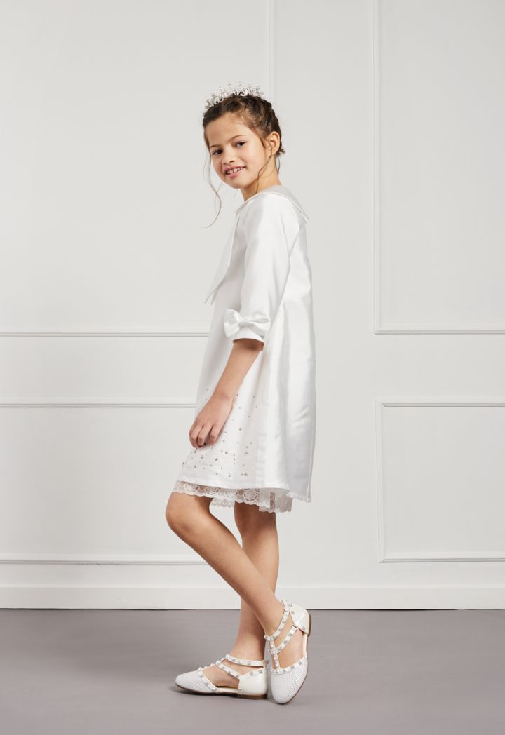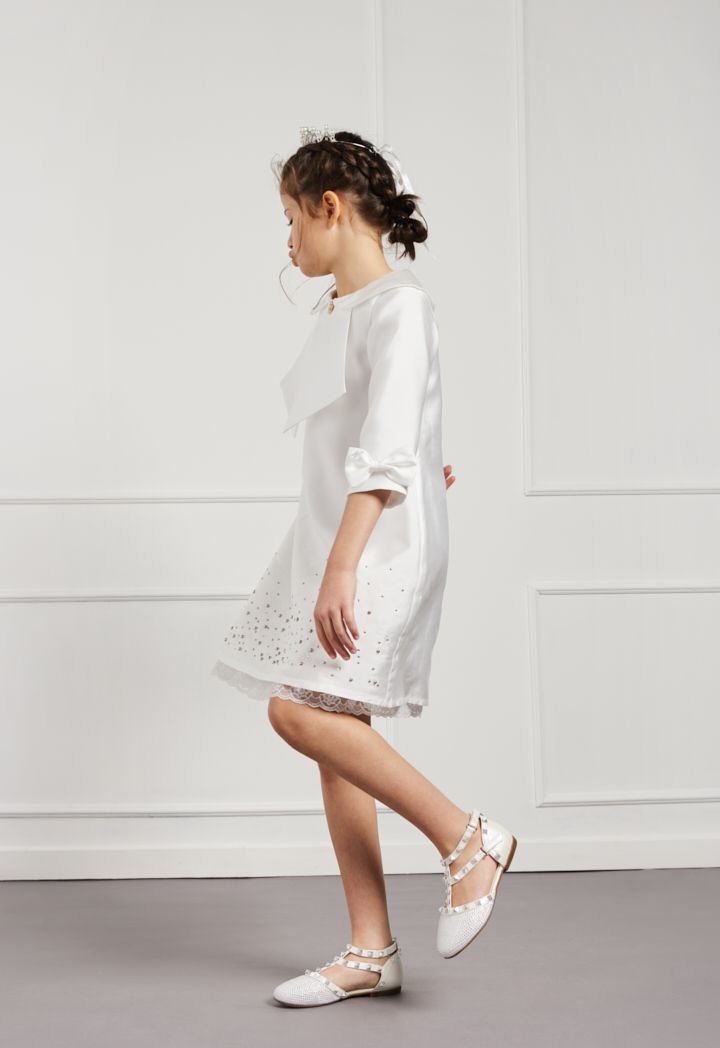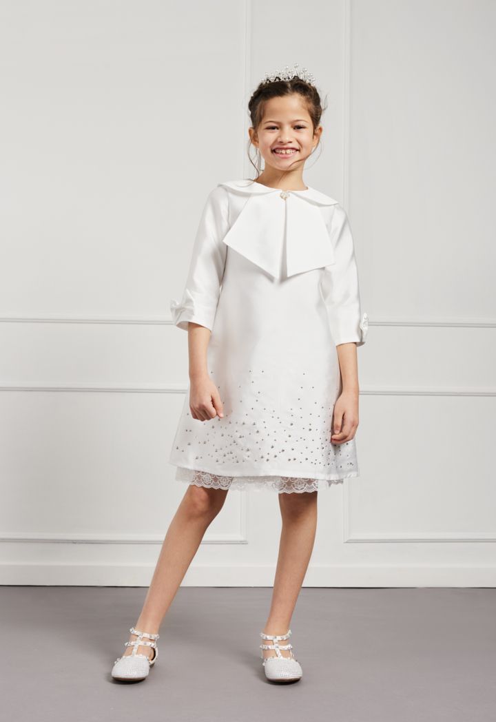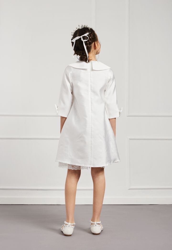 Fashionable Knee Long Dress. Featuring Peter Pan Collar, Bow Sleeves and Crystal and Lace Embellished Hems