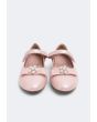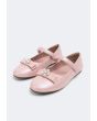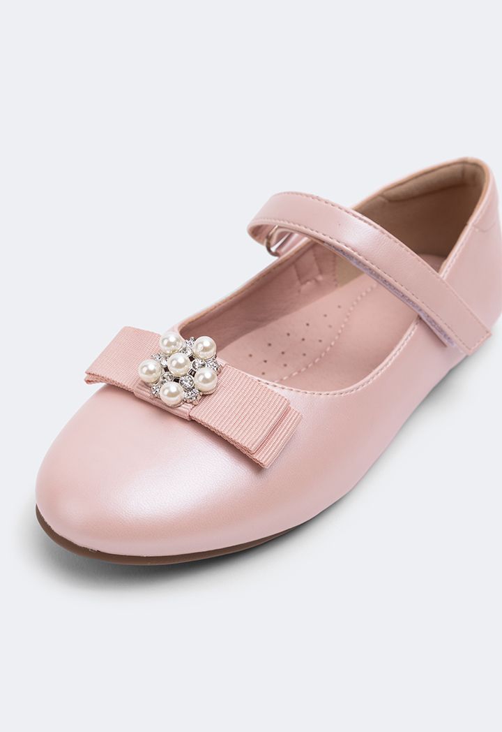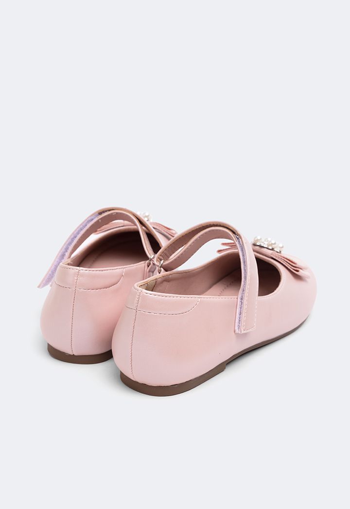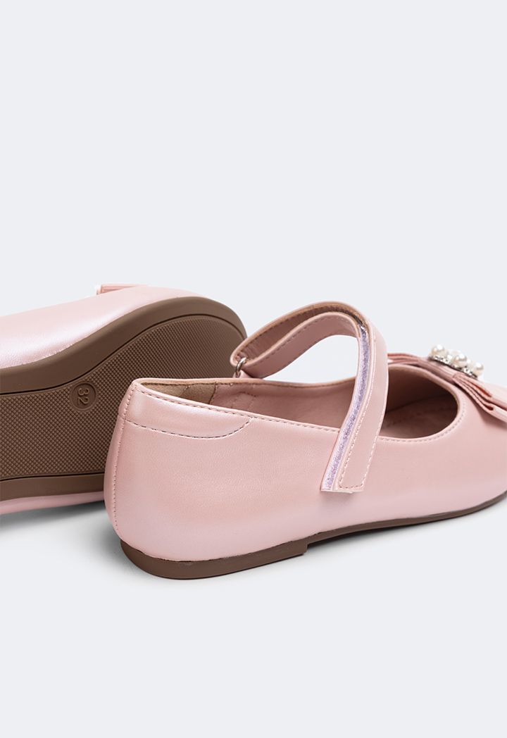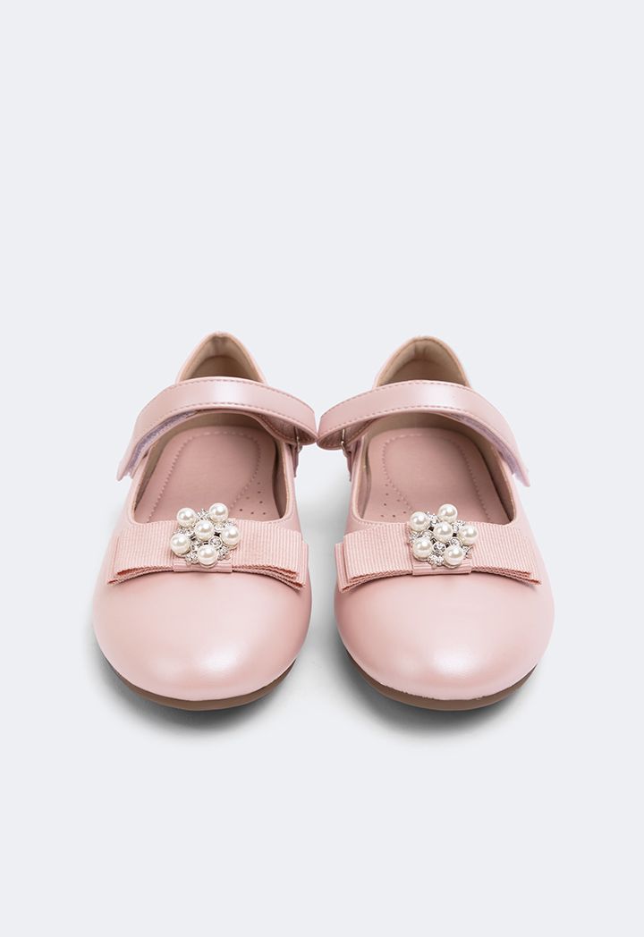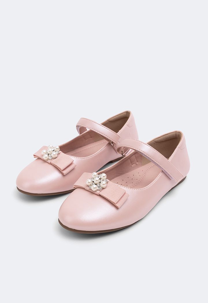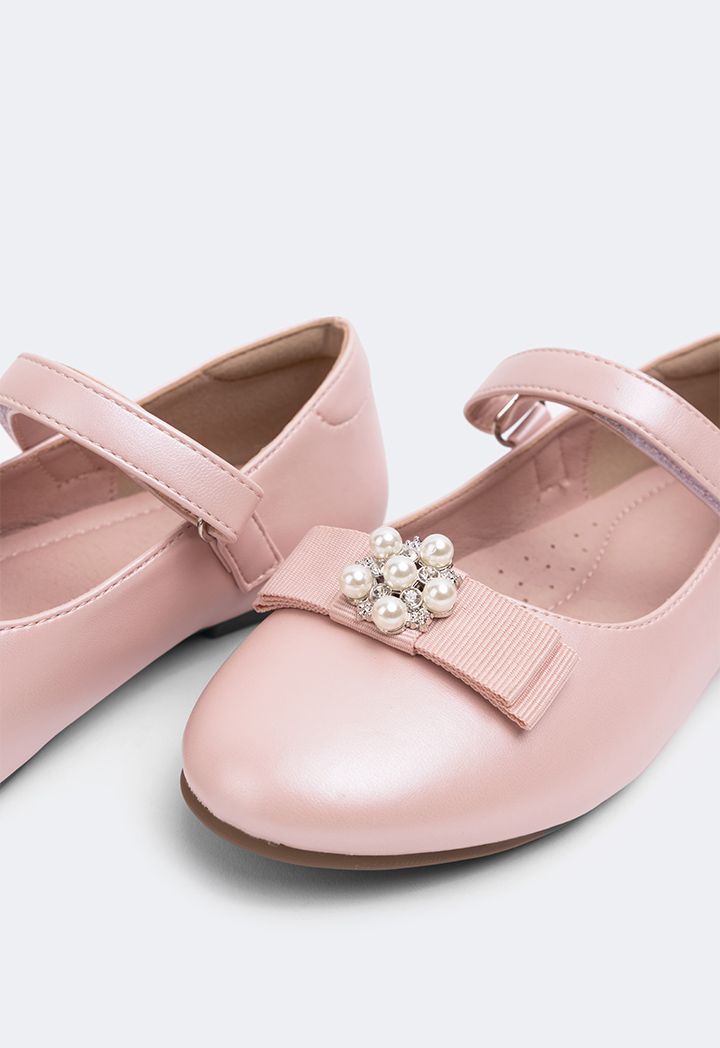 A sparkling pair of flat strap shoes that features a bow that is embellished with elegant crystals.