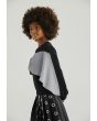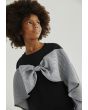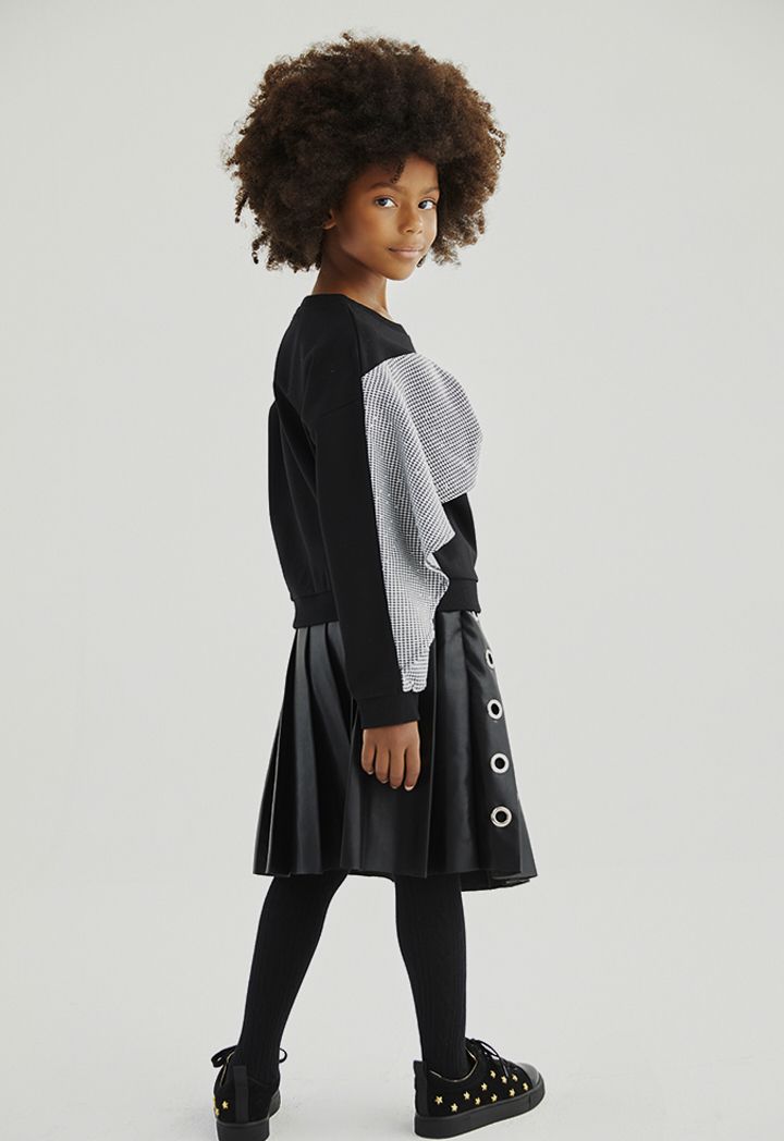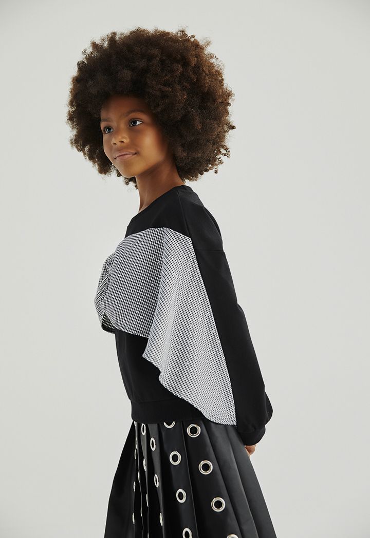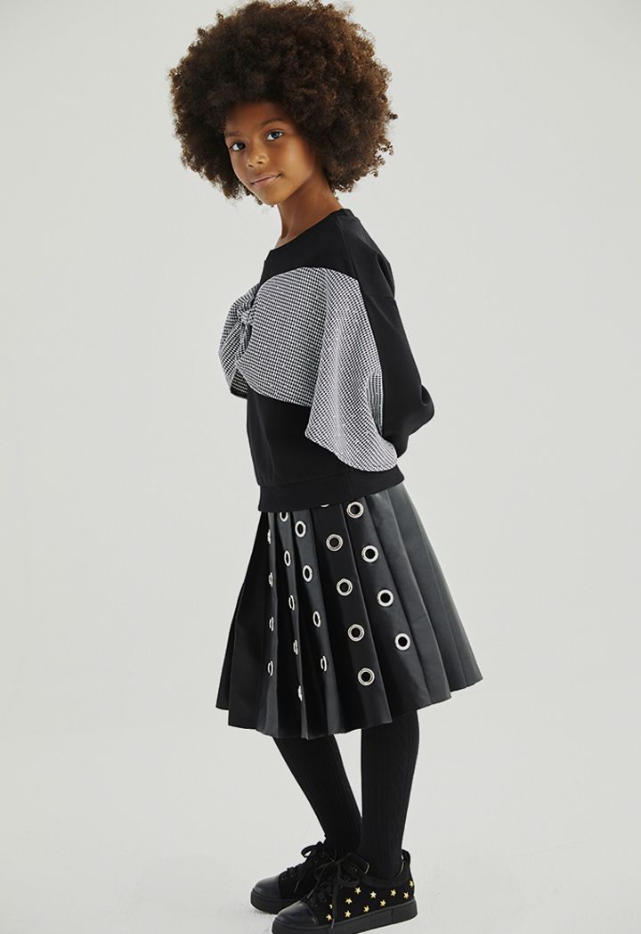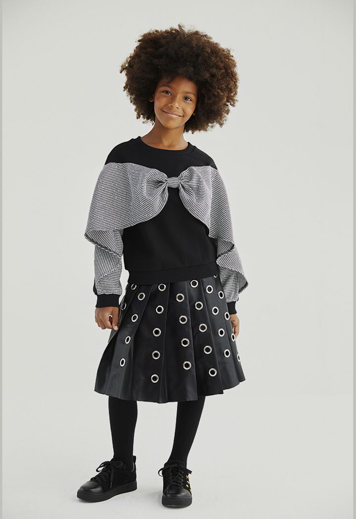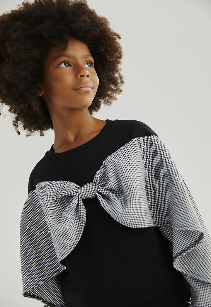 A modern sweater that features a dramatic houndstooth crystal embellished bow bodice and long sleeves.