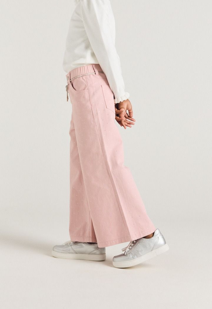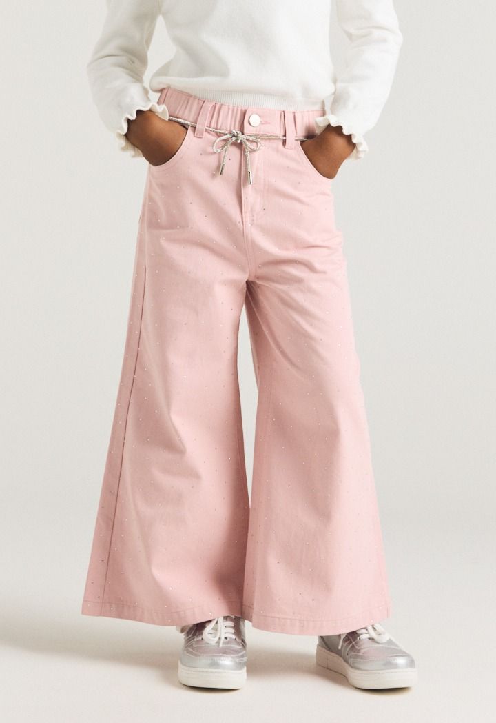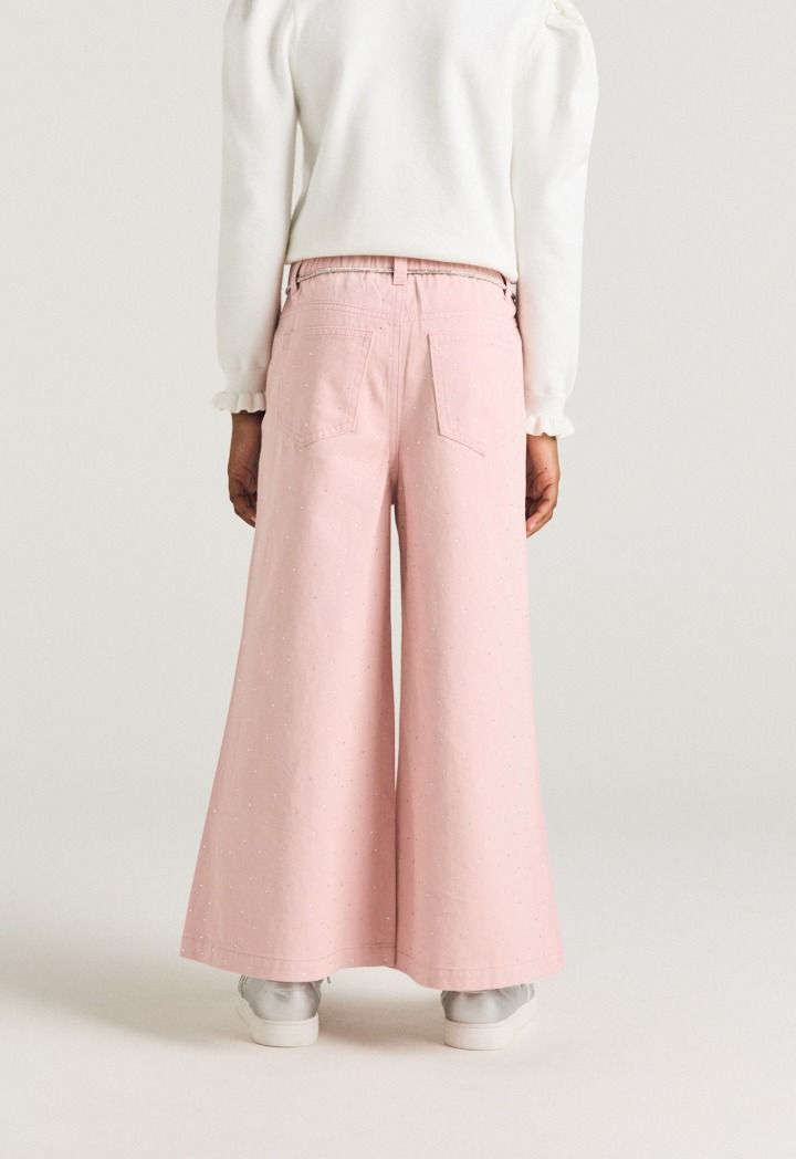 A unique pair of jeans that features a crystal embellished design.