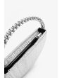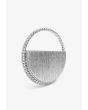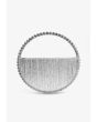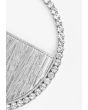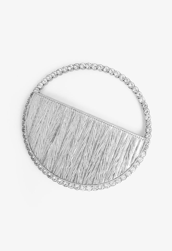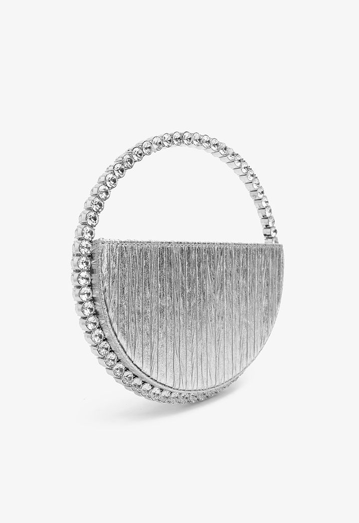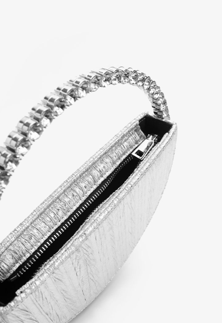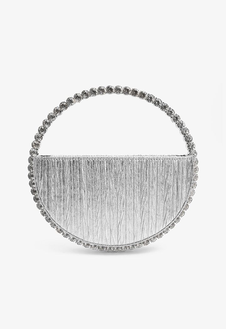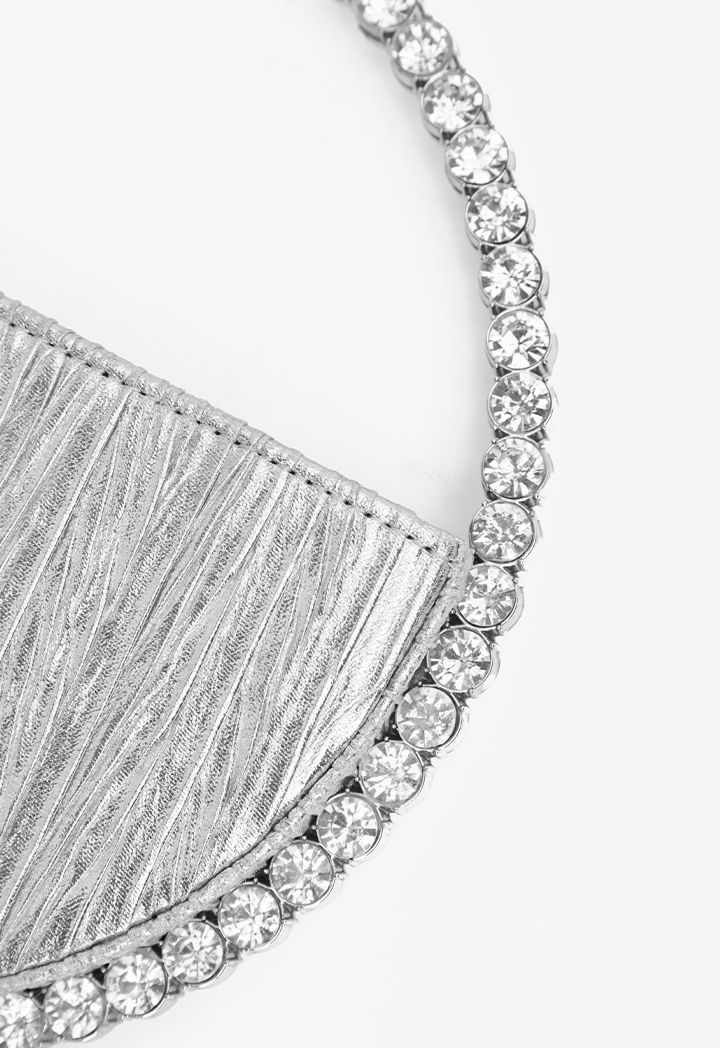 This half moon hand bag is sure to steal the lights of anywhere and everywhere that you go, with its crystal embellished all around handle and textured PU Leather.