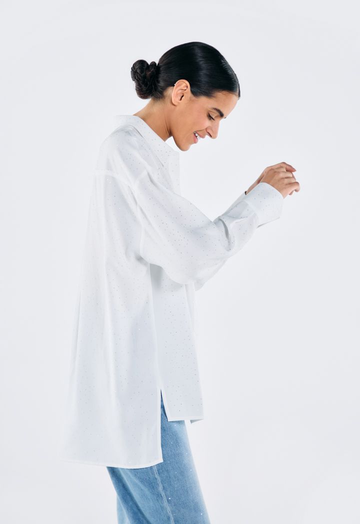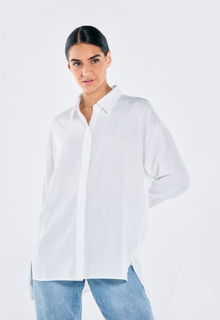 Design: Solid, Crystal Embellished, Patch Pockets, High-Low, Relaxed Fit