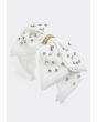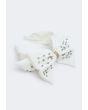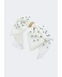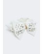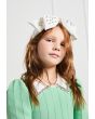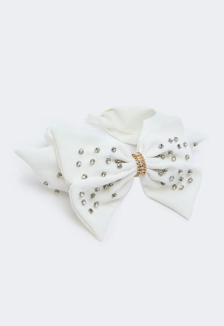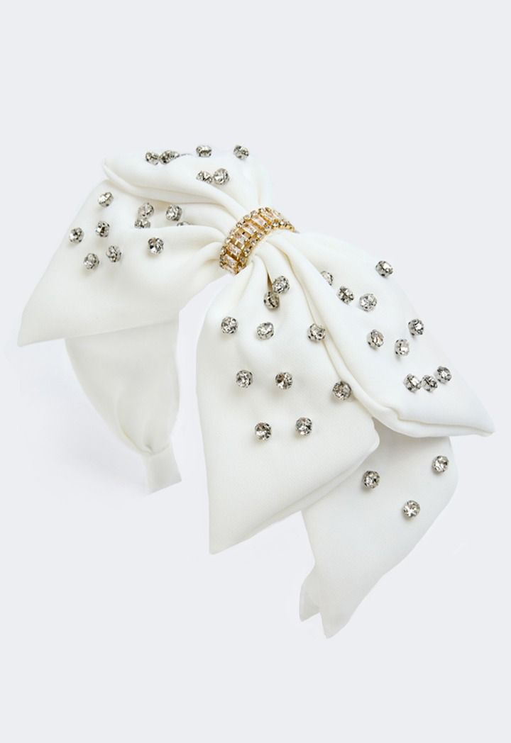 A hairband that features a crystal embellished bow with a knitted textured design.