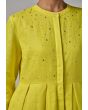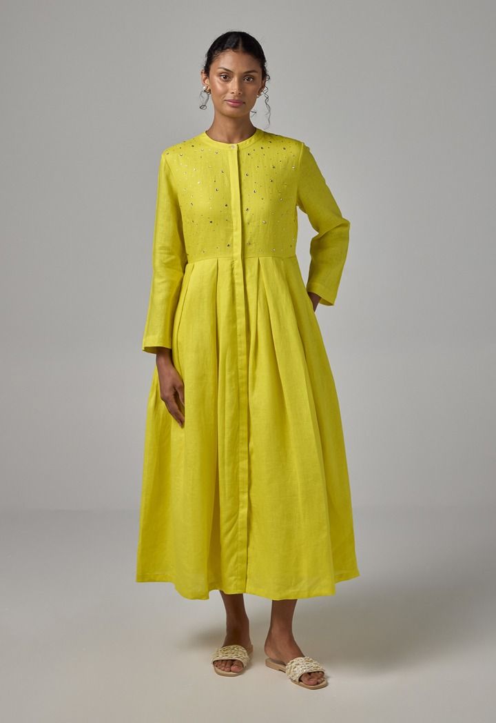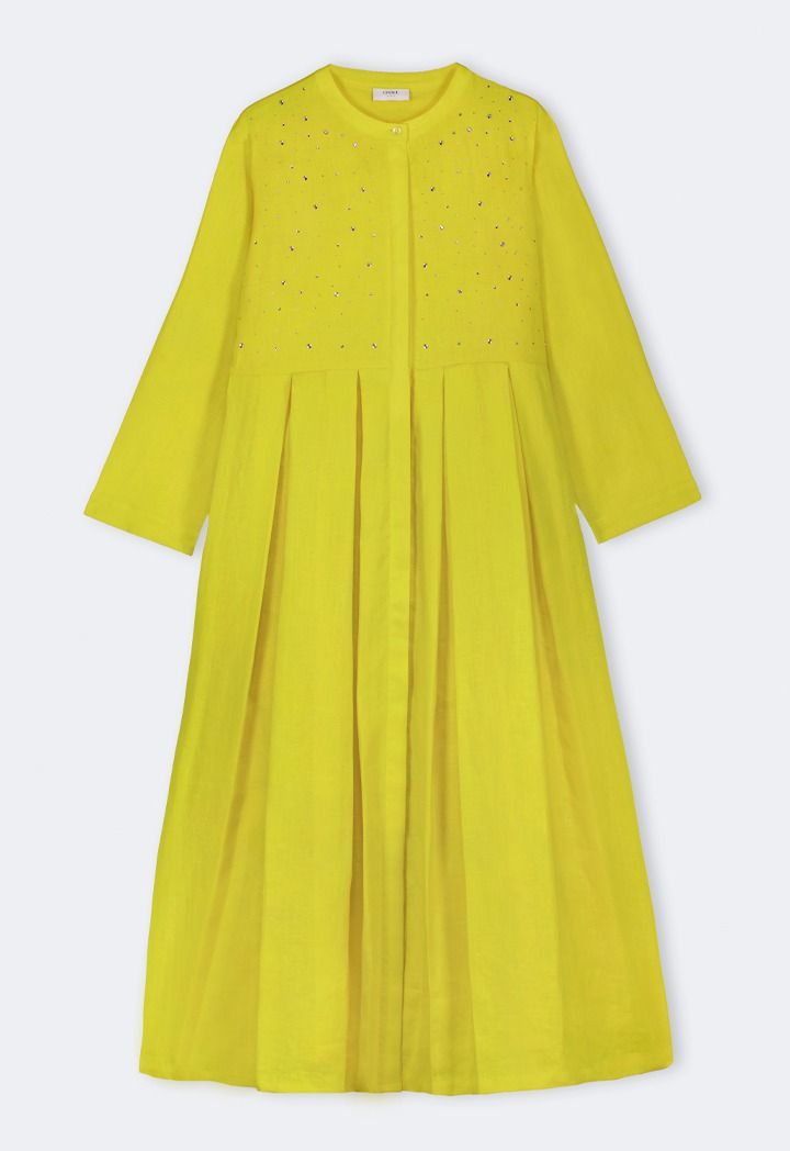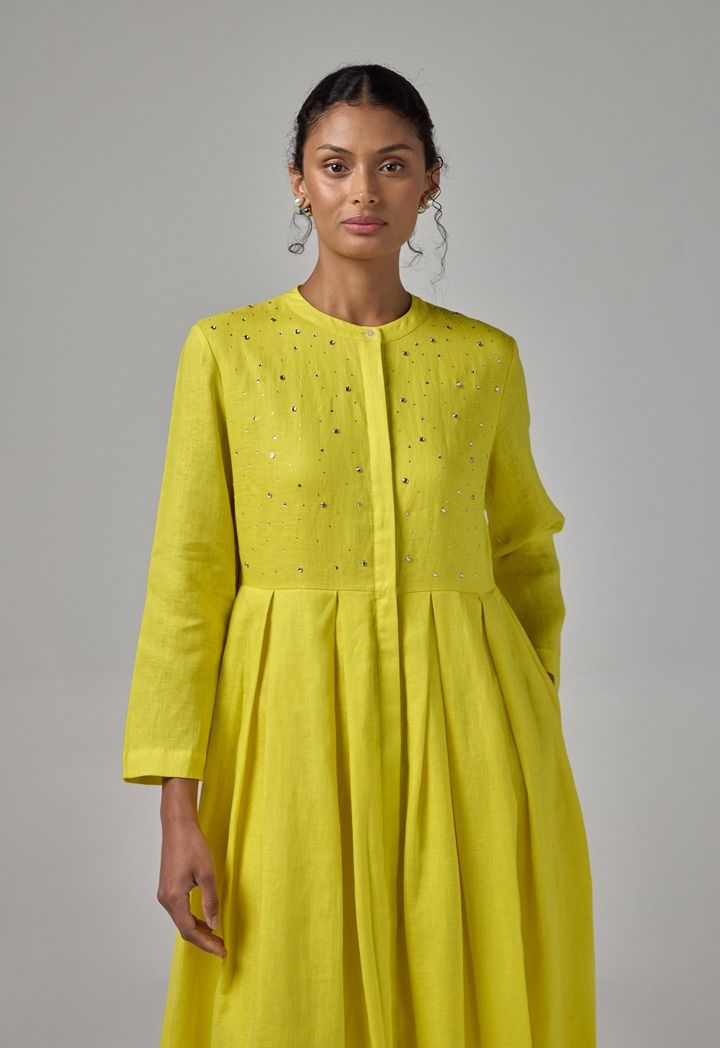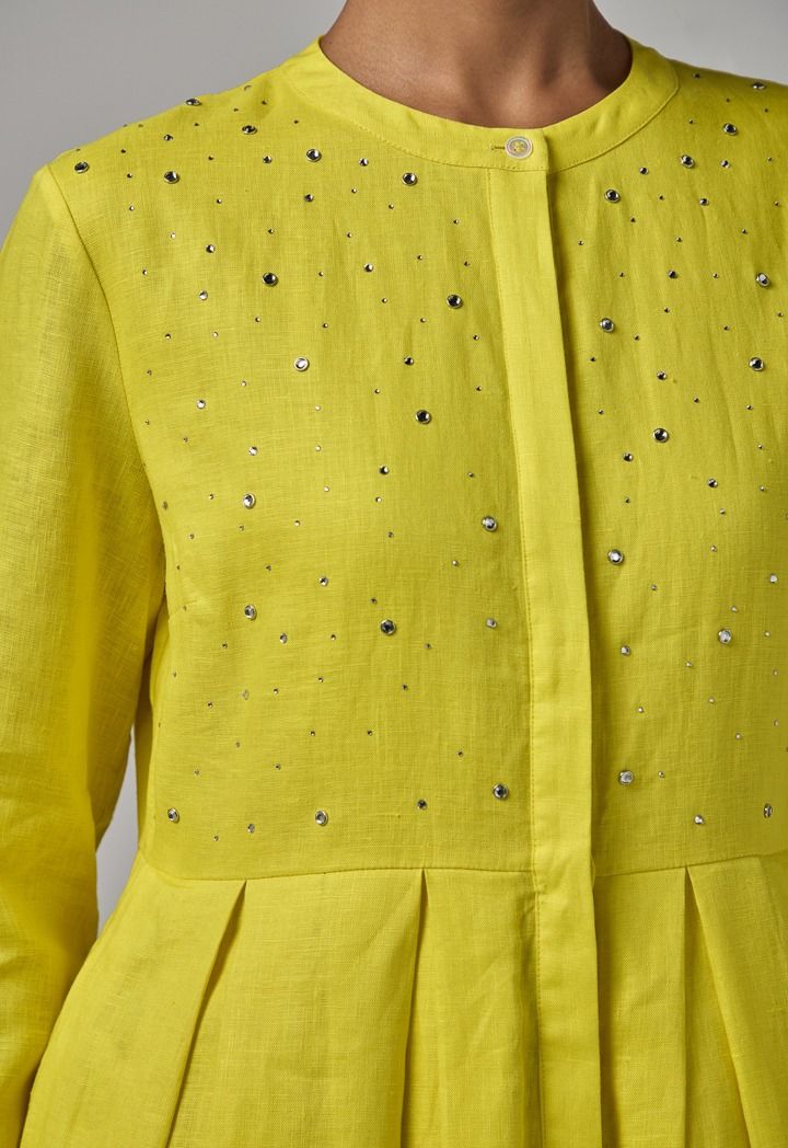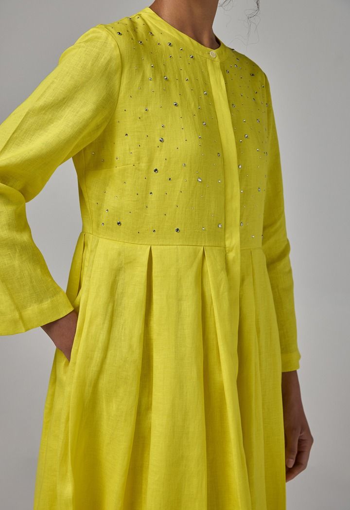 Design: Solid, Crystal Embellished, Attached Lining, Pockets, Flared, Pleated