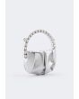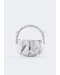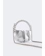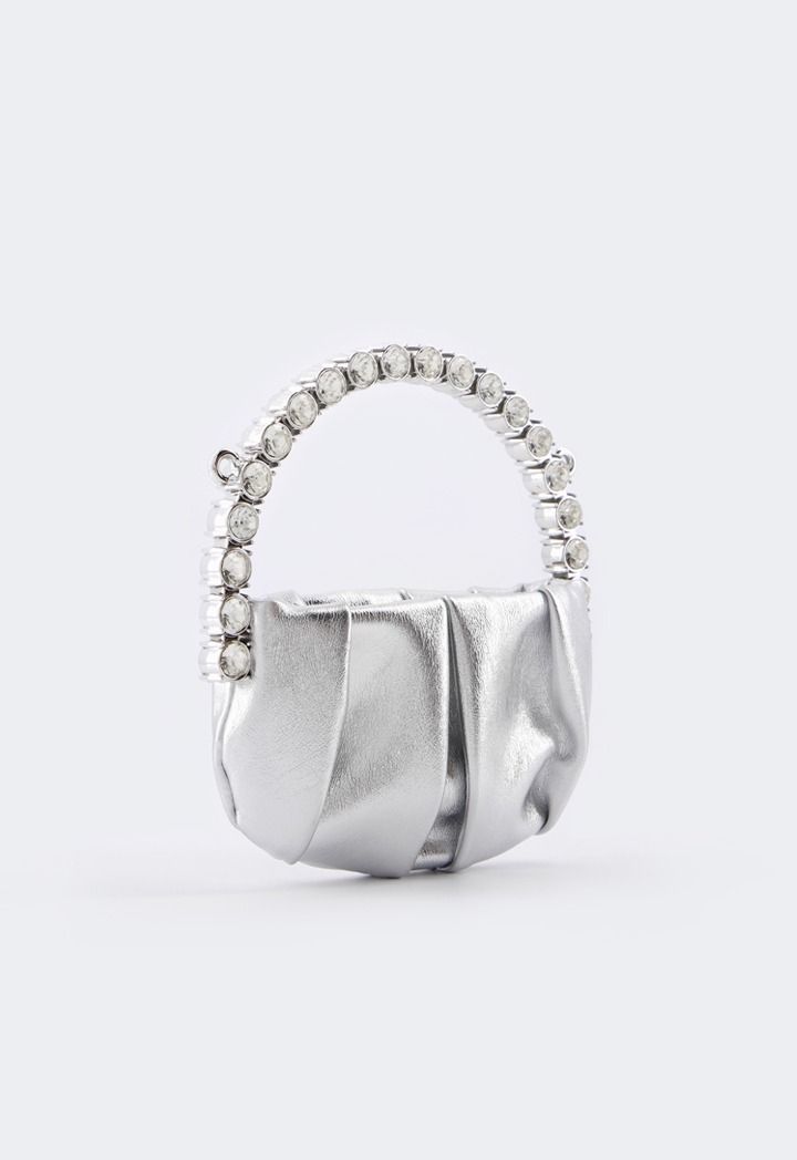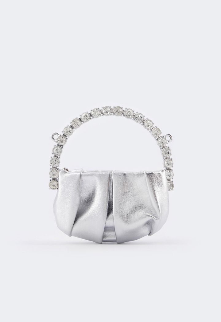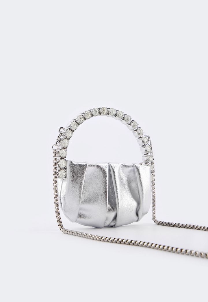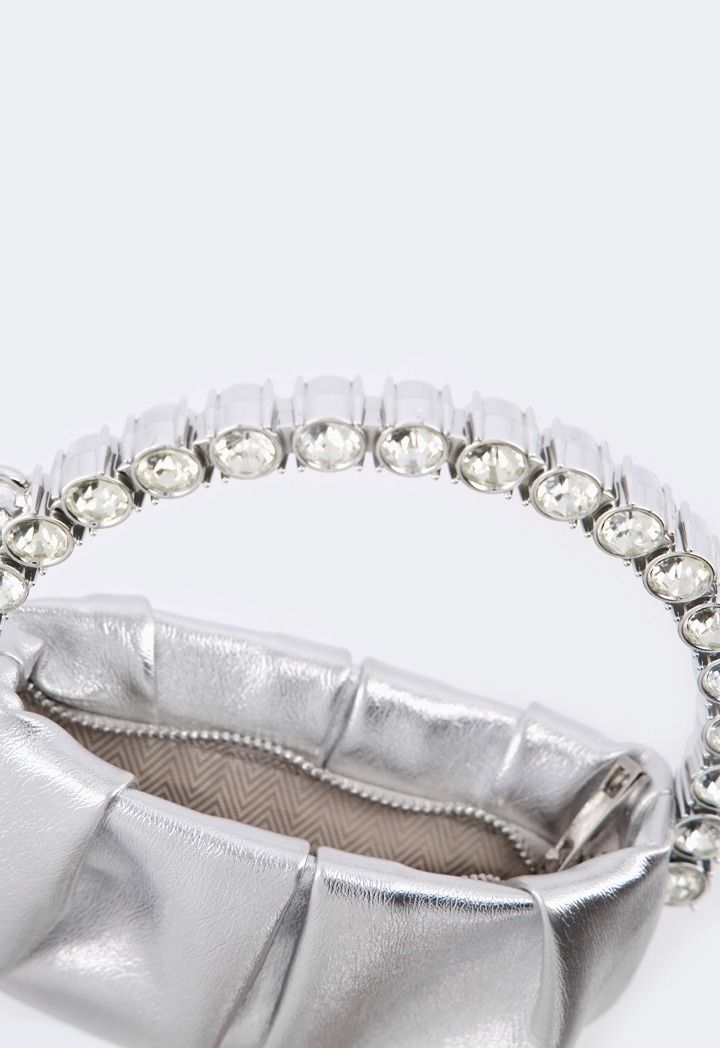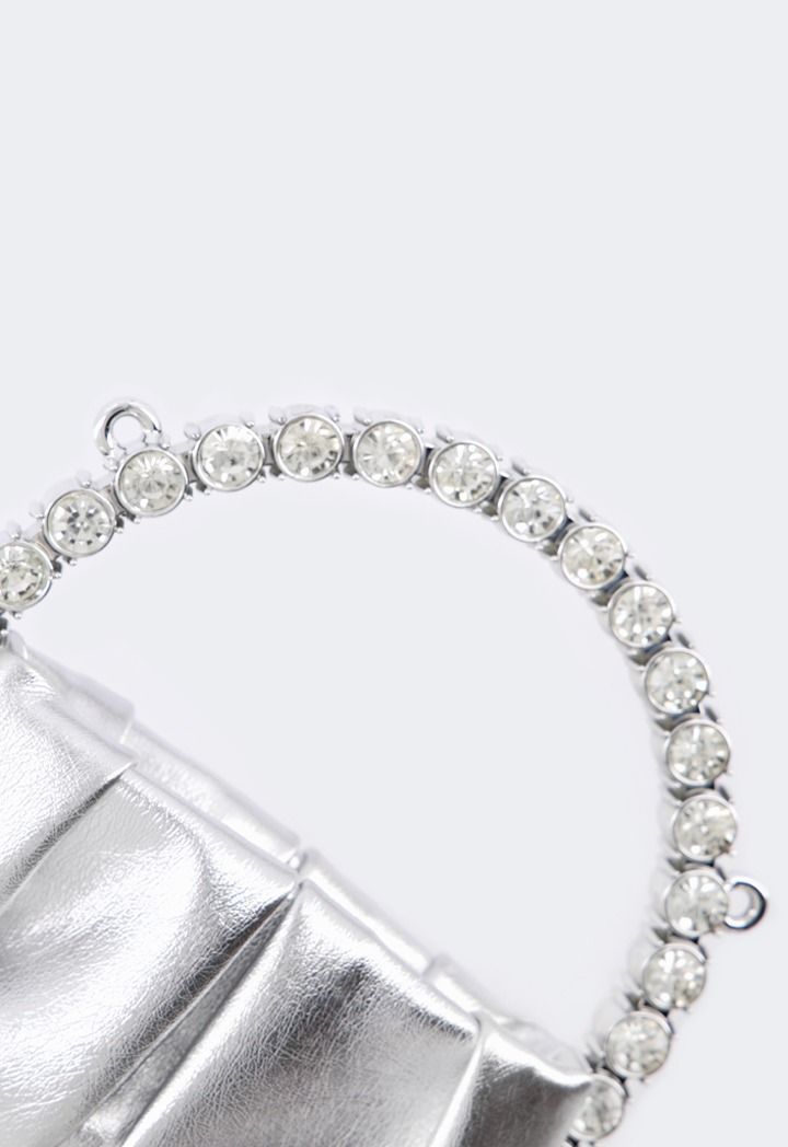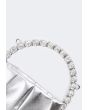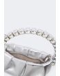 This half moon hand bag is sure to steal the lights of anywhere and everywhere that you go, with its crystal embellished all around handle and textured PU Leather.