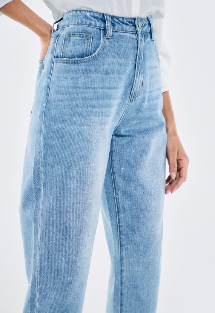 Design: Denim, High Waist, Solid, Crystal Embellished, Mom Fit, Side and Back Pockets