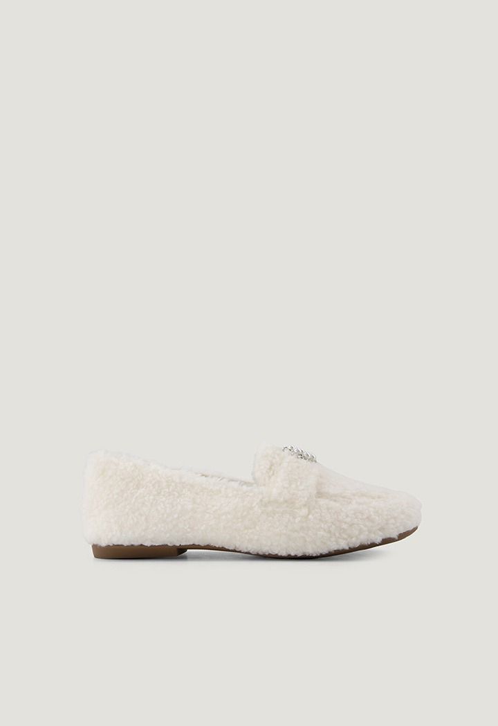 A stylish pair of loafers with a faux fur design, embellished with crystals and Faux pearls.
