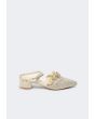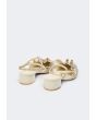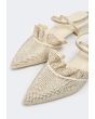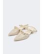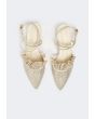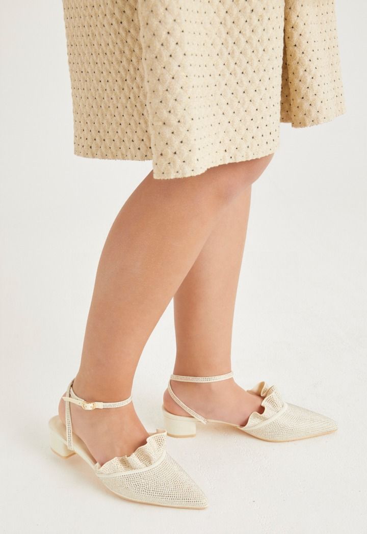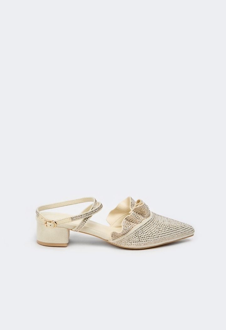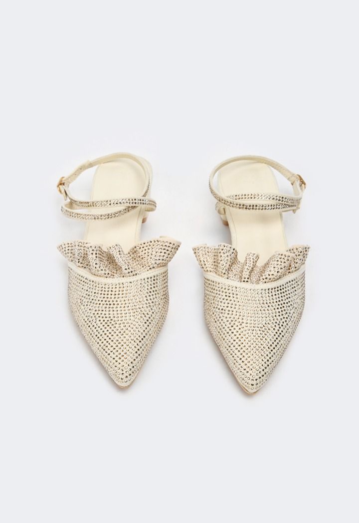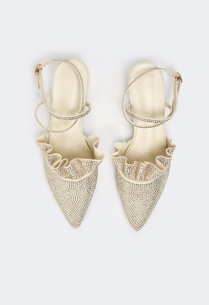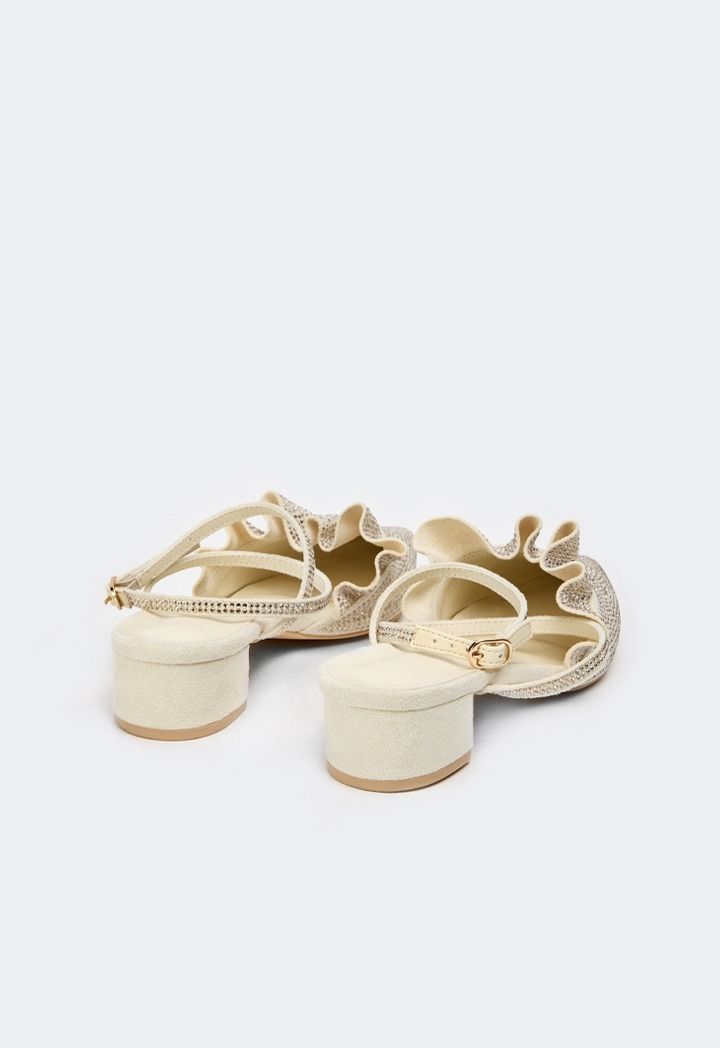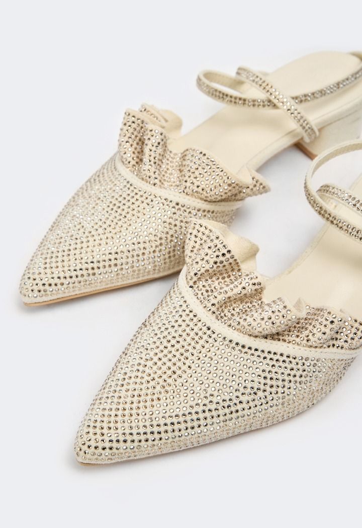 A luxurious pair of heeled mules that feature a crystal embellished ruffled design.