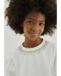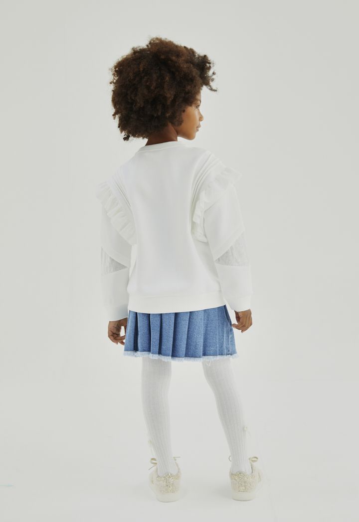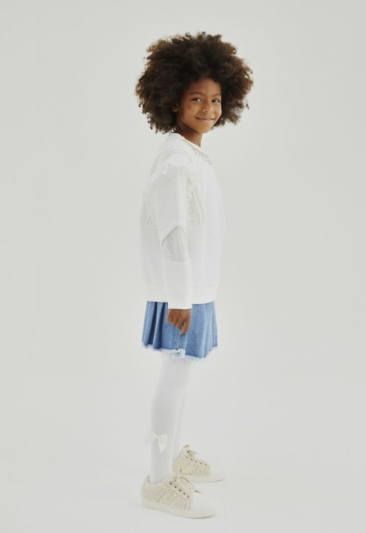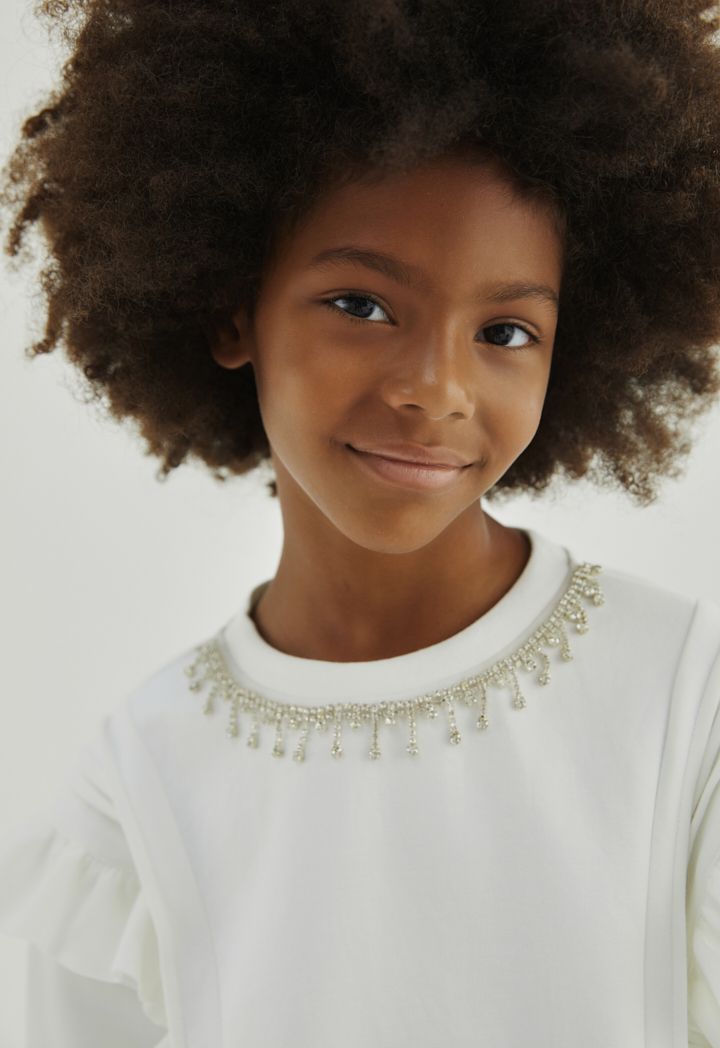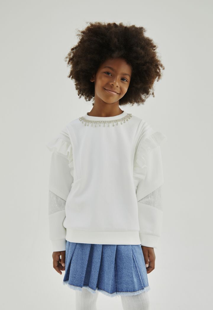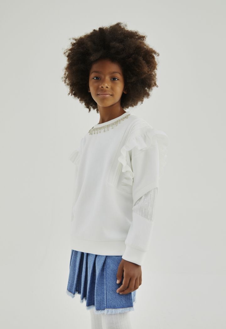 A knitted sweater for the cold winter night with a crystal embellished ruffled design.