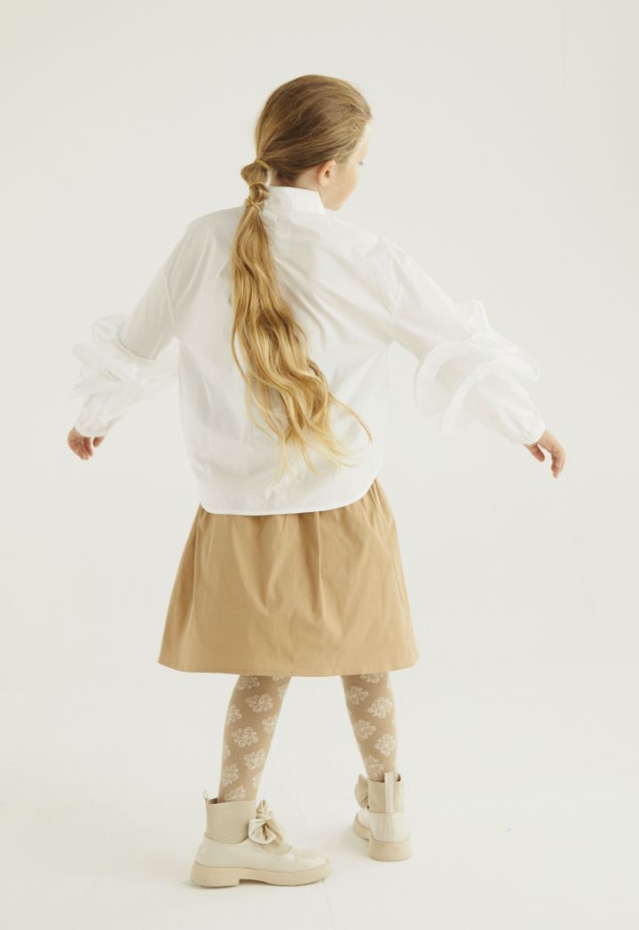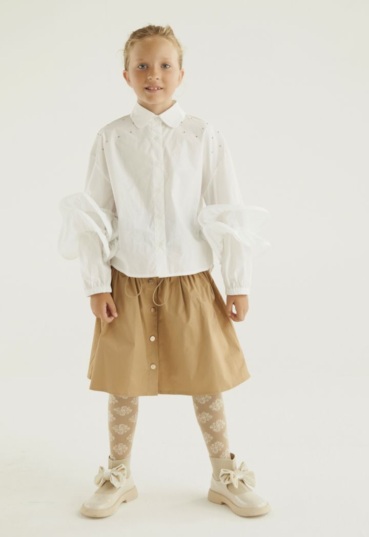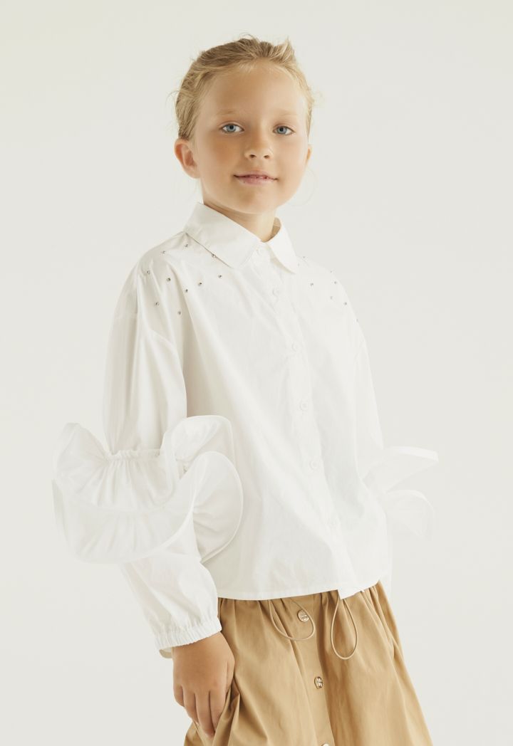 A crystal embellished shirt that features front buttons and ruffled long sleeves.