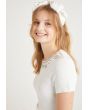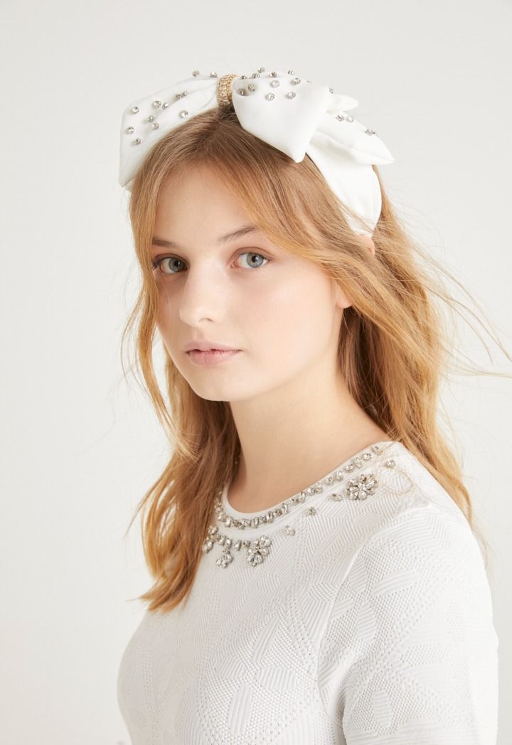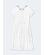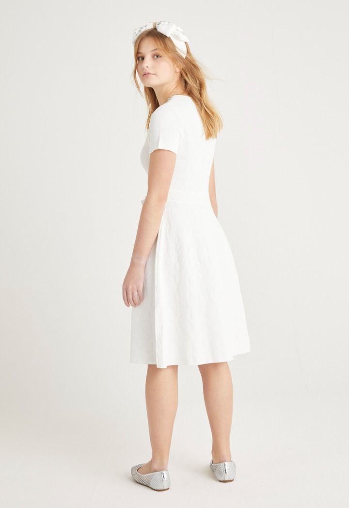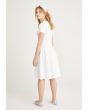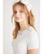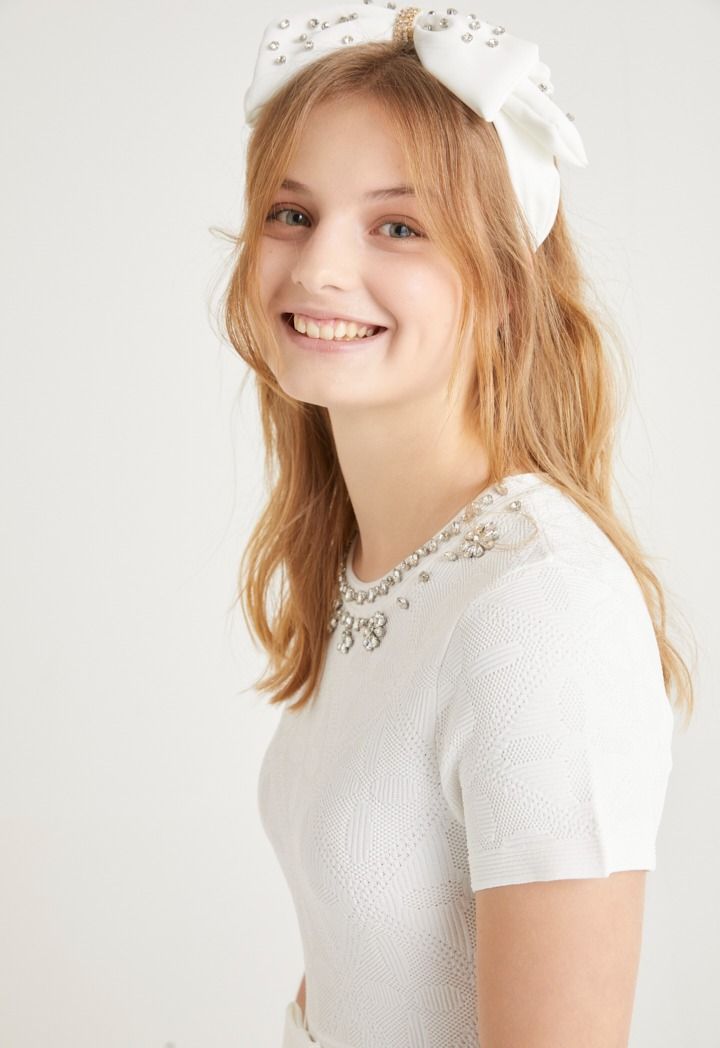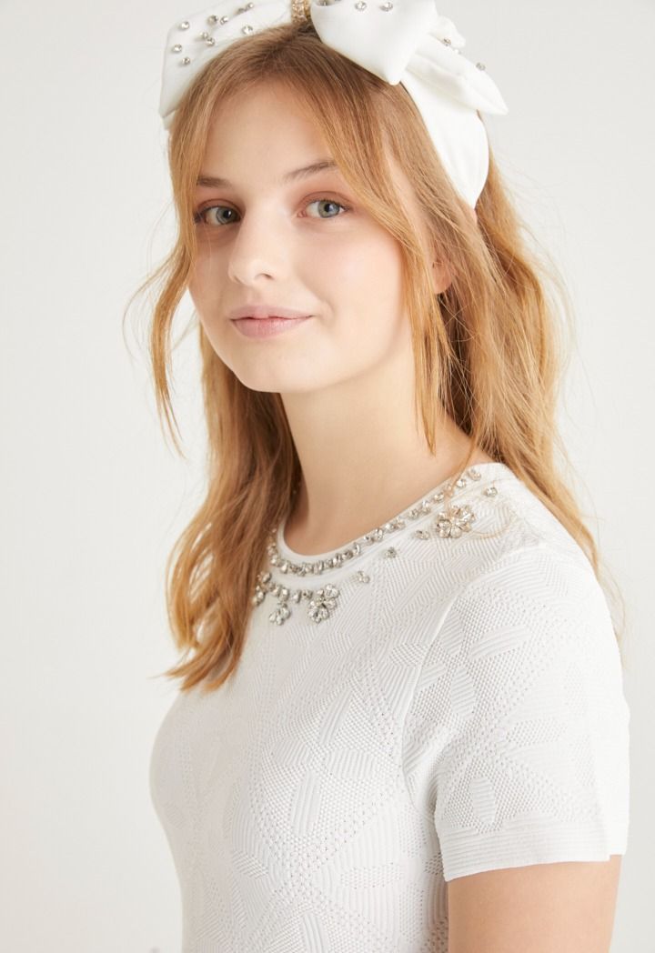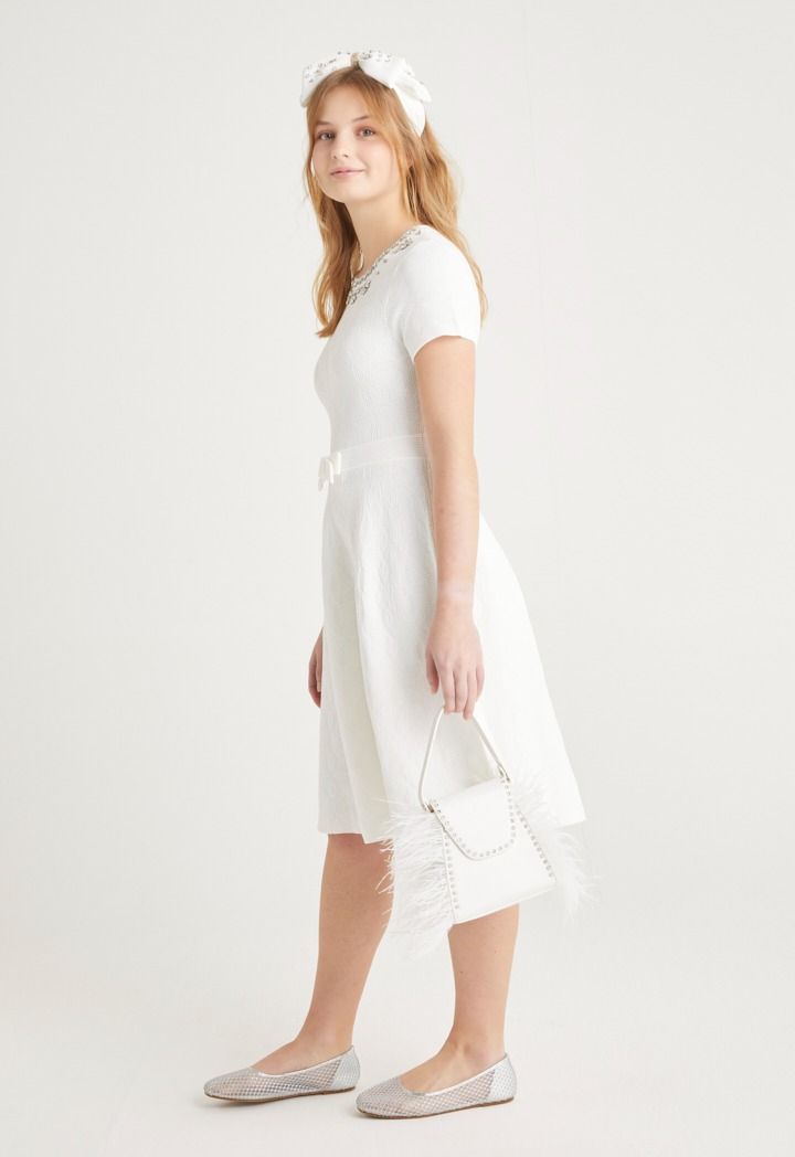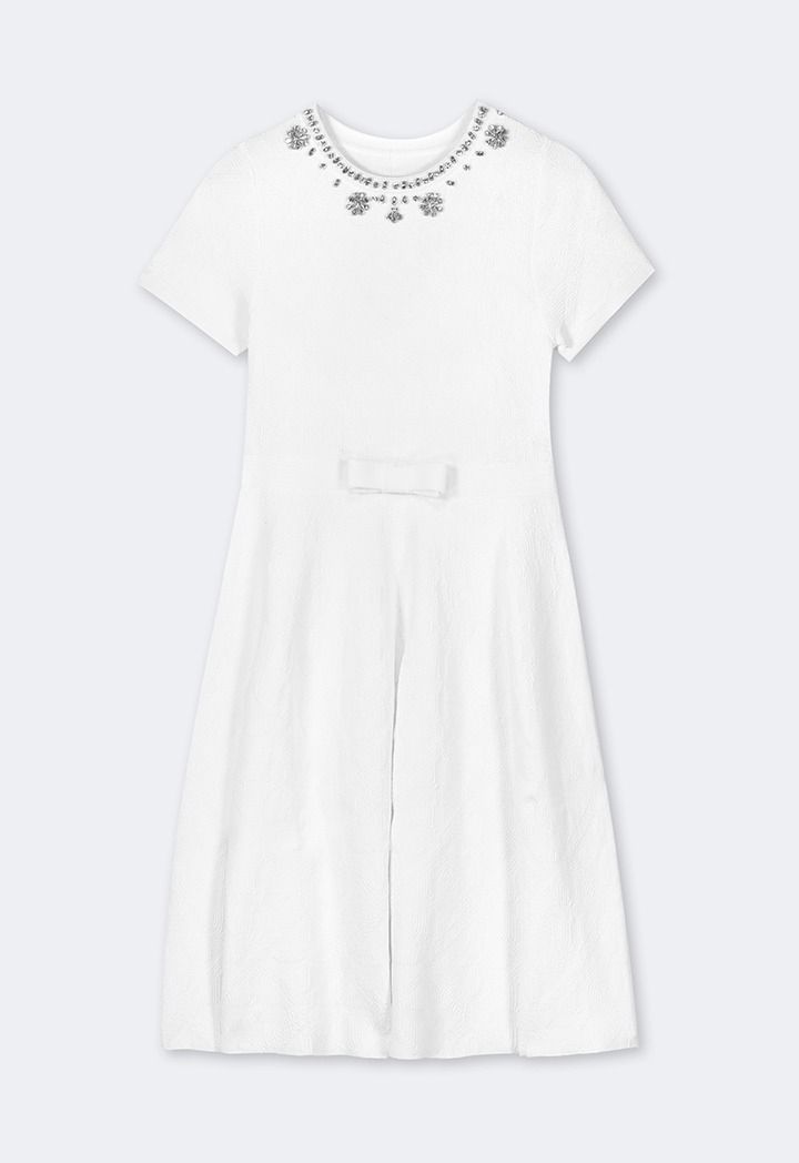 Solid knitted dress with short sleeves and a crystal crew neck.
