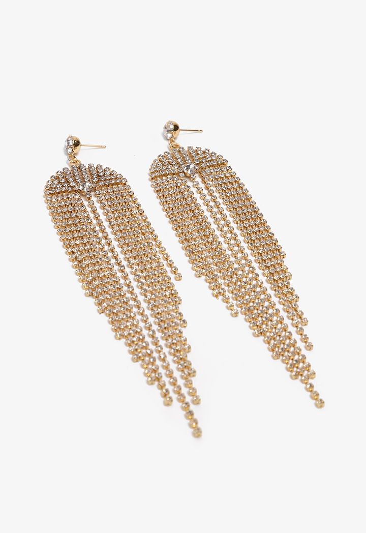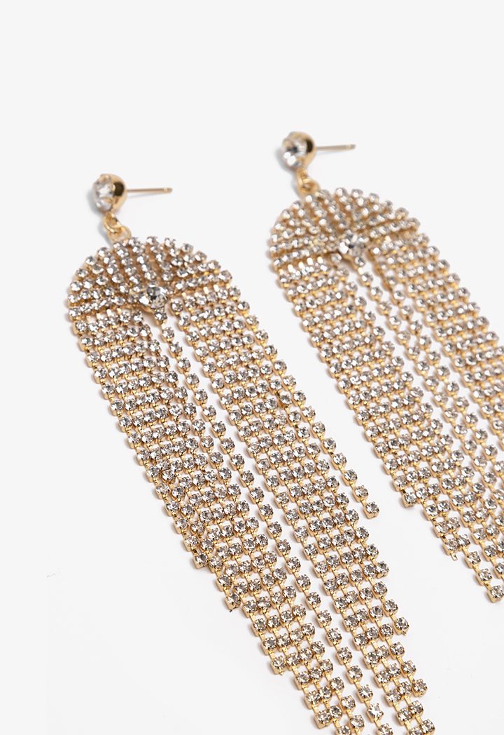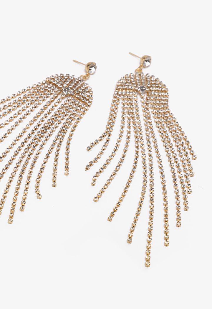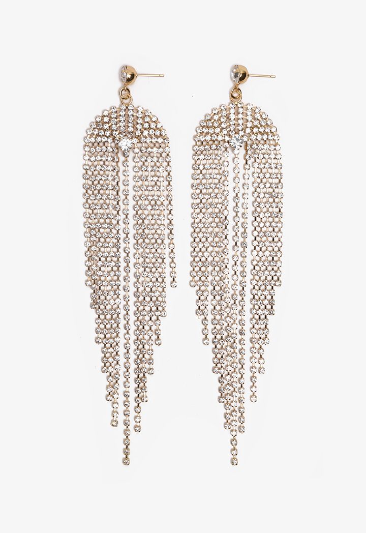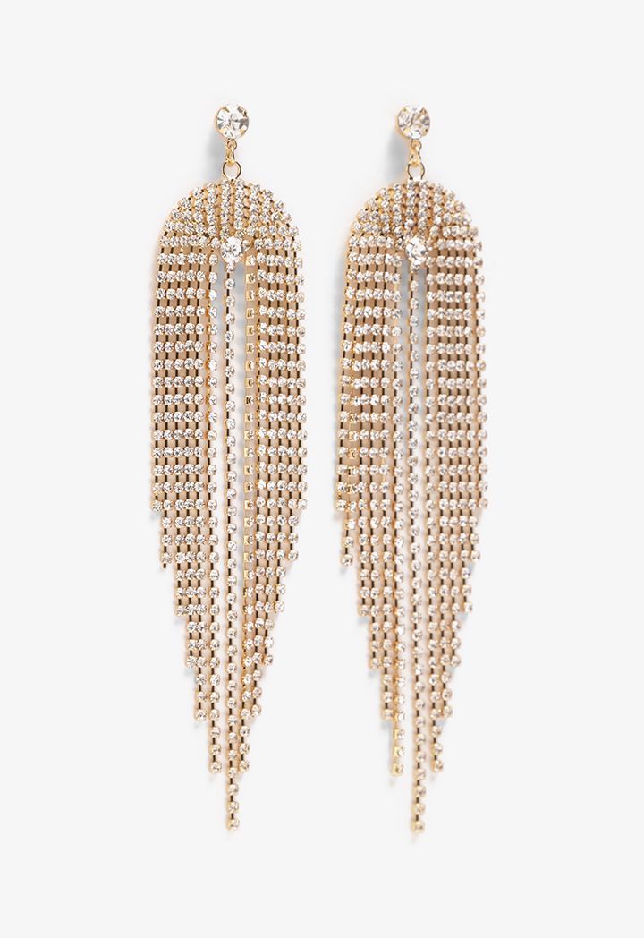 Invest in this pair of earrings that feature a crystal embellished tussles design and pin closure.