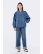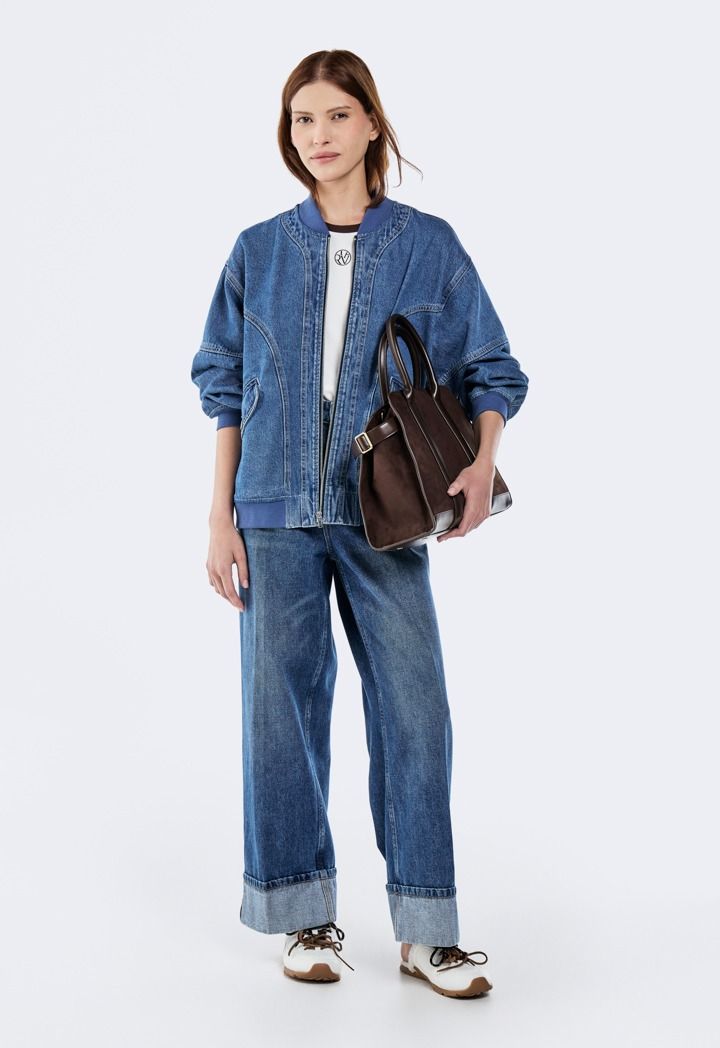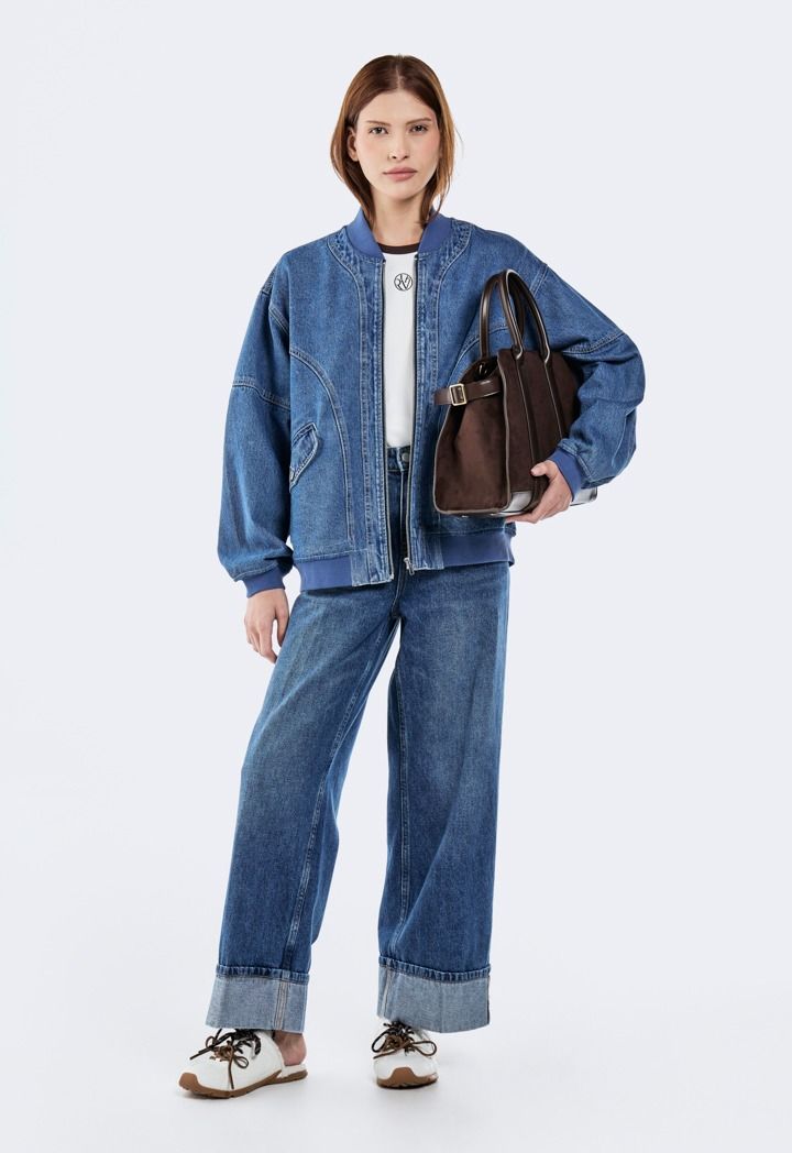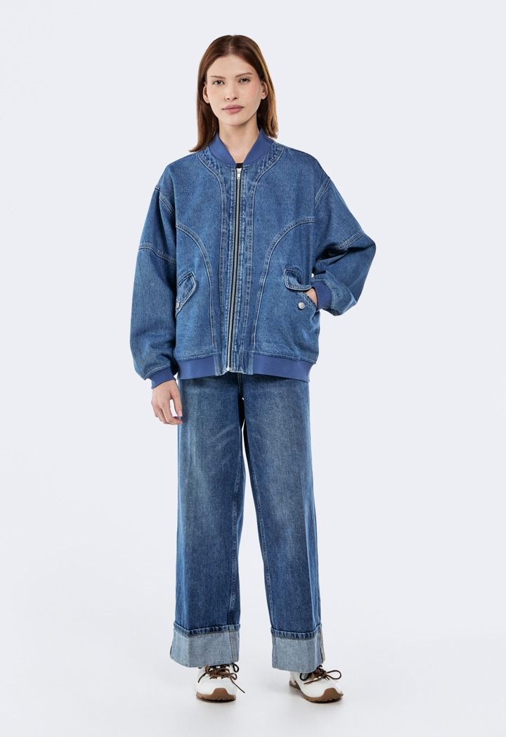 Make a statement without saying a word. This denim bomber jacket turns casual into iconic with every wear.