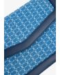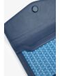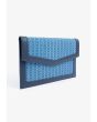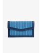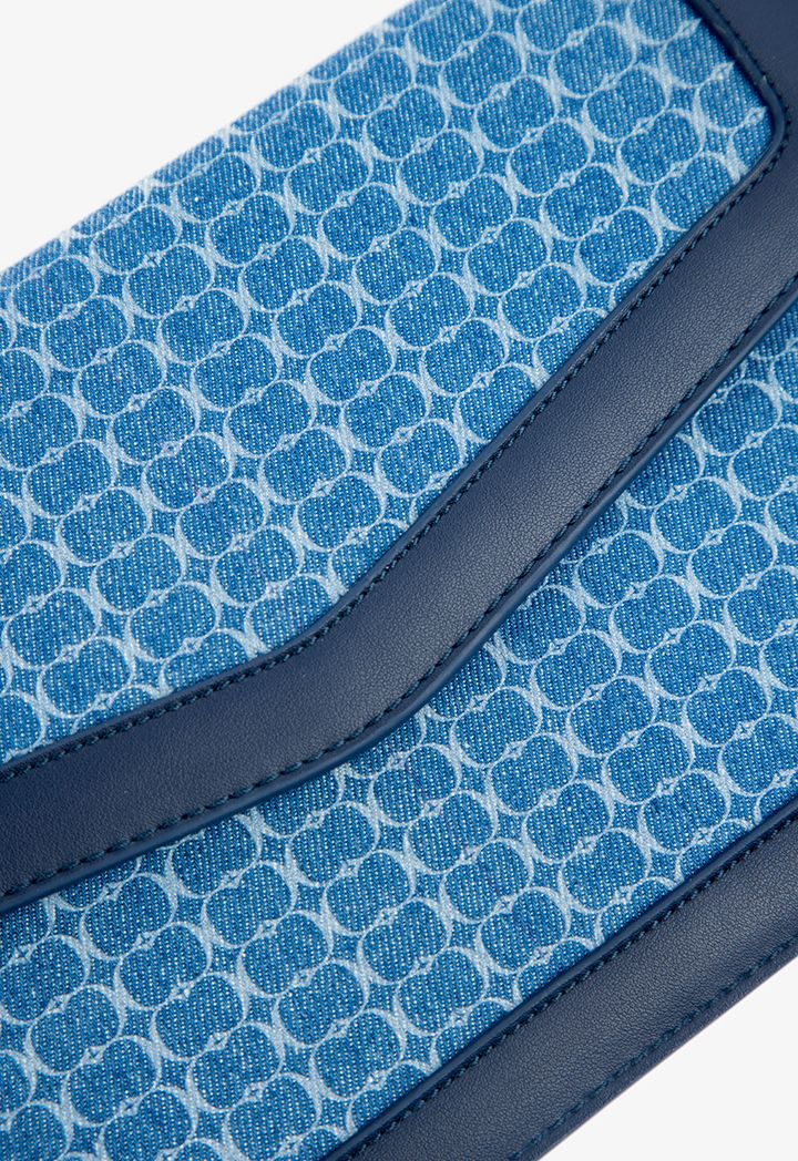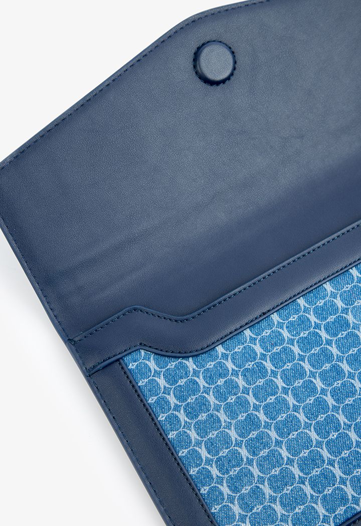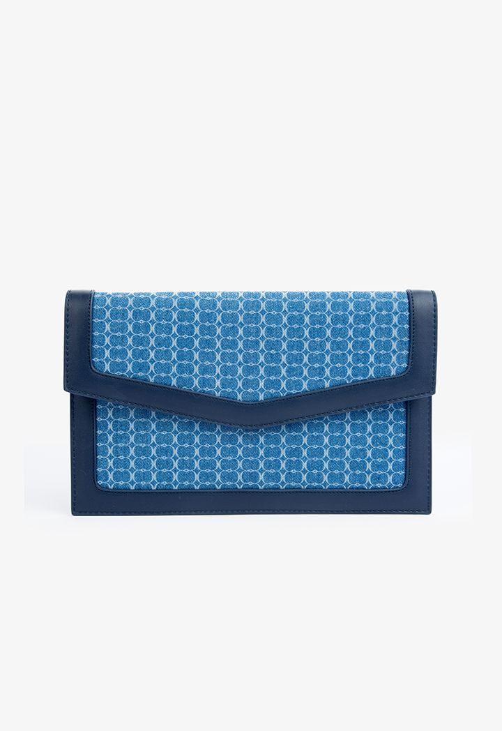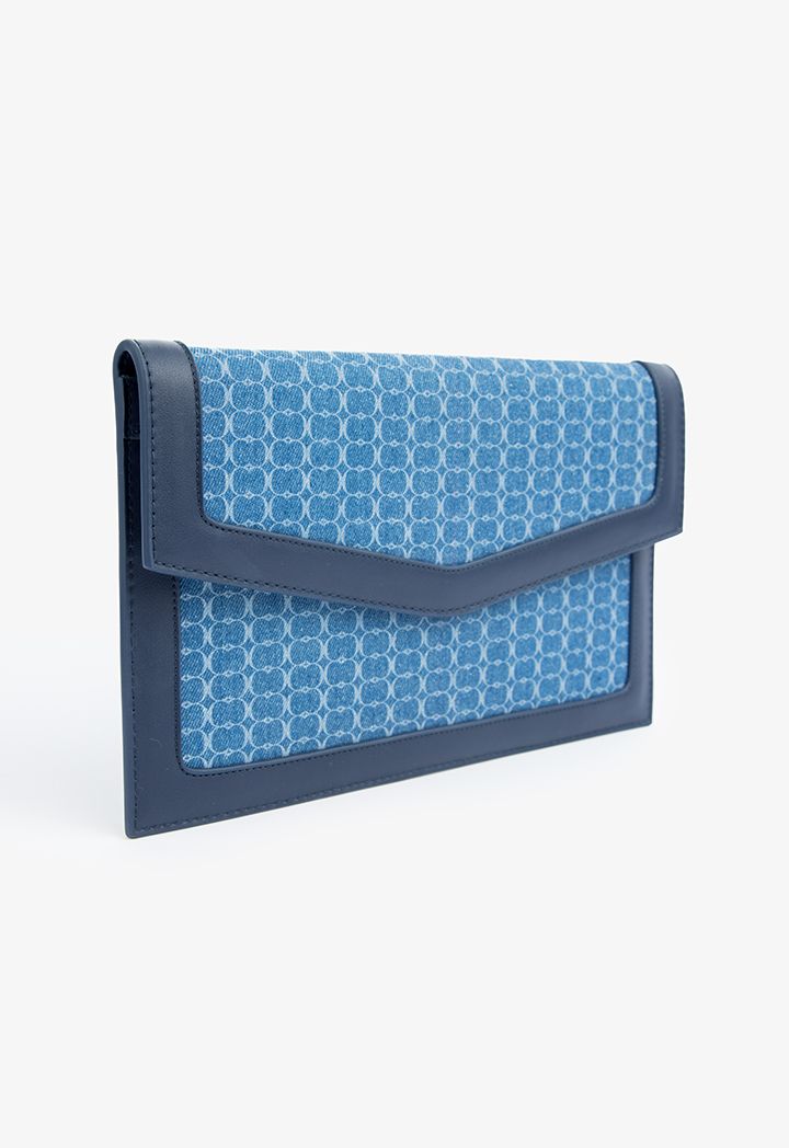 A modern approach to clutch bags, featuring an artistic denim monogram print and an envelope design.