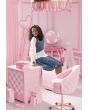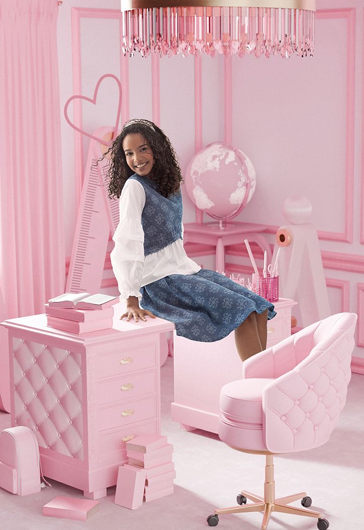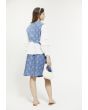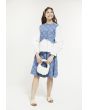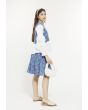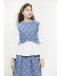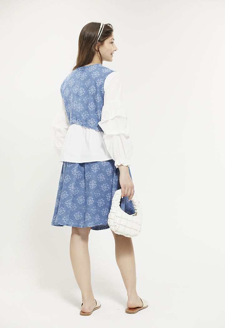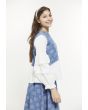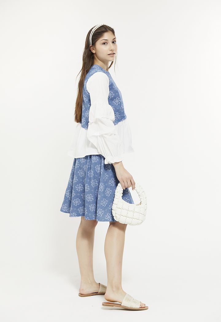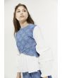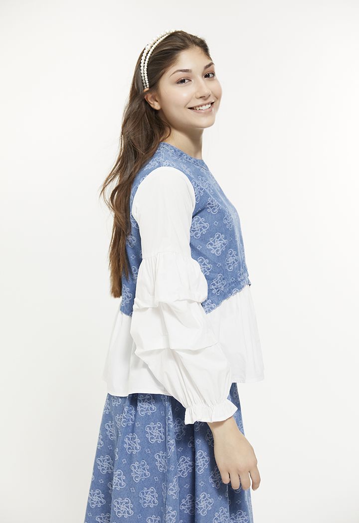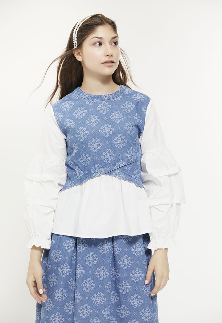 A modern blouse that features a denim monogram design and long puff sleeves.