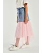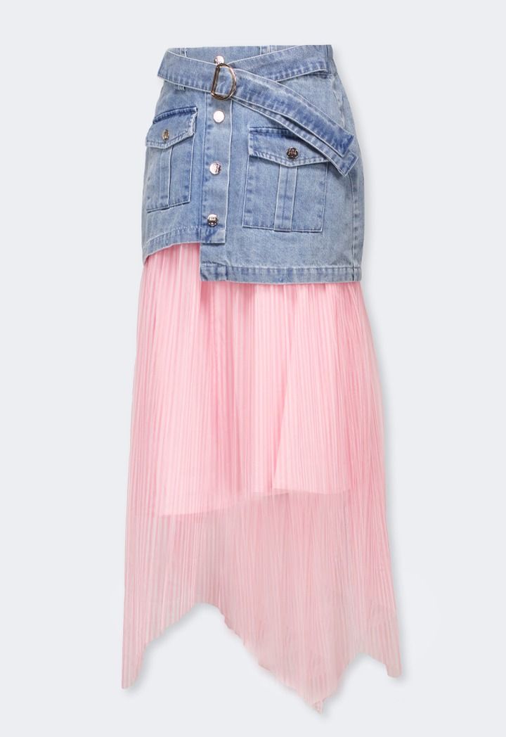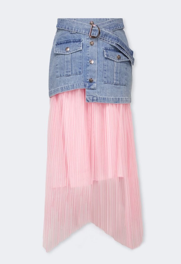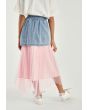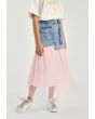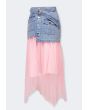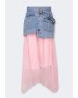 A modern skirt that features a buttoned denim waist and a striped mesh skirt.