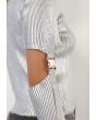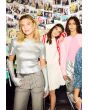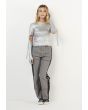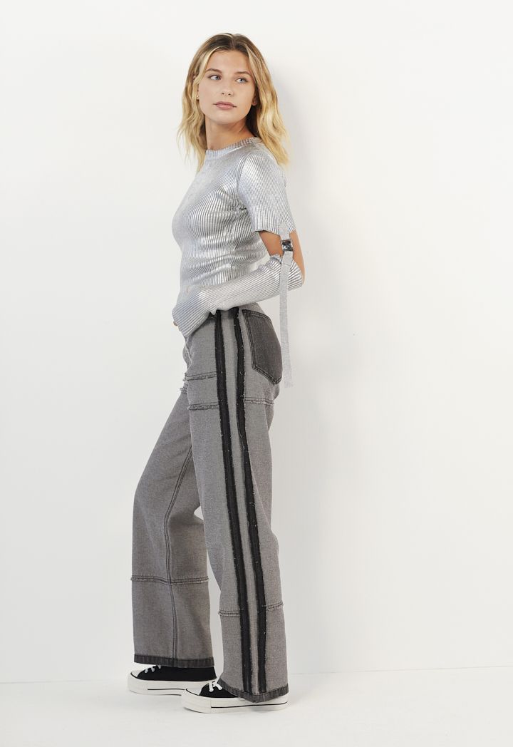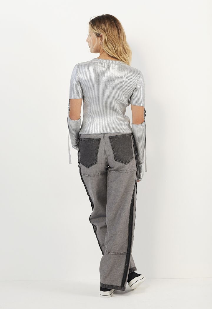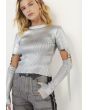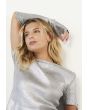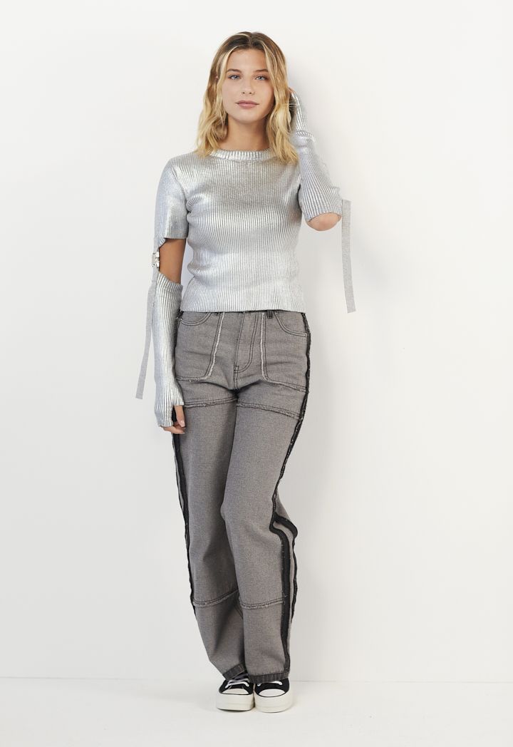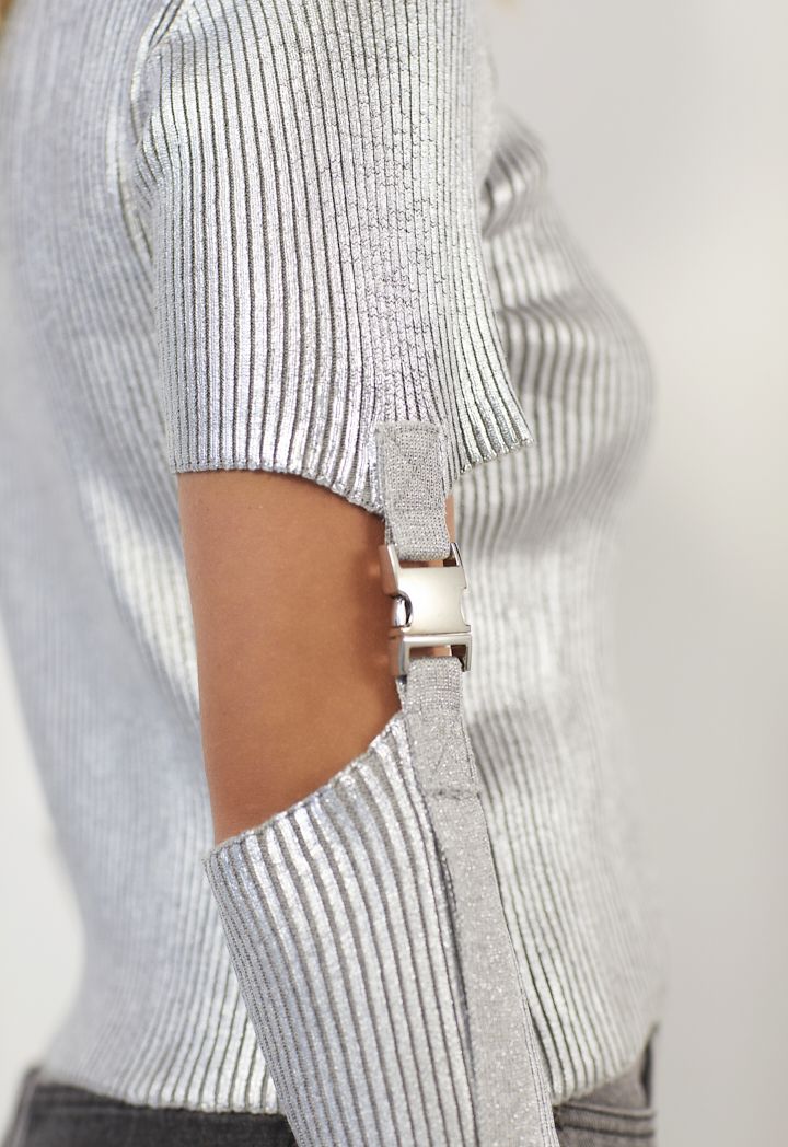 An alluring ribbed metallic t shirt that features a detachable cut off sleeves .