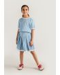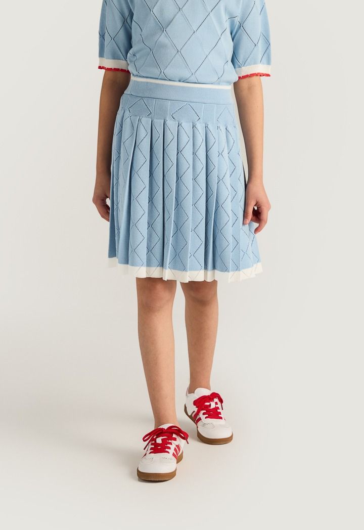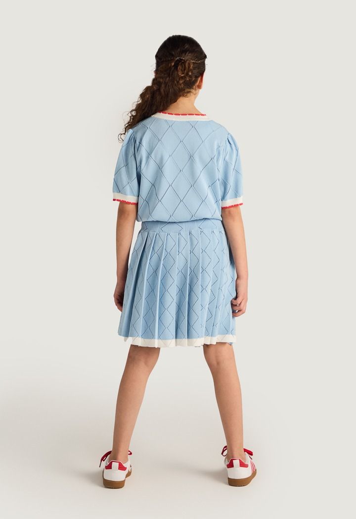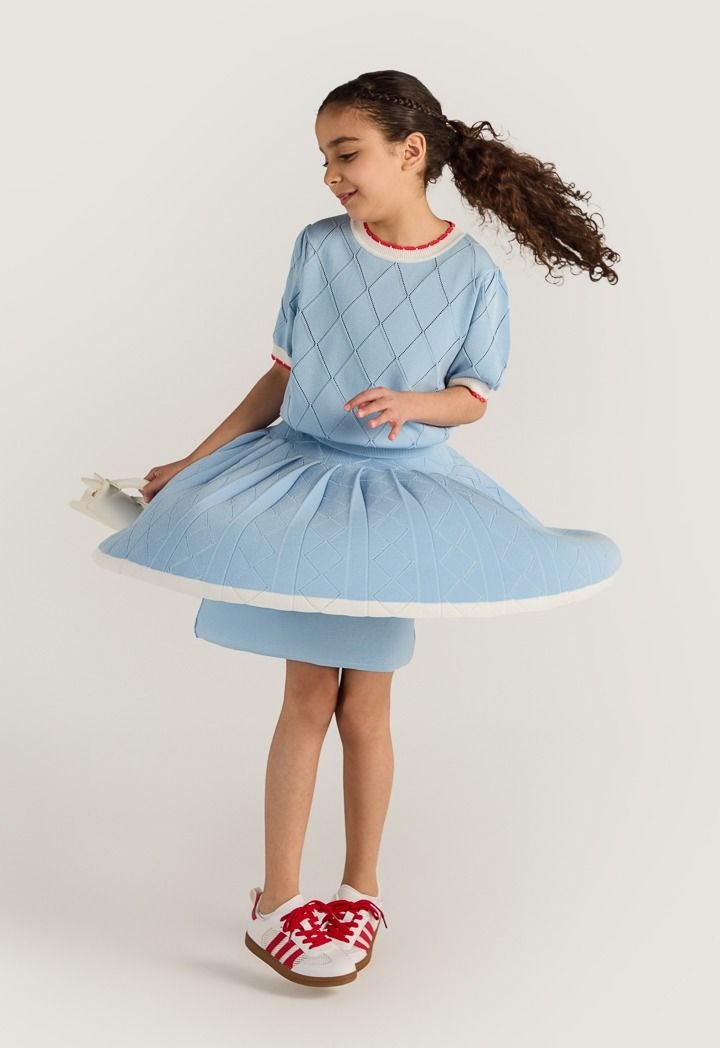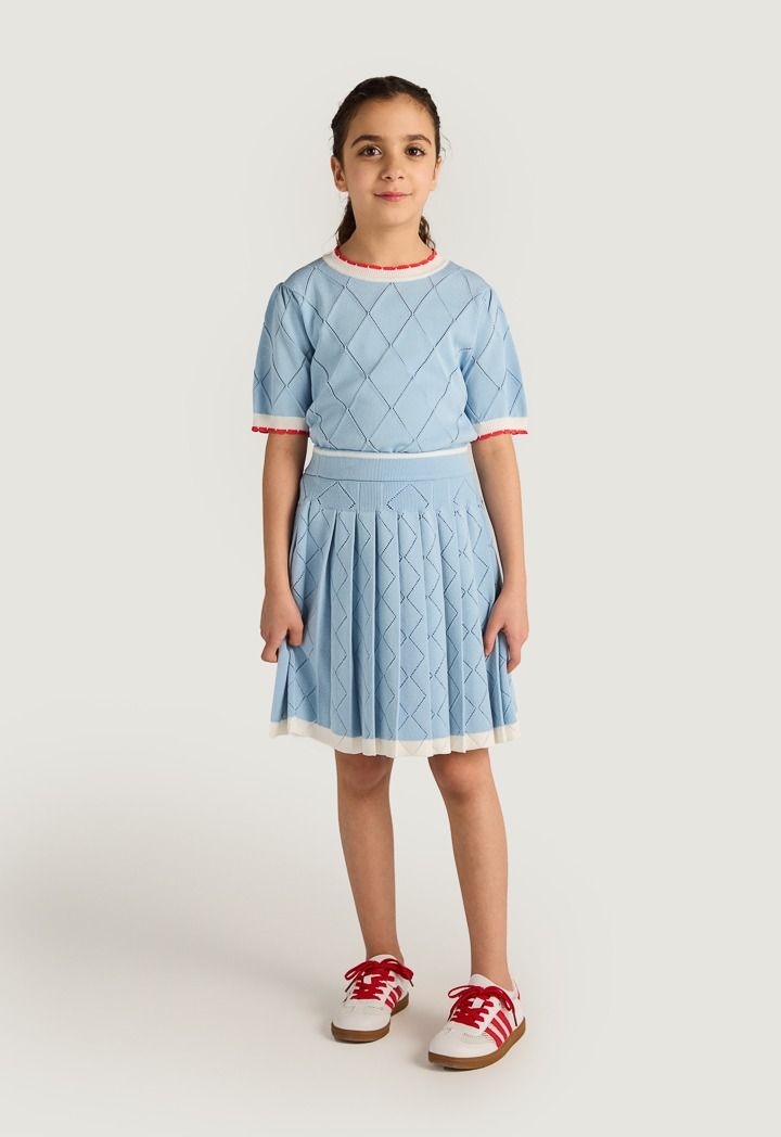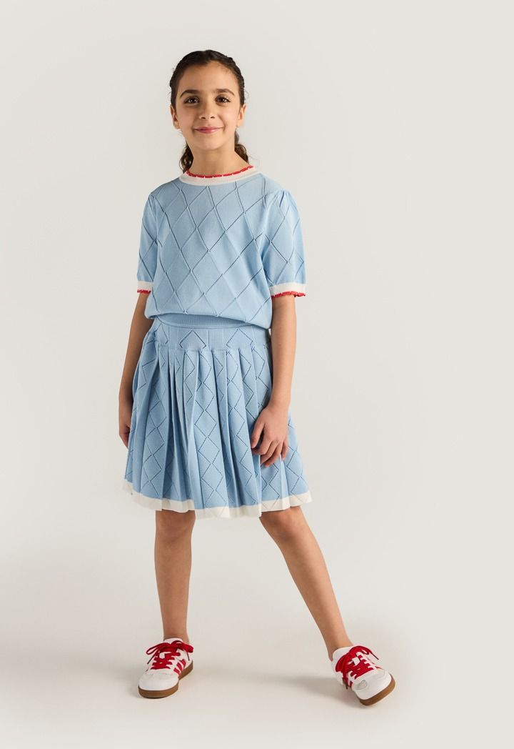 Style this knitted diamond pattern pleated skirt with its matching t shirt.