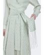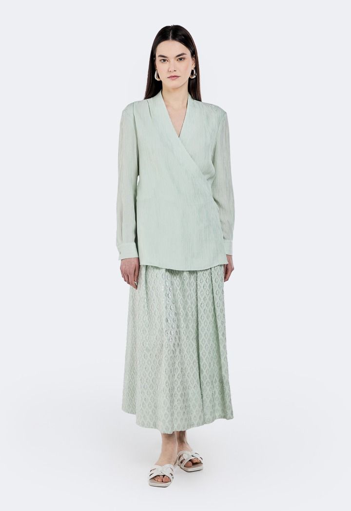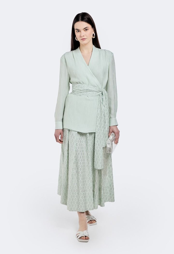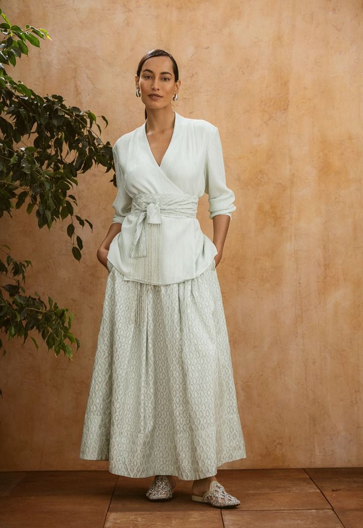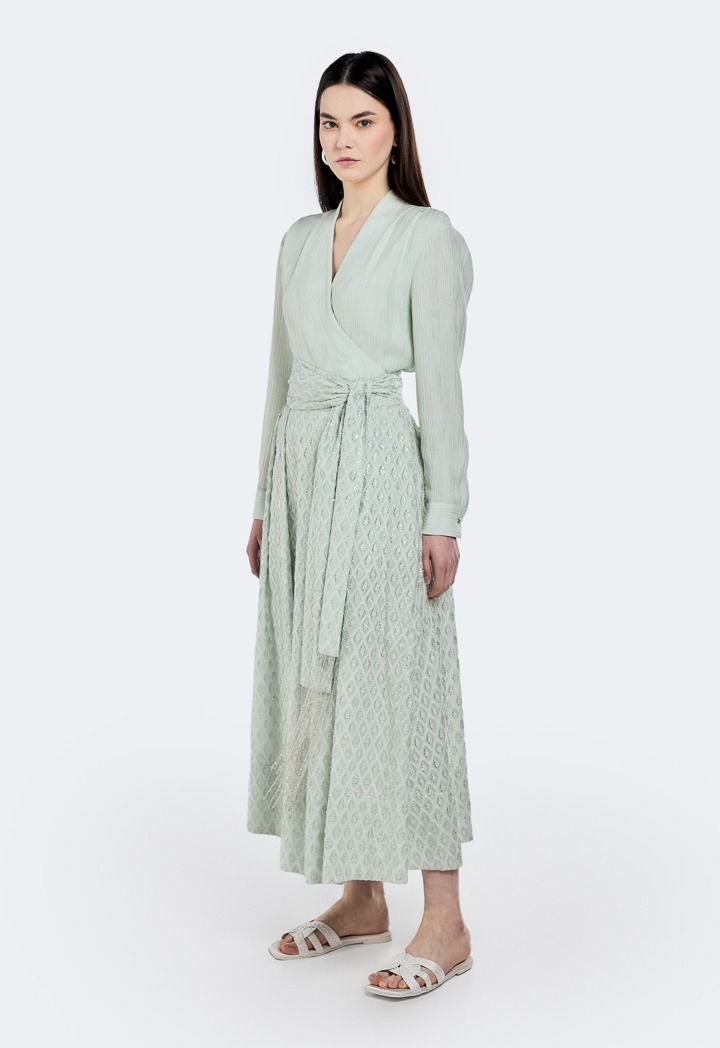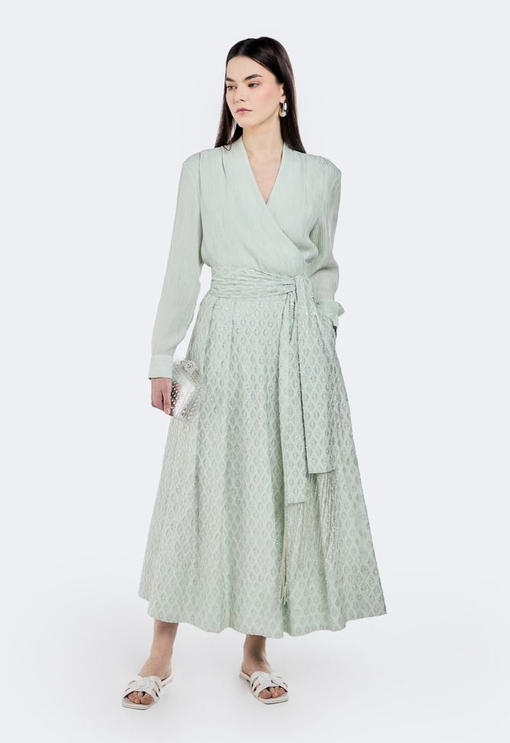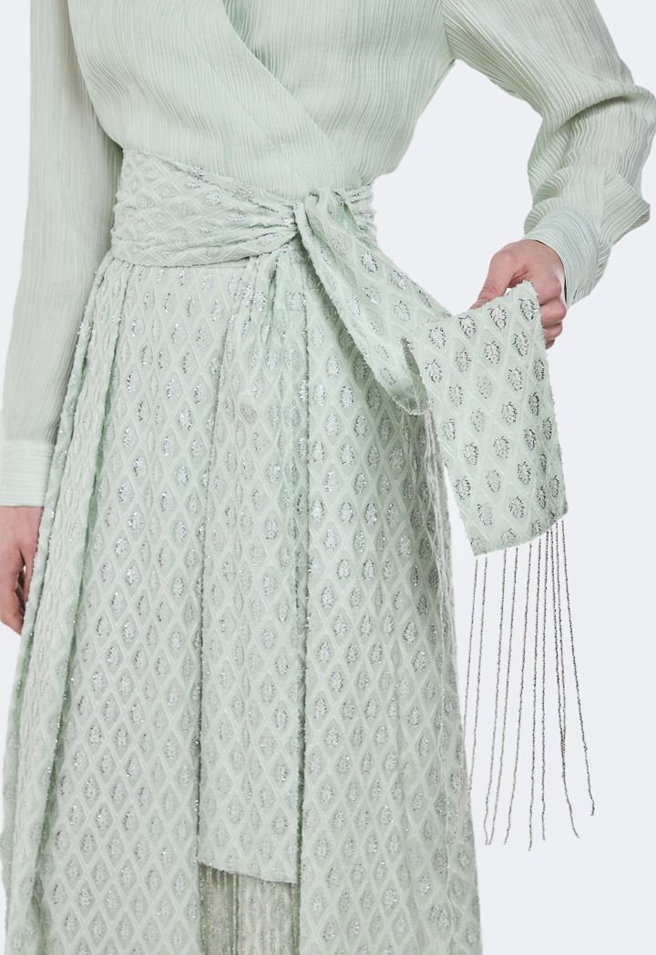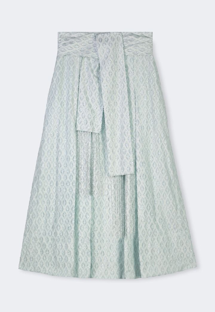 Design: Dobby, Textured, Lurex, Attached Lining, Flared, Belted, Pleated