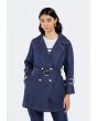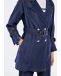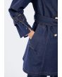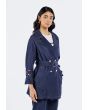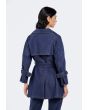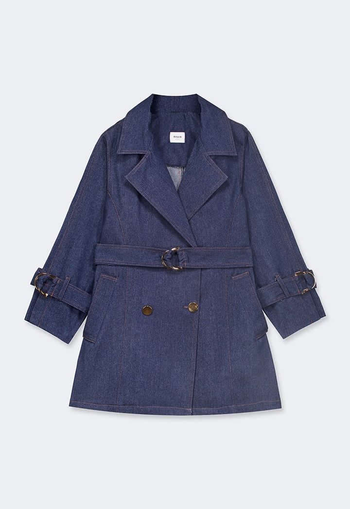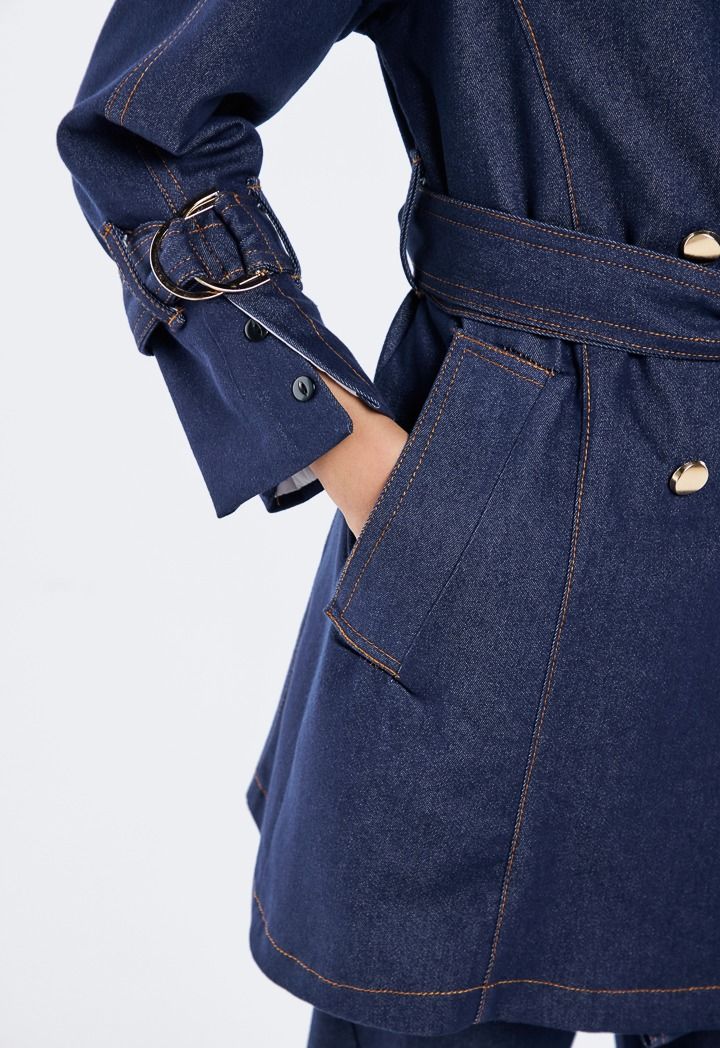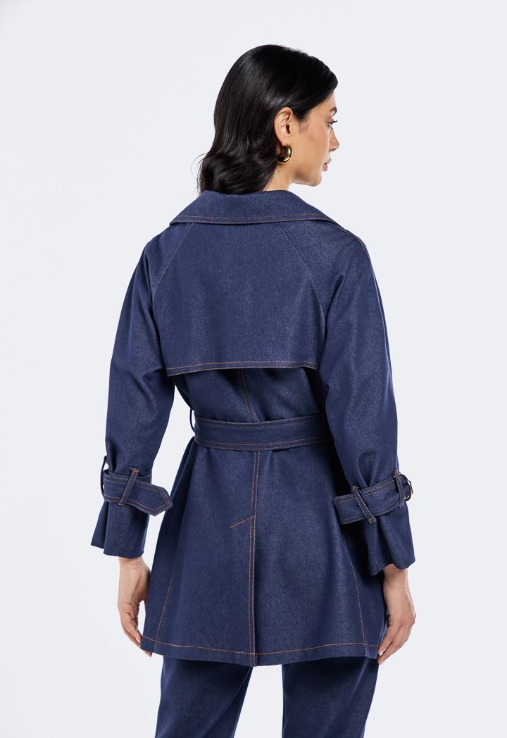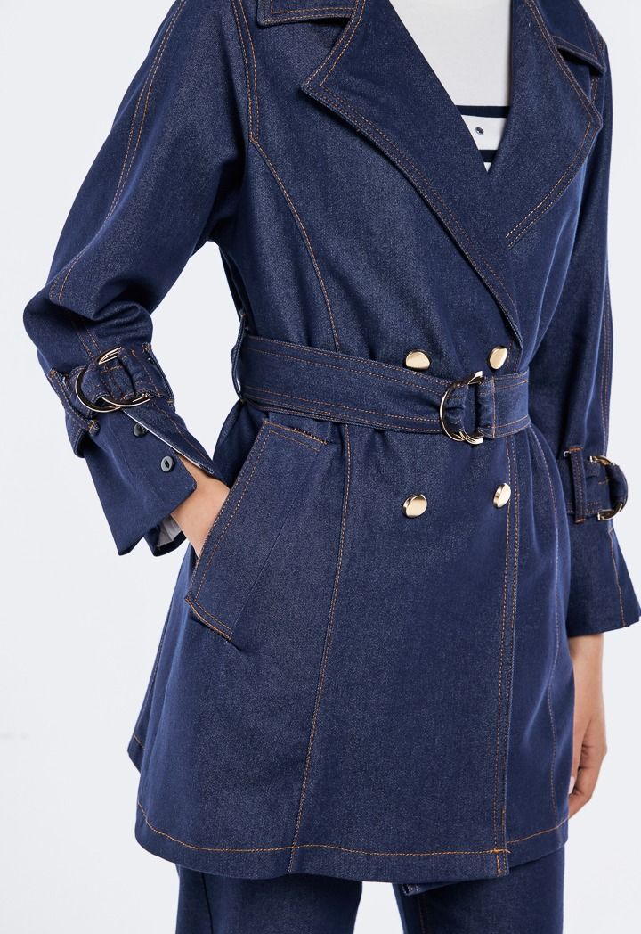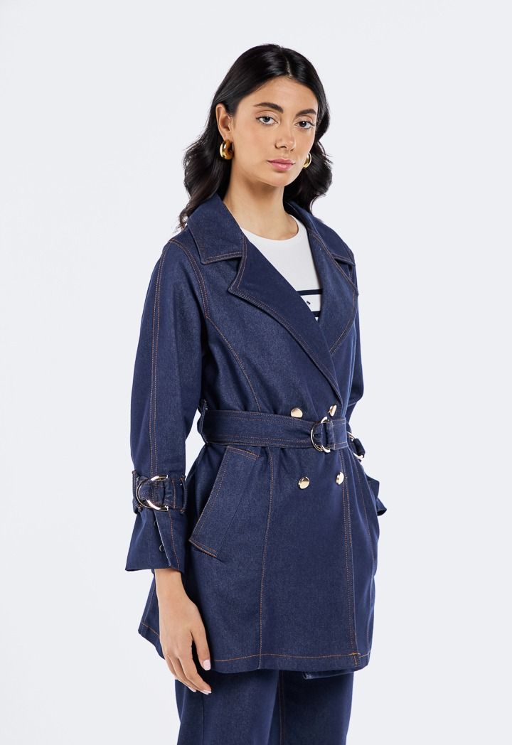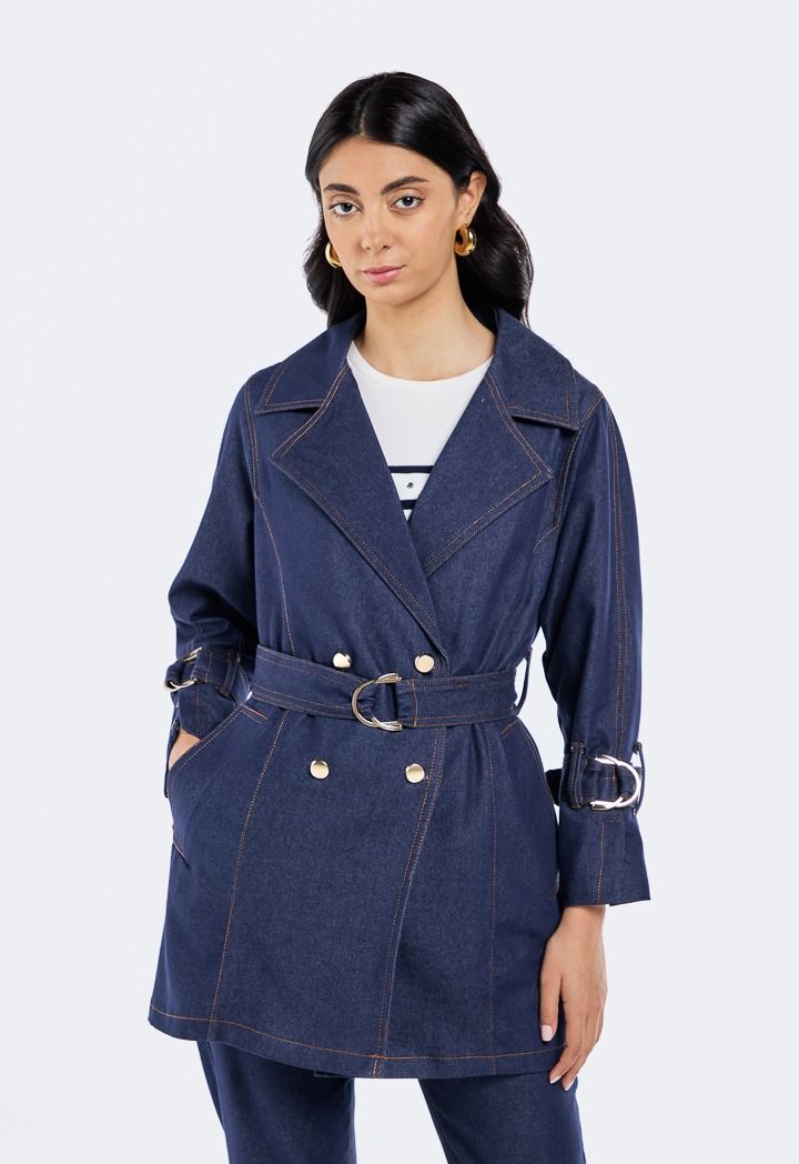 Design: Solid, Front Pockets, Denim, Belted, Double Breasted