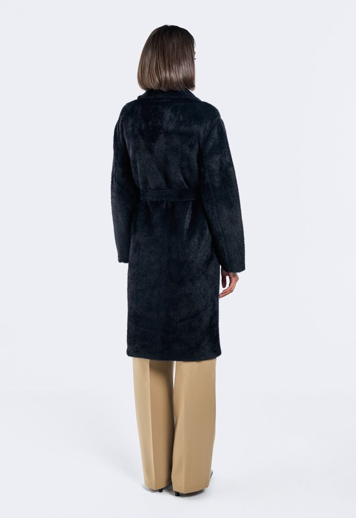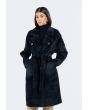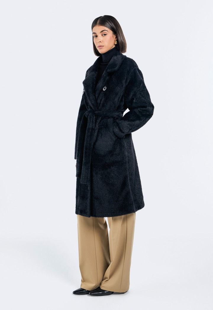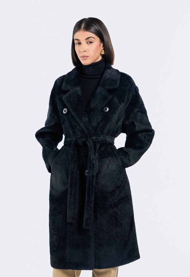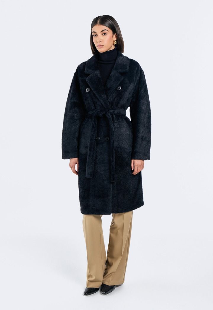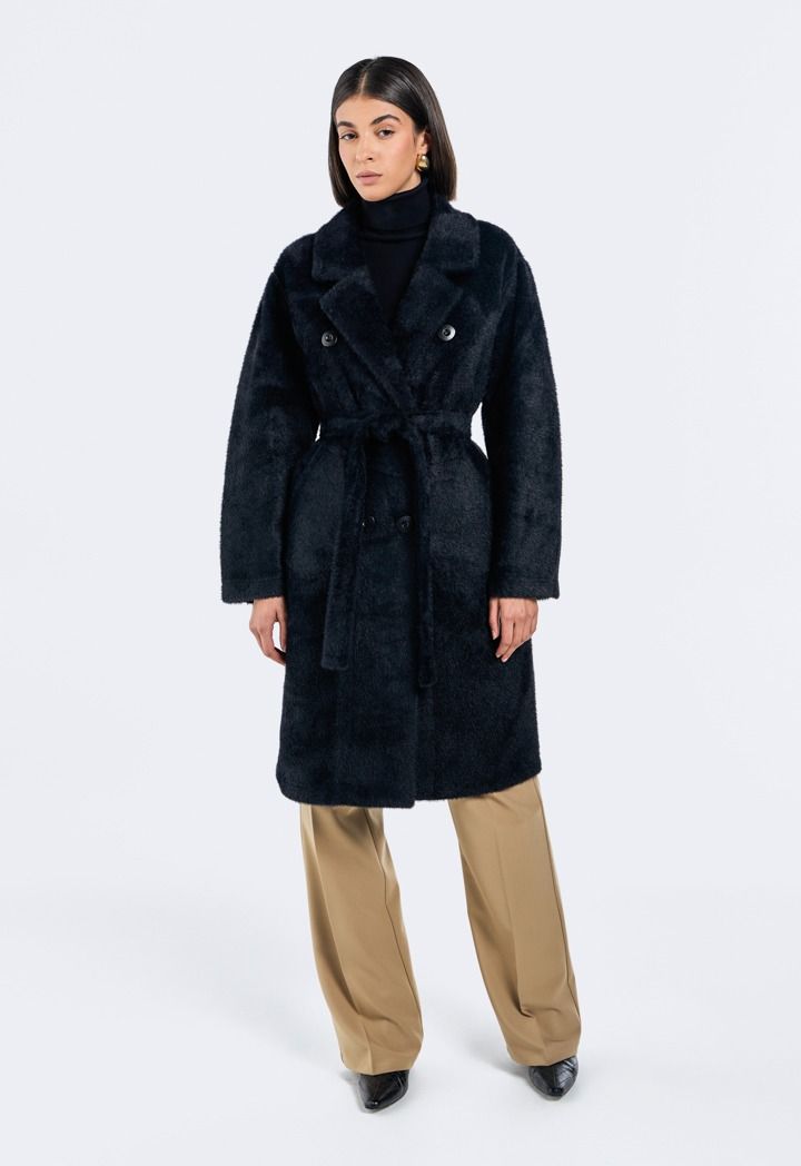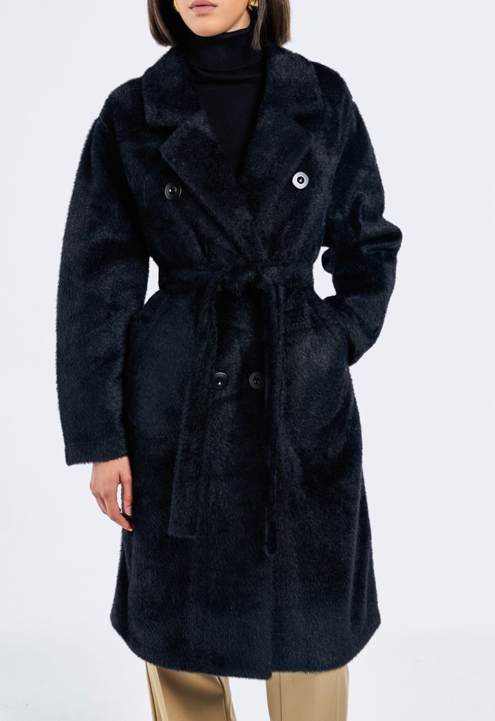 A modern classic coat, featuring a solid faux fur double breasted design.