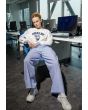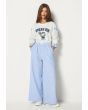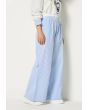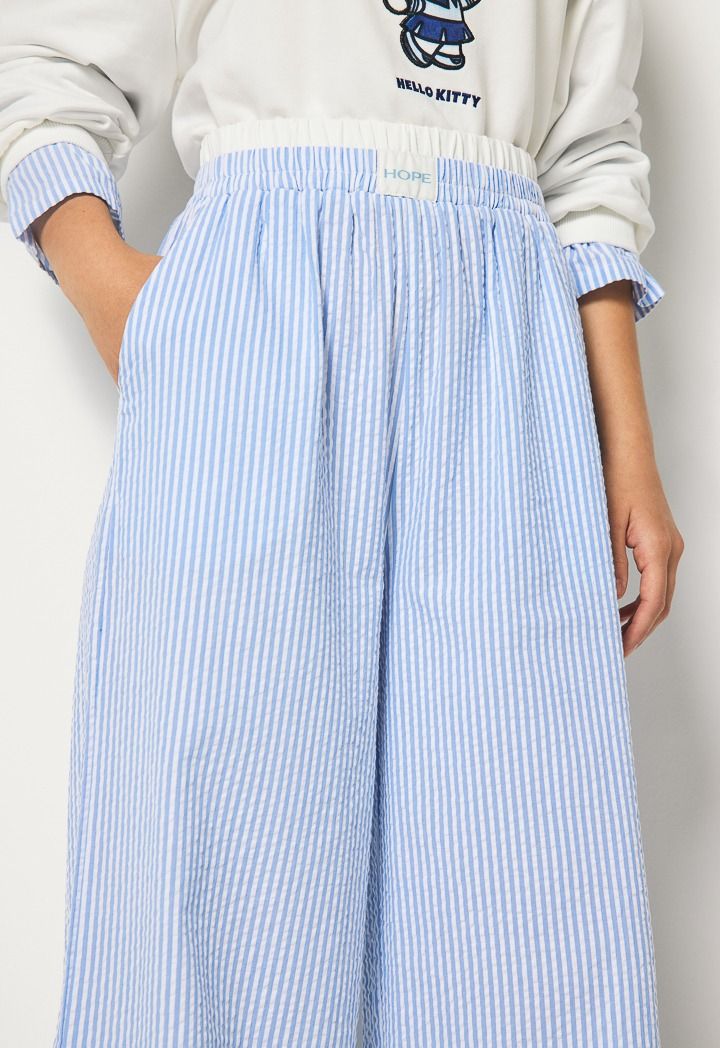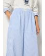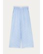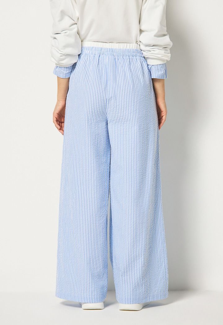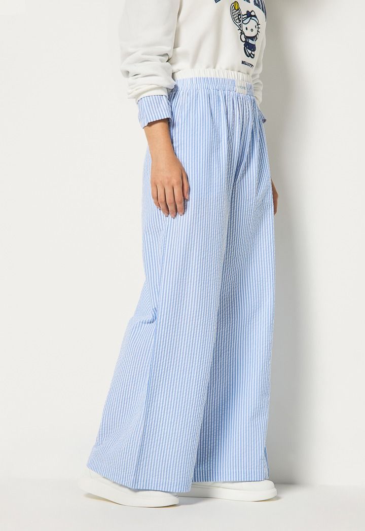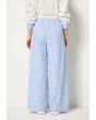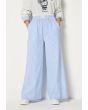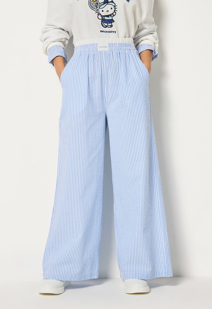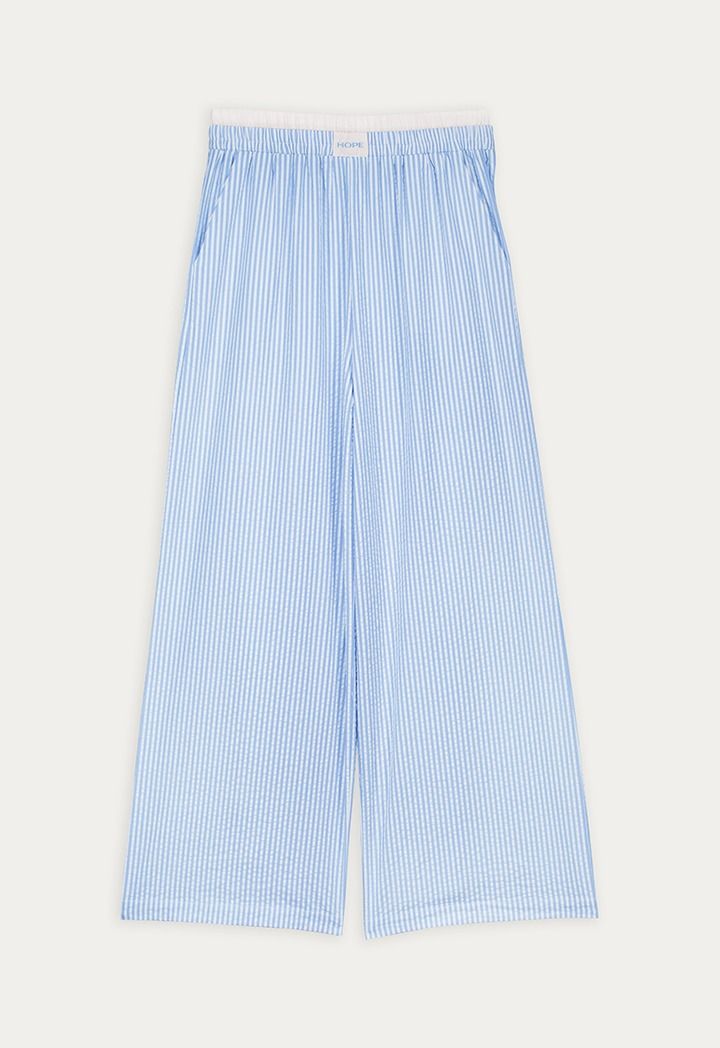 High-waisted straight-leg pants, striped with pockets and a double waistband.
