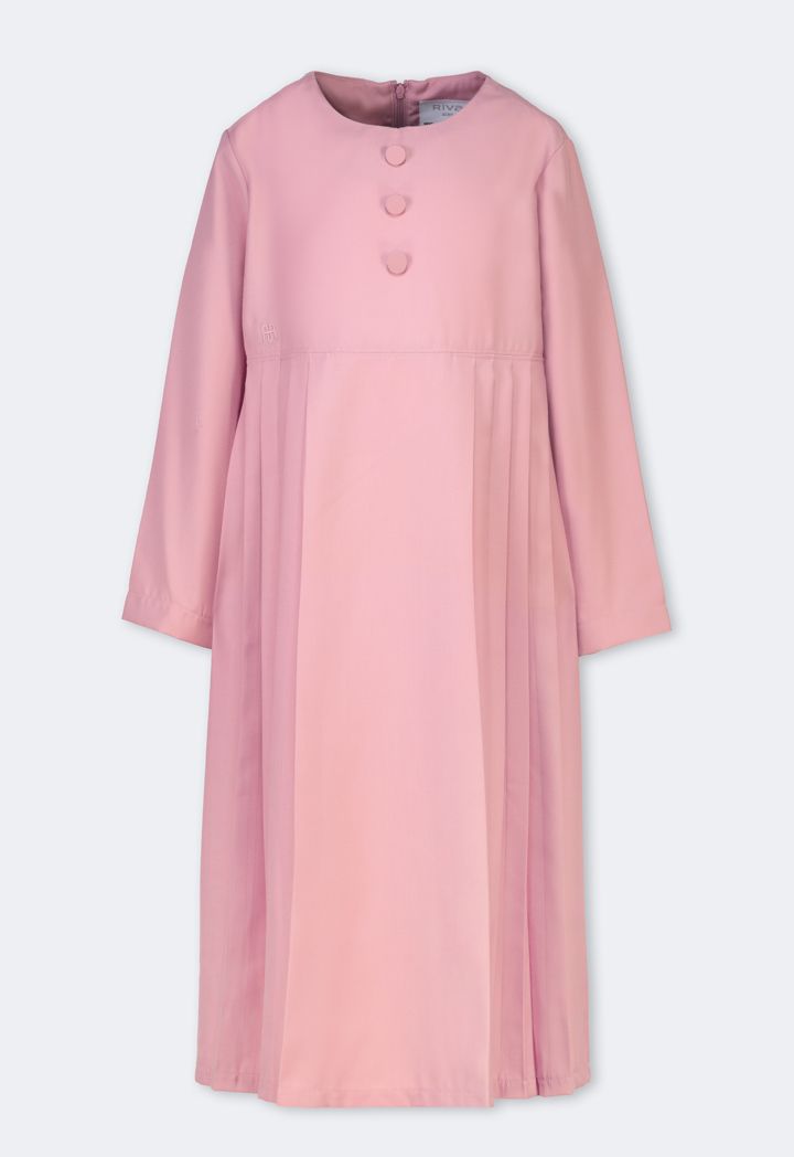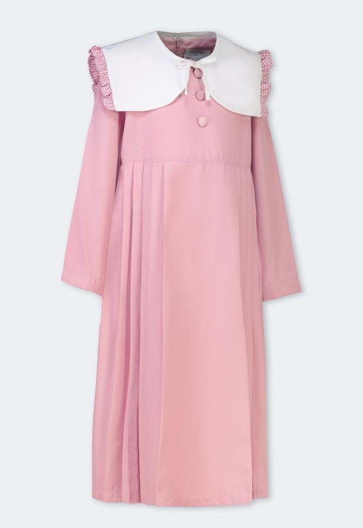 A school uniform dress that features a dramatic checkered collar, long sleeves and a side pleated skirt.