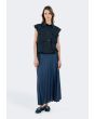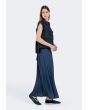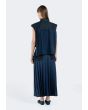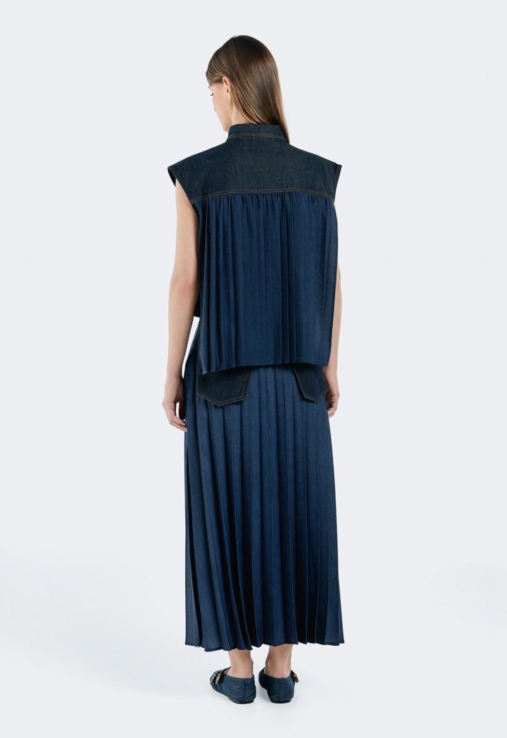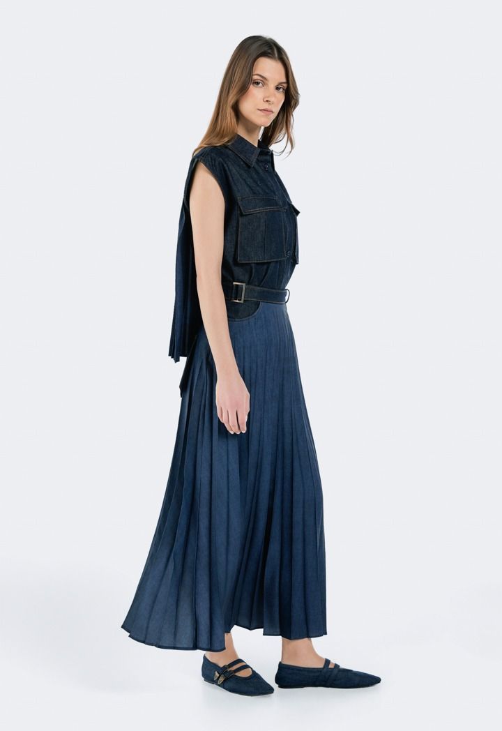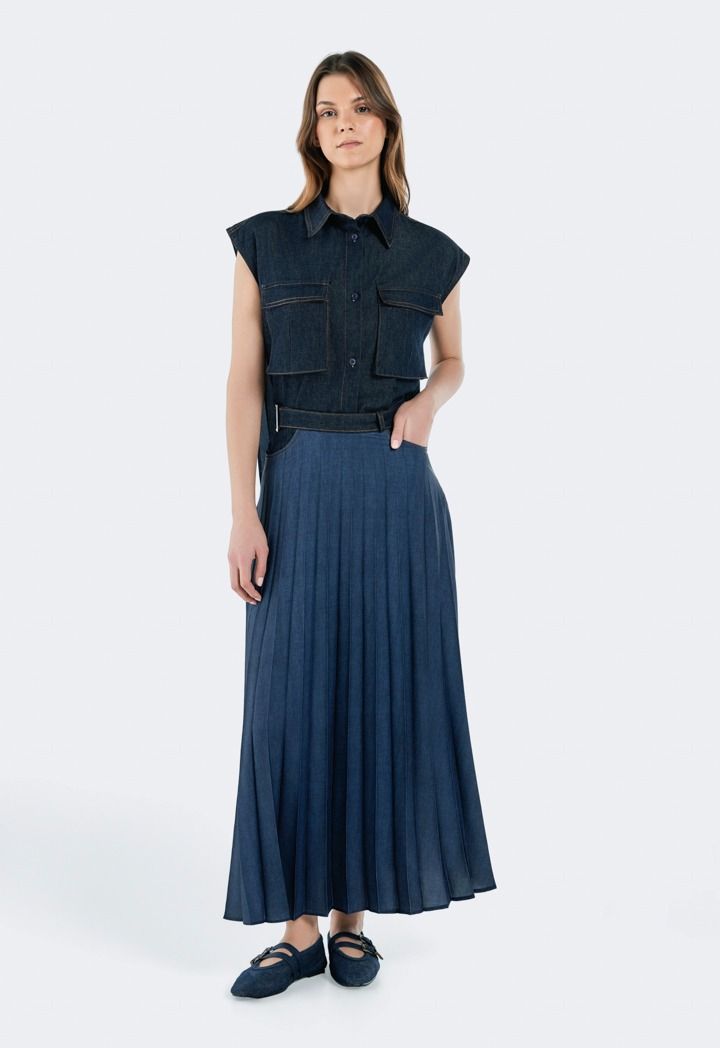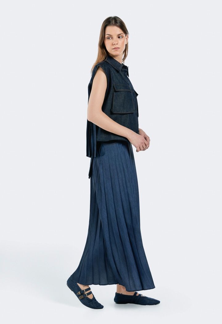 Design: Solid, Denim, Front Flap Pockets, Back Pleated Overlay , Drawstring Hem