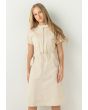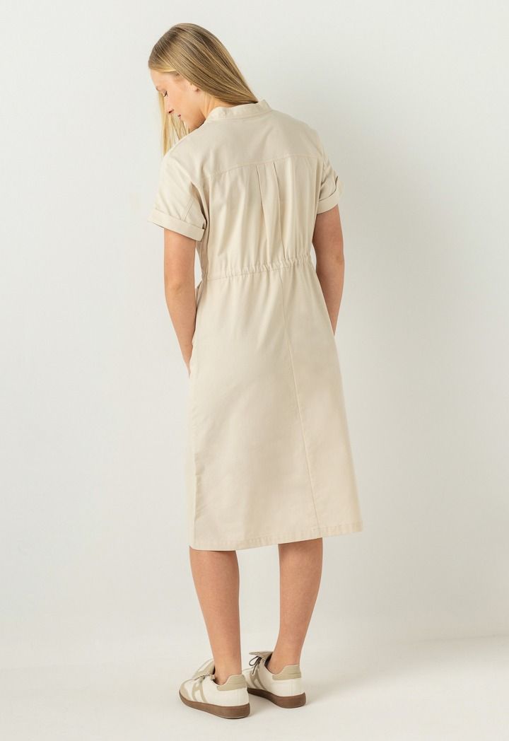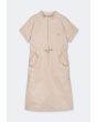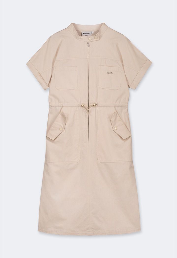 A unique dress design that includes a cargo design with a drawstrings waist.