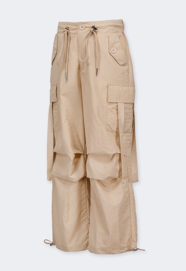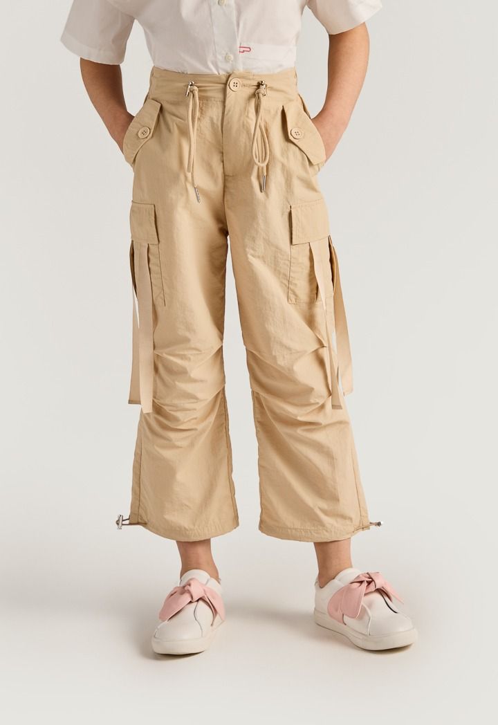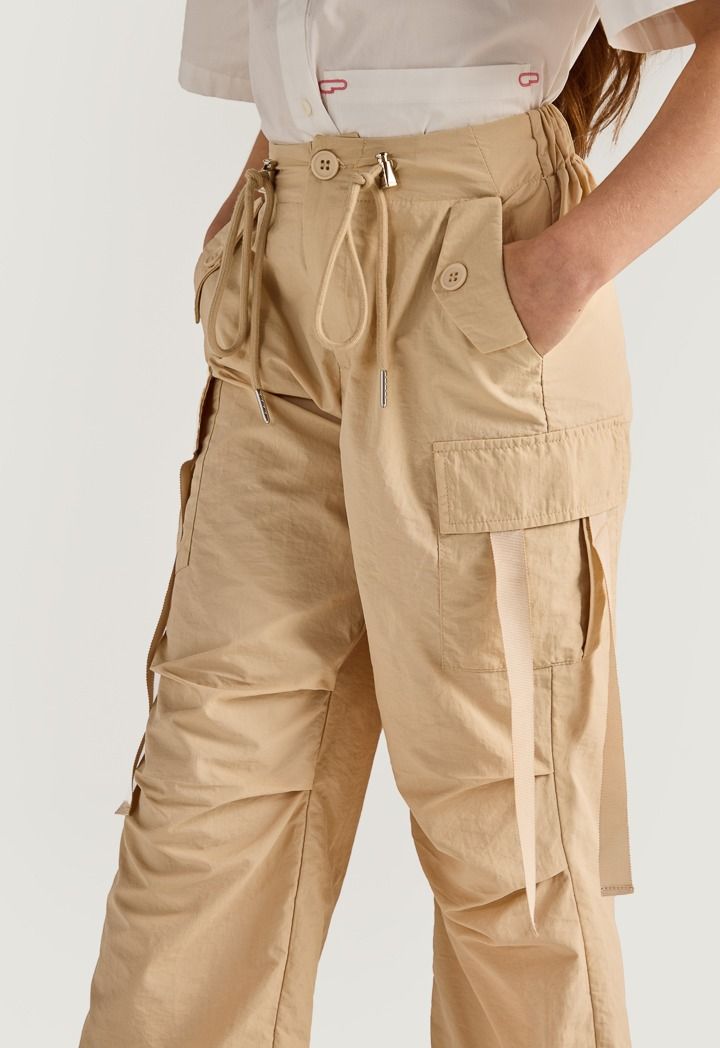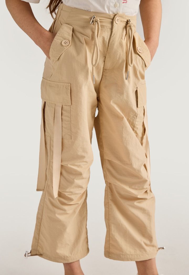 A Modern Pair Of Cargo Pants Featuring Drawstrings Hems.