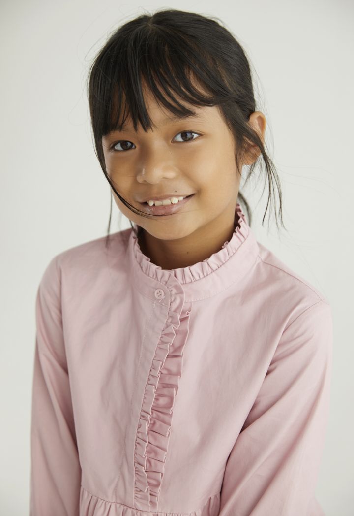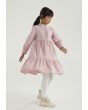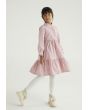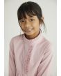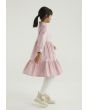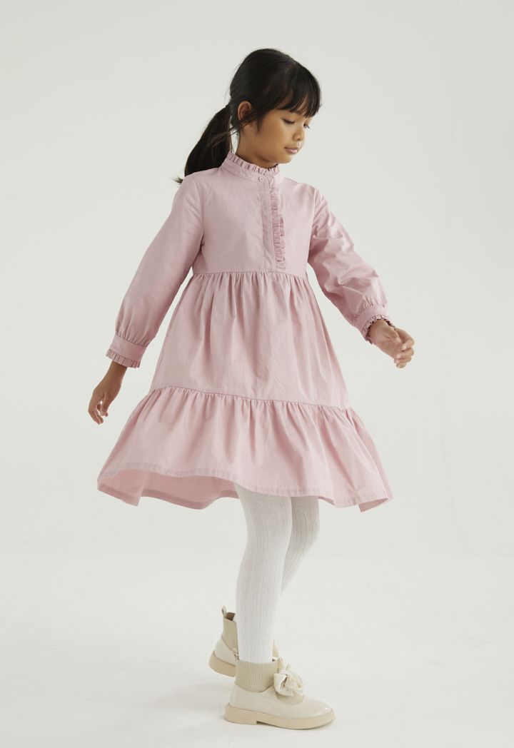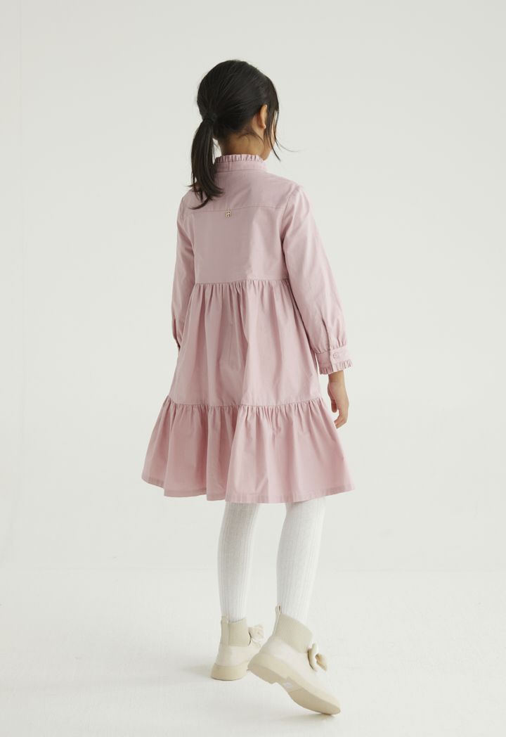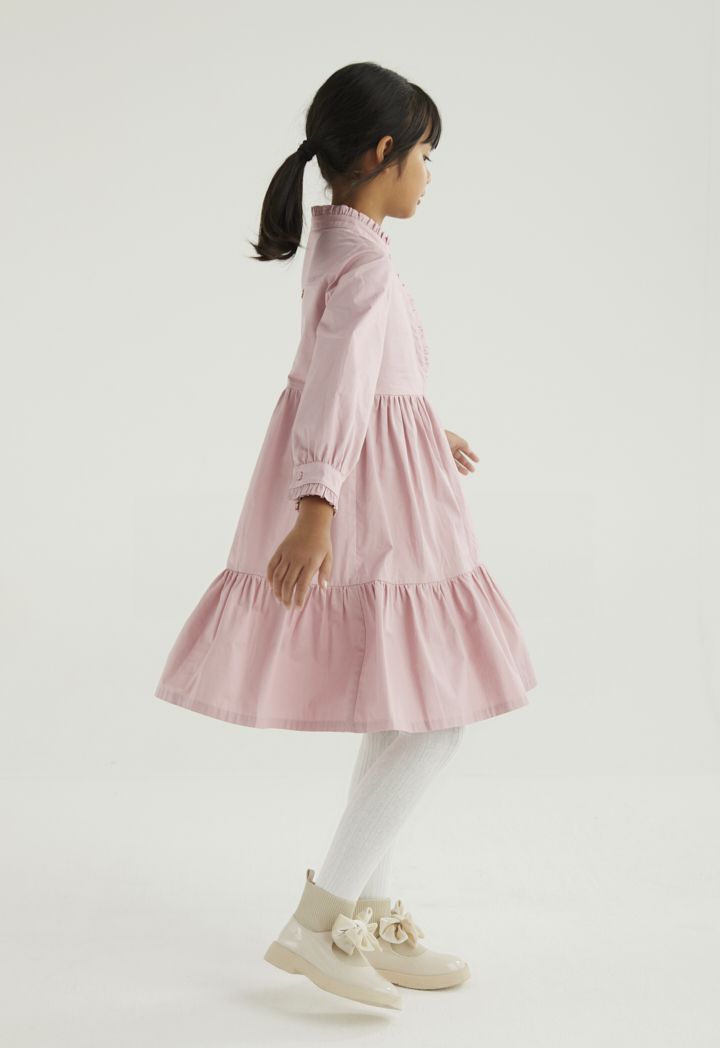 A solid dress that features a pleated collar, long sleeves and ruffled touches.
