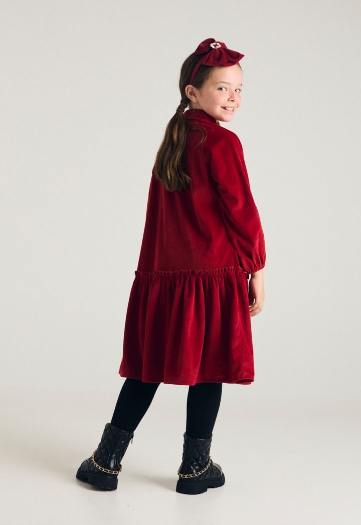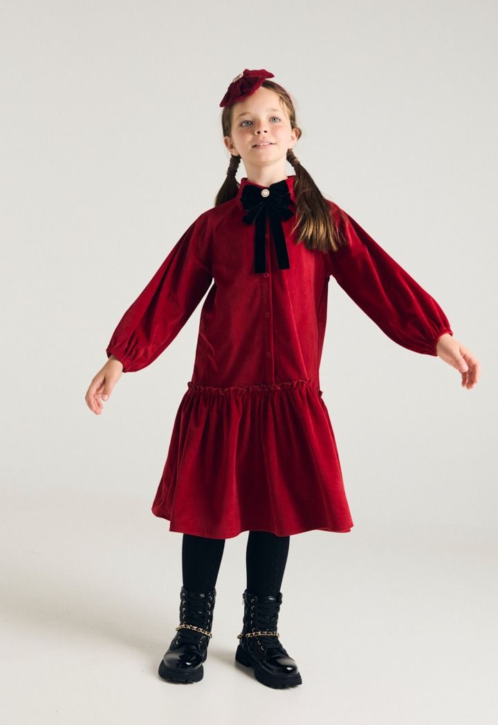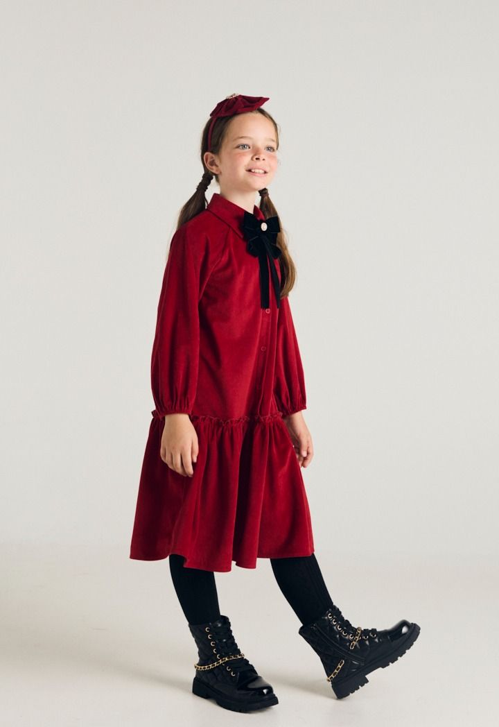 A Cute Drop Waist Velvet Dress with elastic cuffs, perfect for your little one playtime.