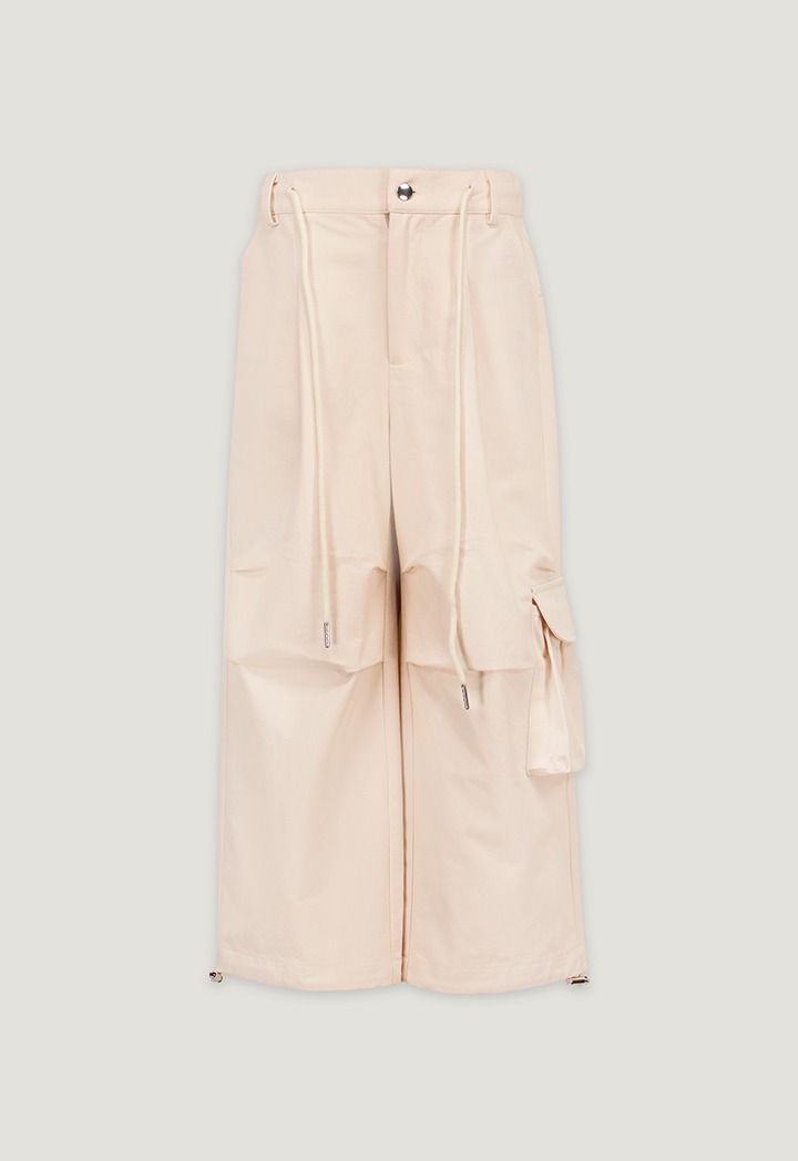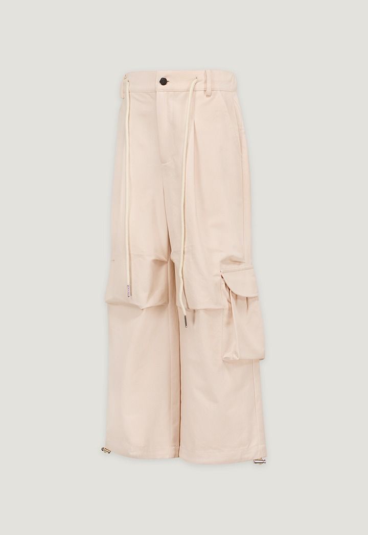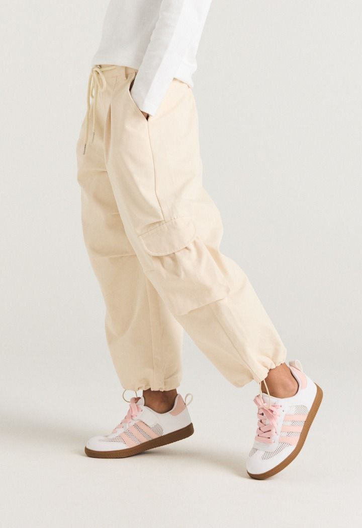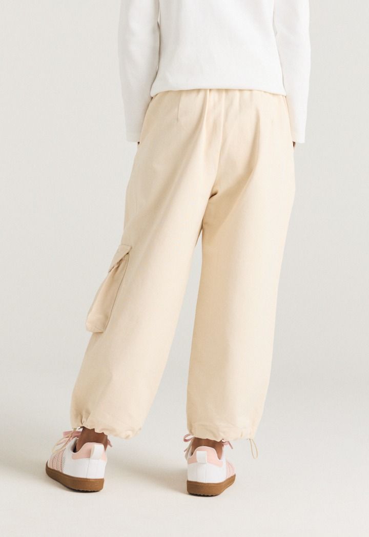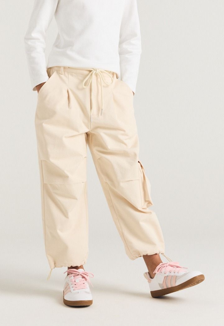 A pair of solid cargo pants that feature drawstrings waist and hems.