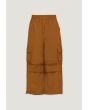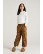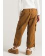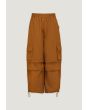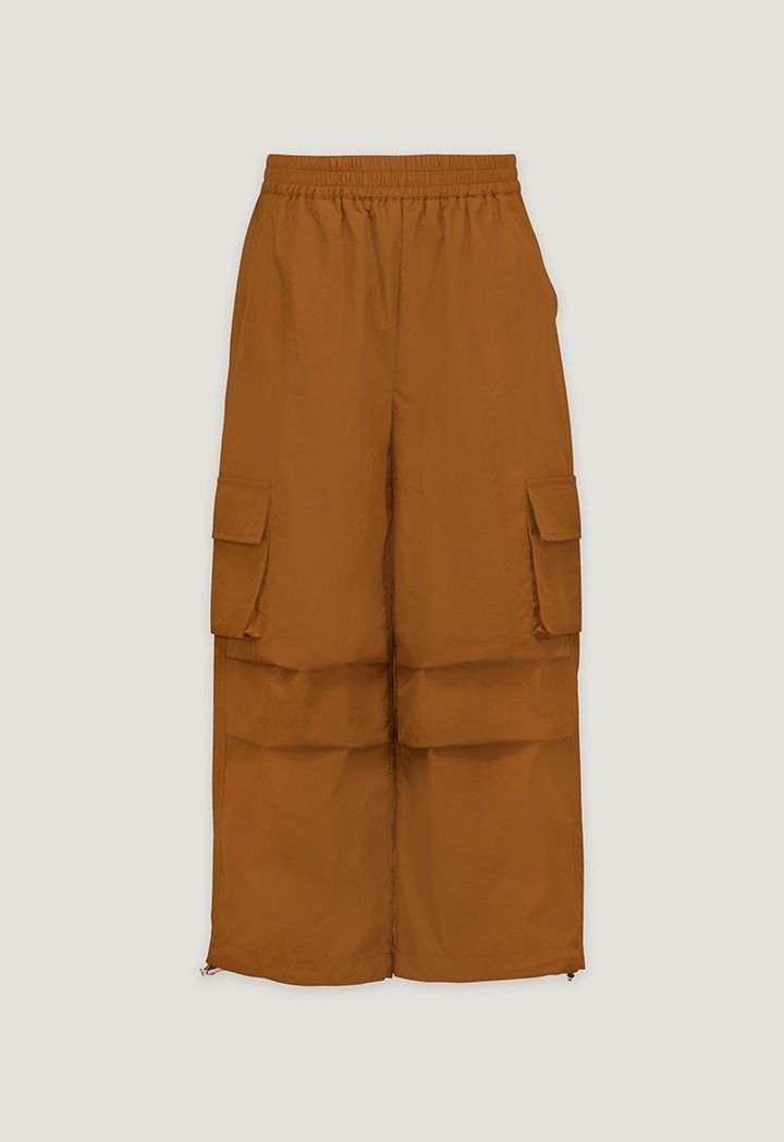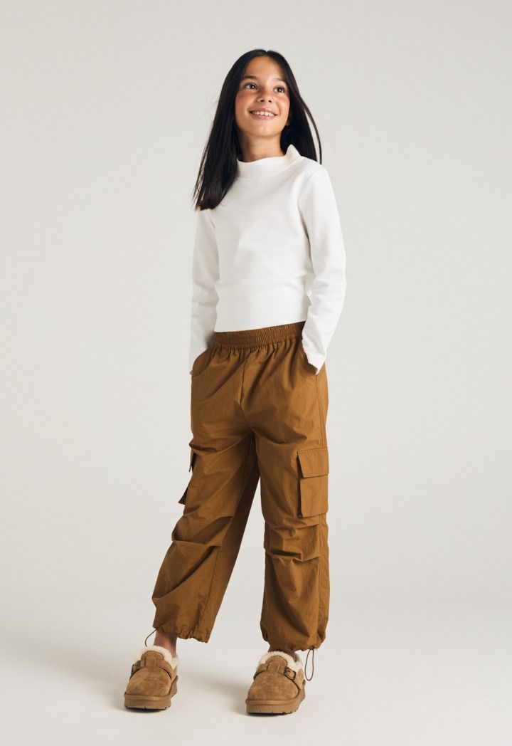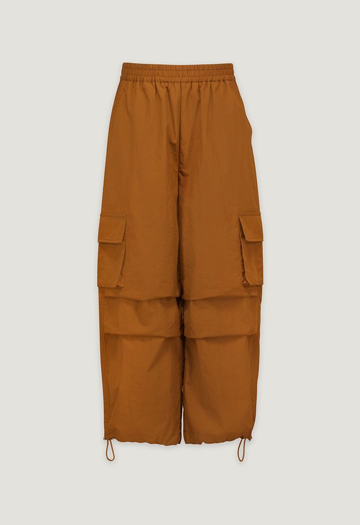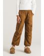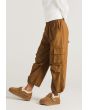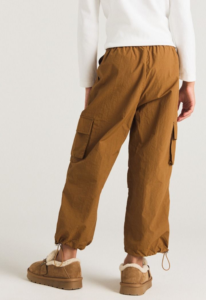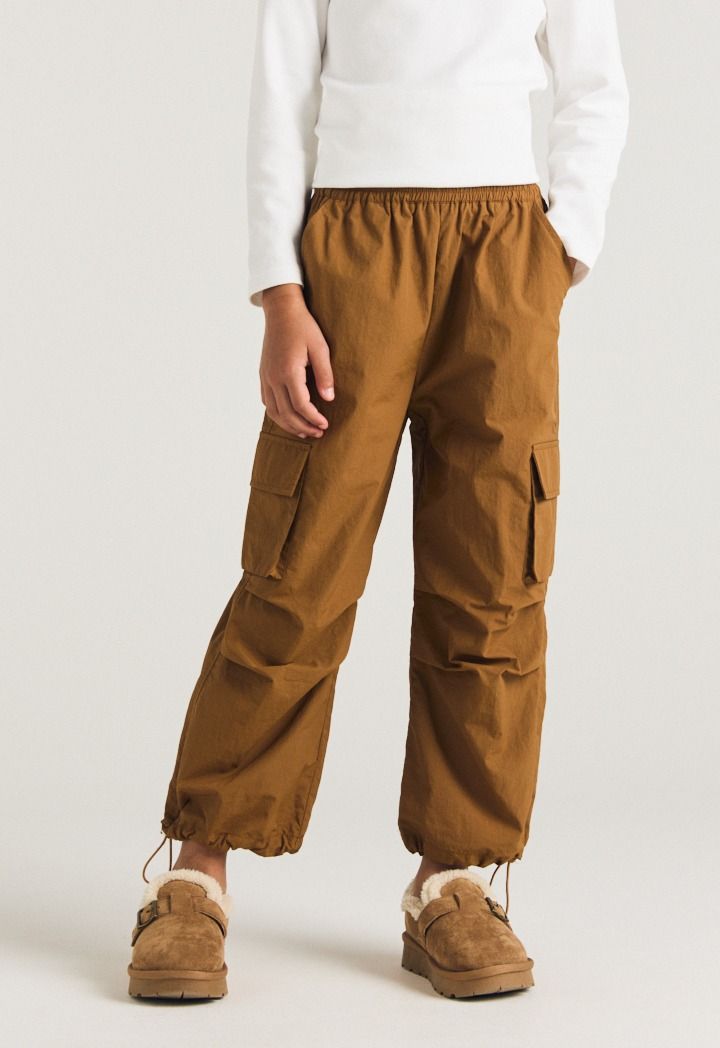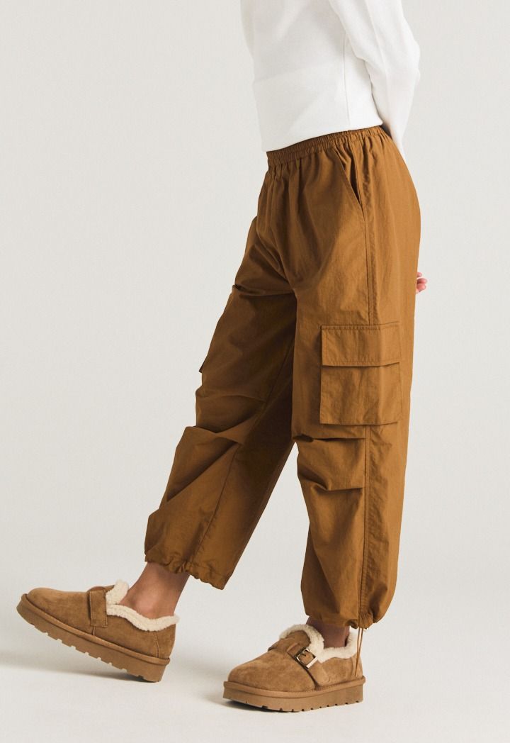 A pair of solid cargo pants that feature a comfortable elastic waist.