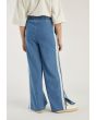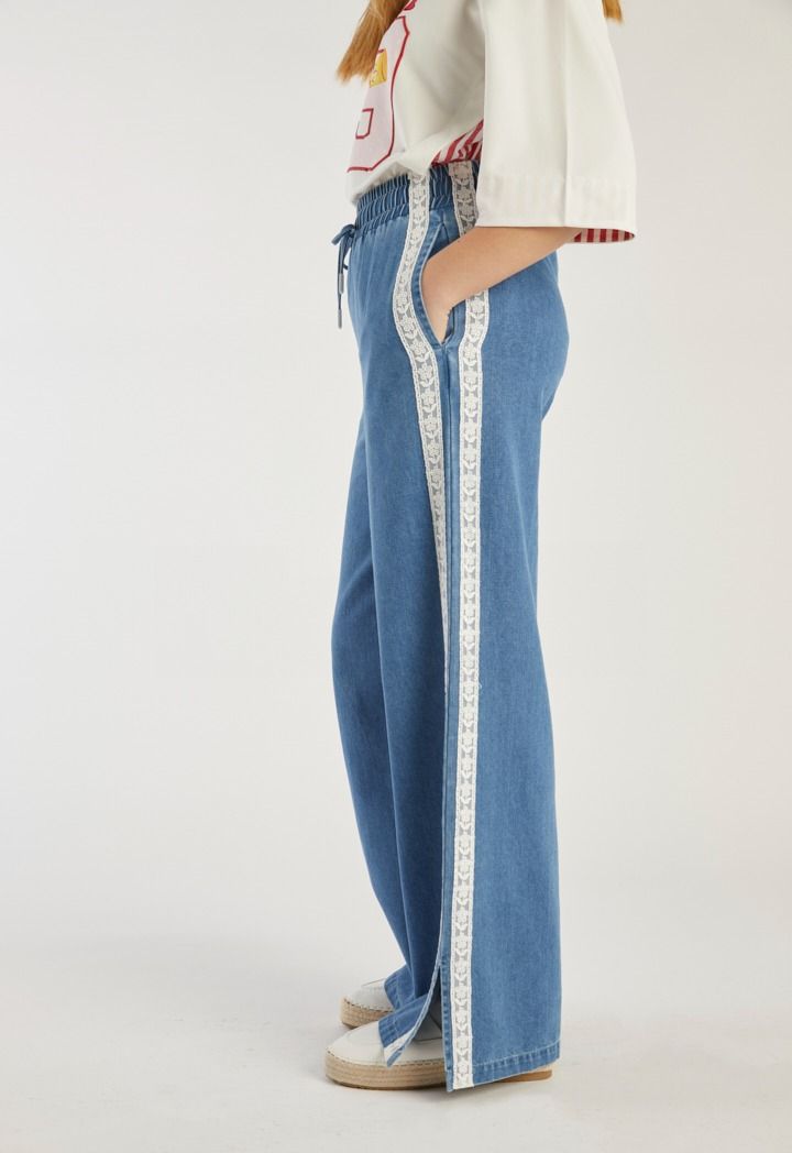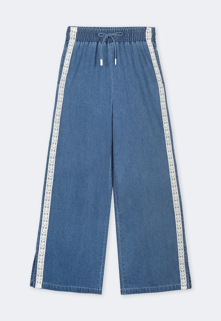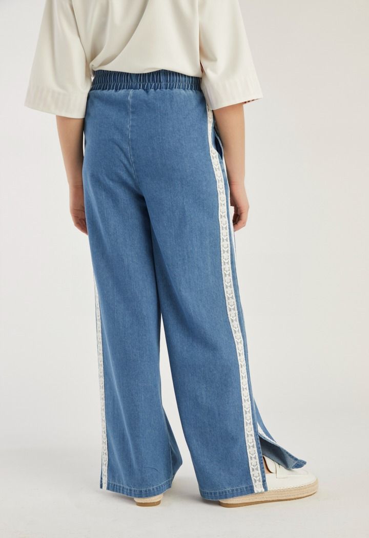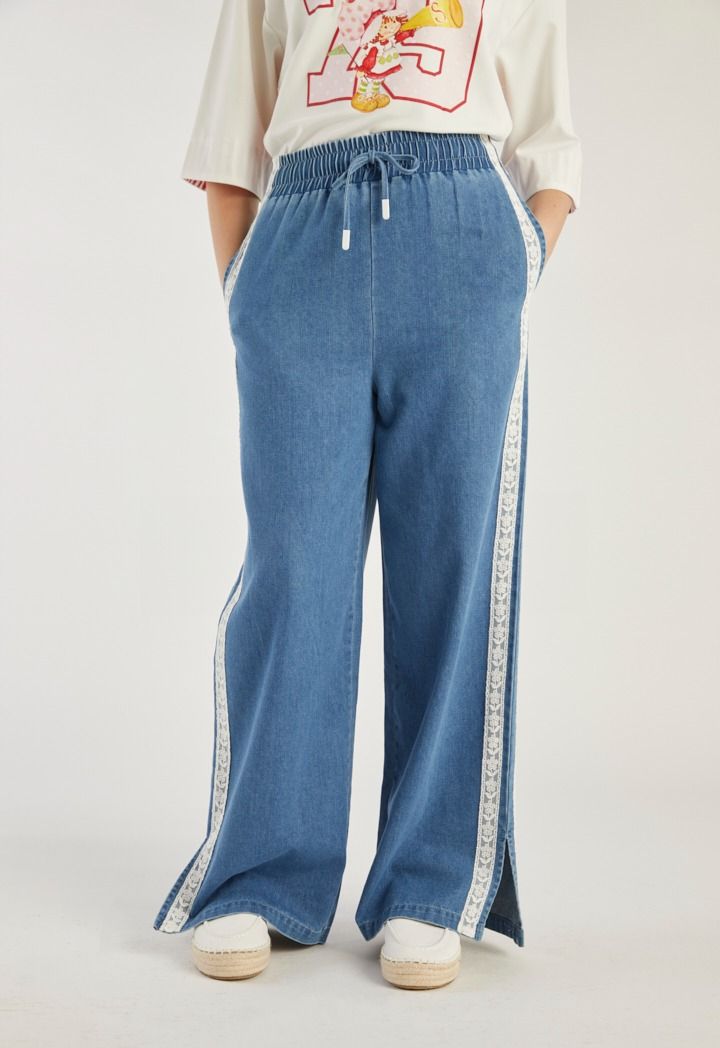 Design : Denim, Lace, Side Slit, Wide straight Legs