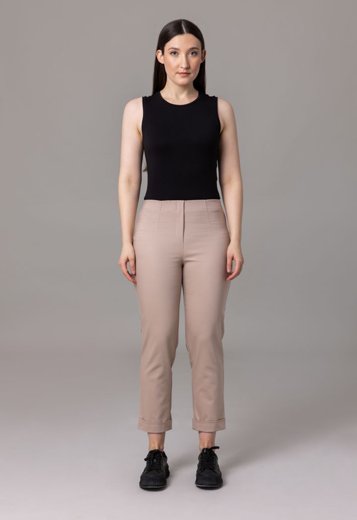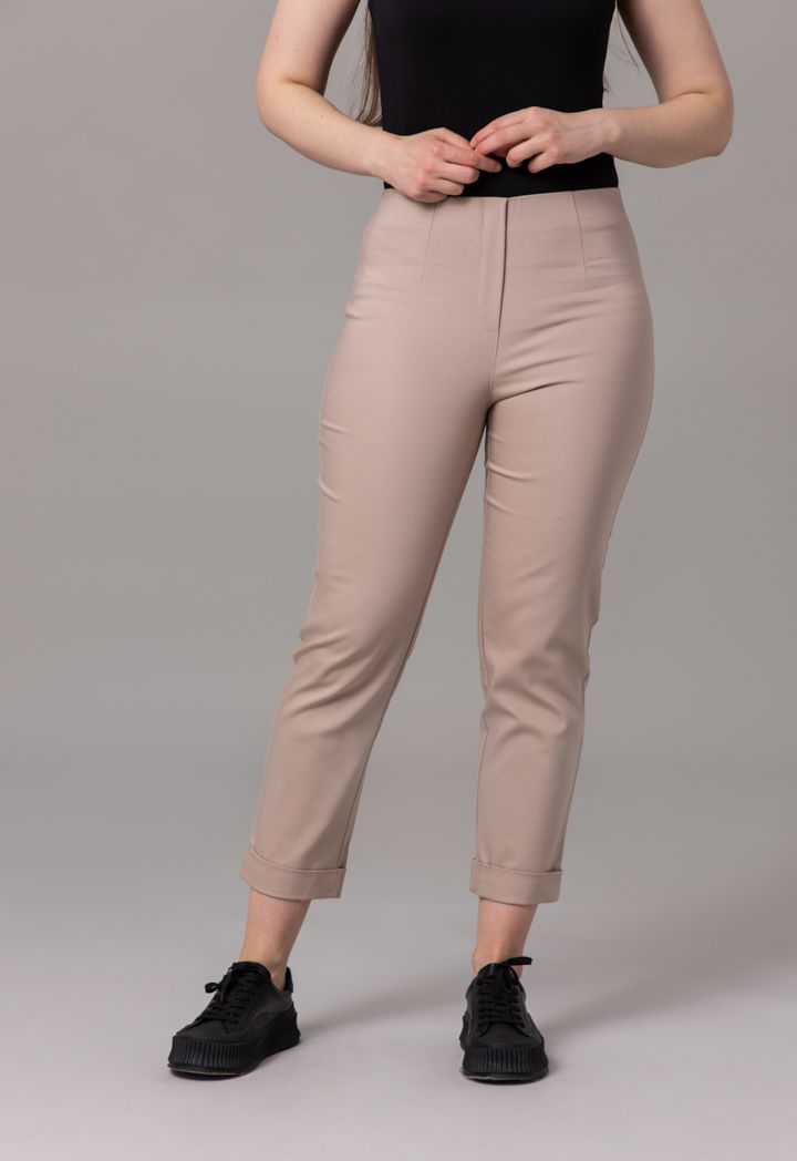 Design : Solid, High rise, Back Faux pockets, Folded hemline