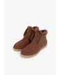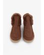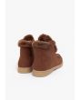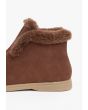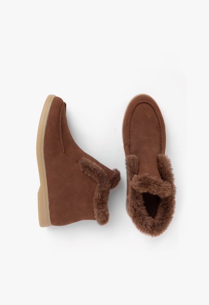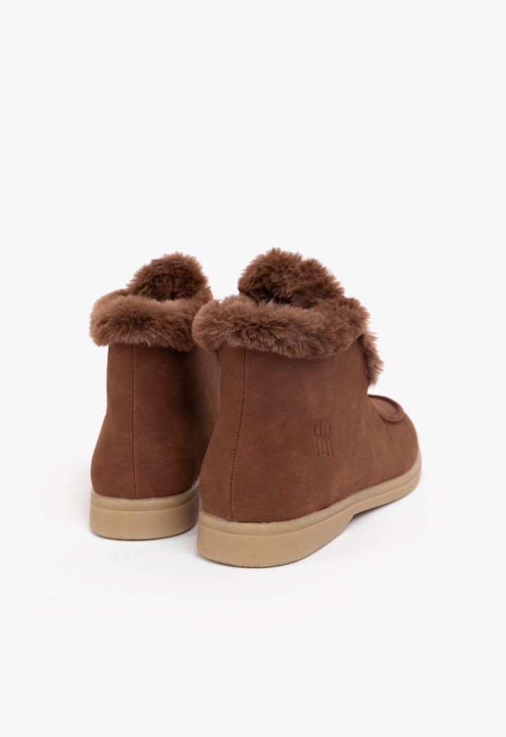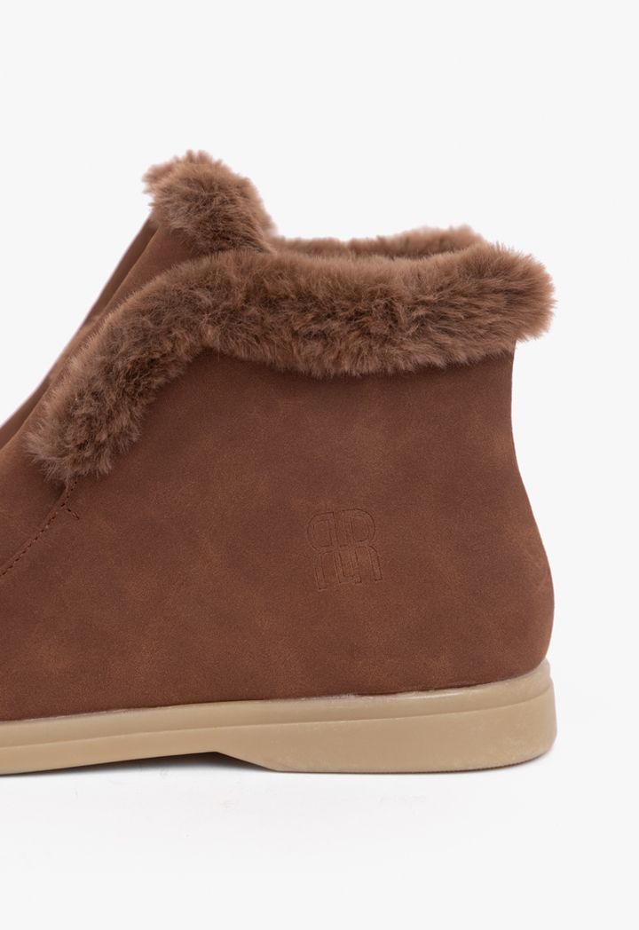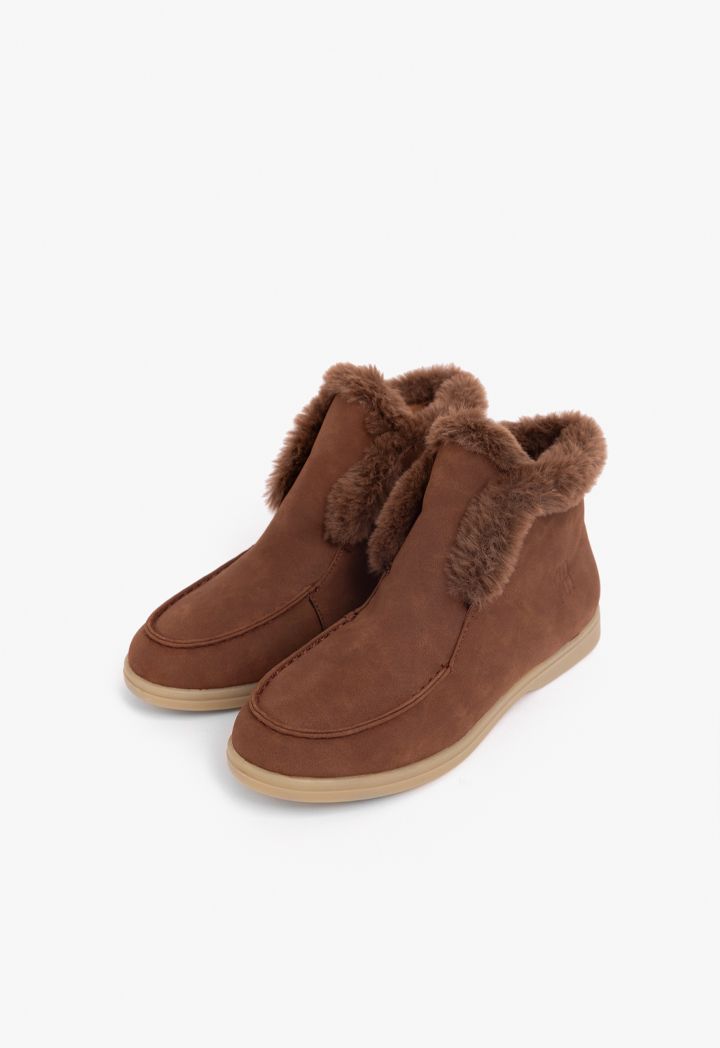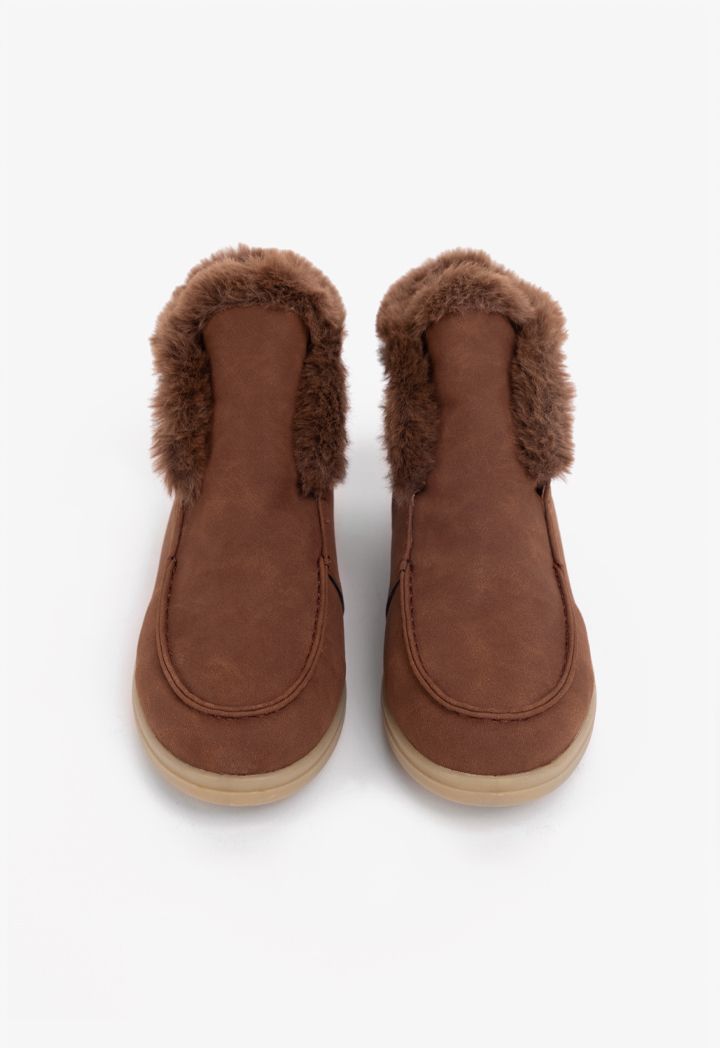 A solid pair of ankle boots that is embellished with faux fur and features a laceless design.