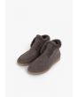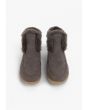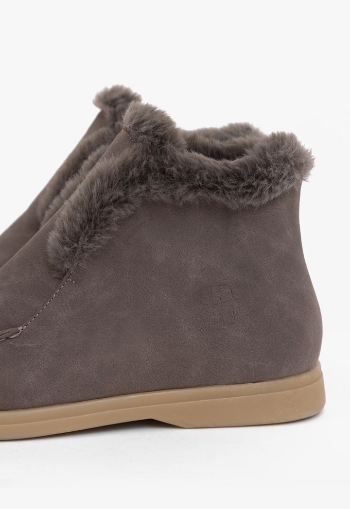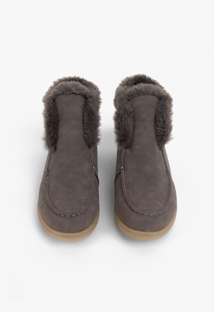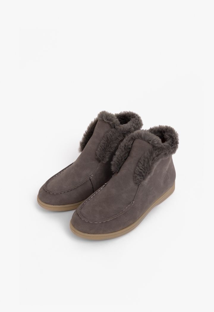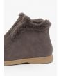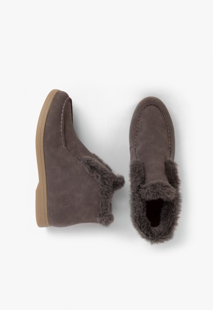 A solid pair of ankle boots that is embellished with faux fur and features a laceless design.