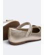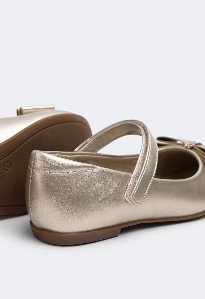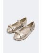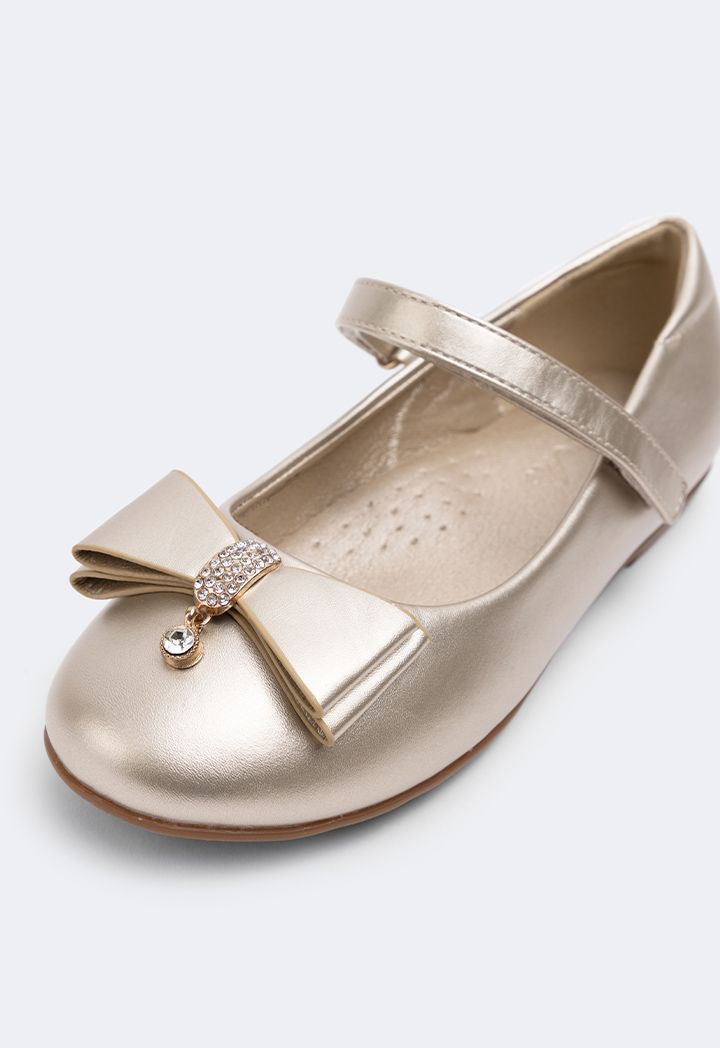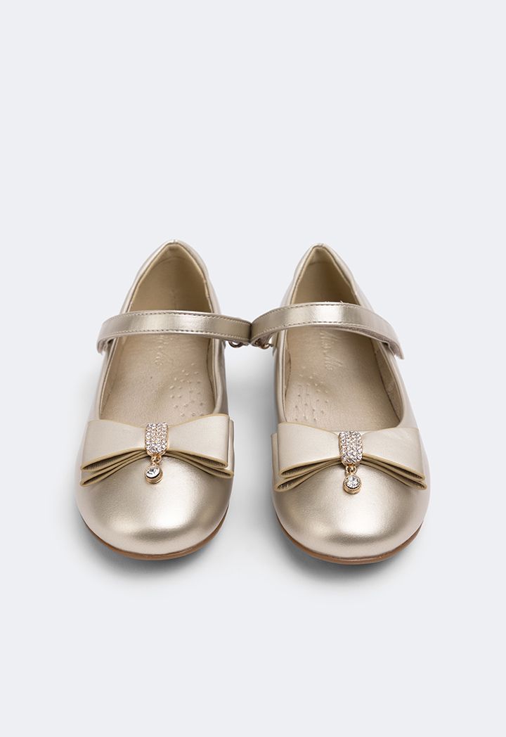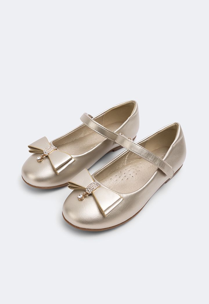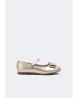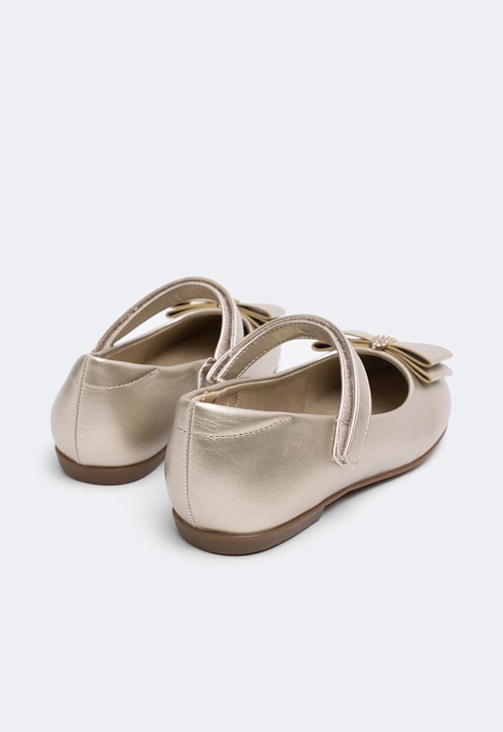 A unique approach to the flat strap shoes, featuring a bow on the rounded toe for that extra look.