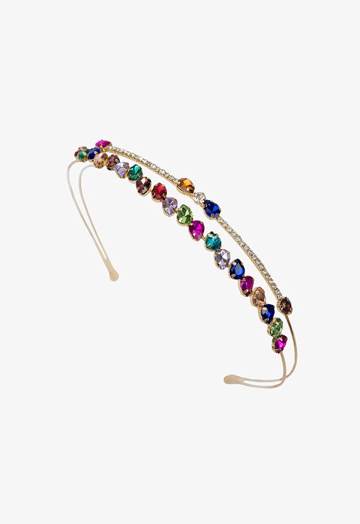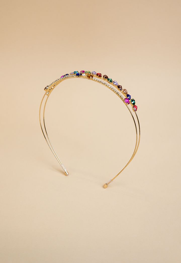 Combine simplicity and colors wearing this mixed headband embellished with sparkling crystals and multicolored light reflection rhinestones.