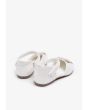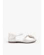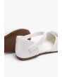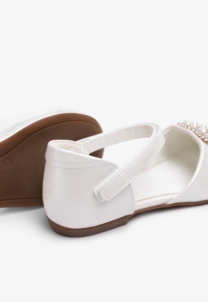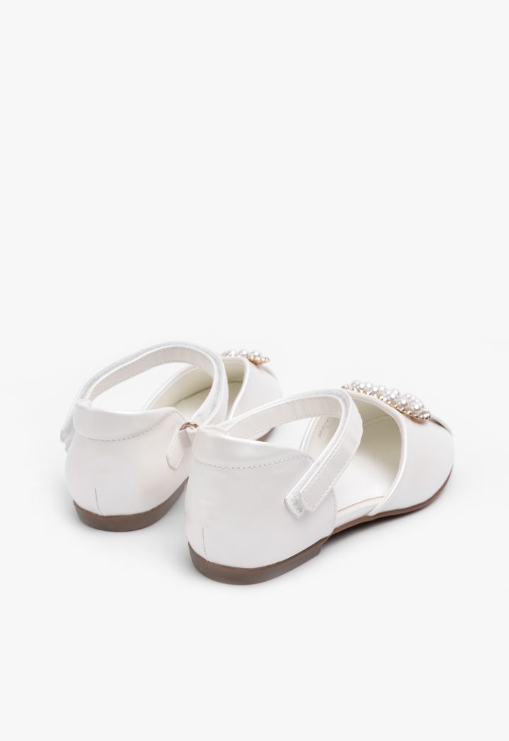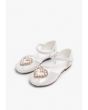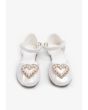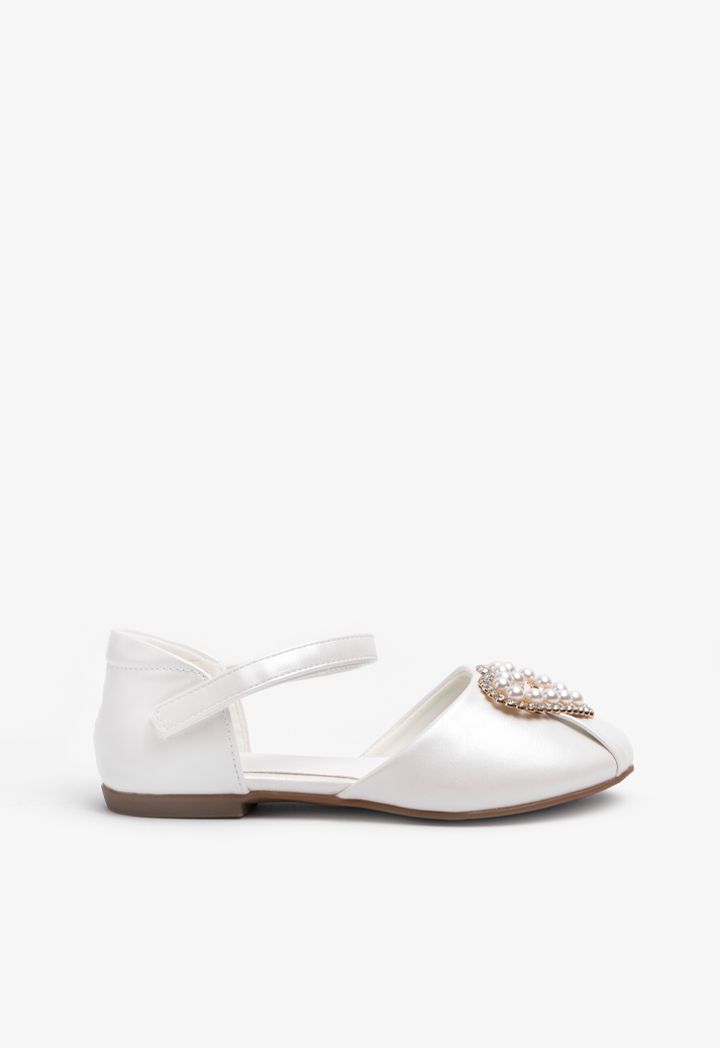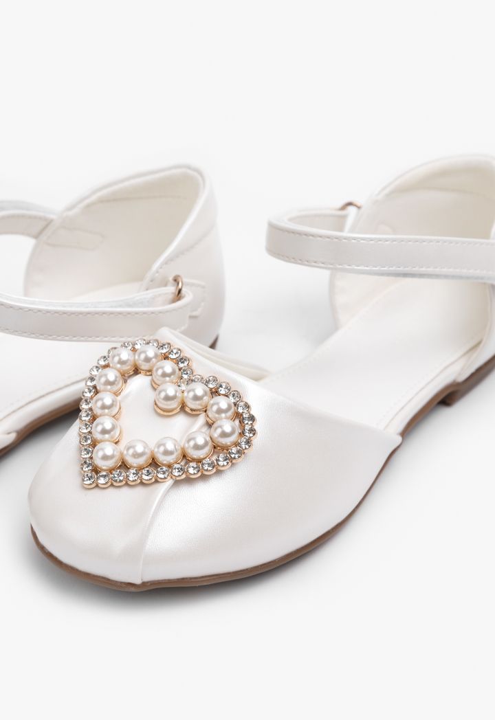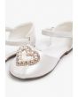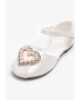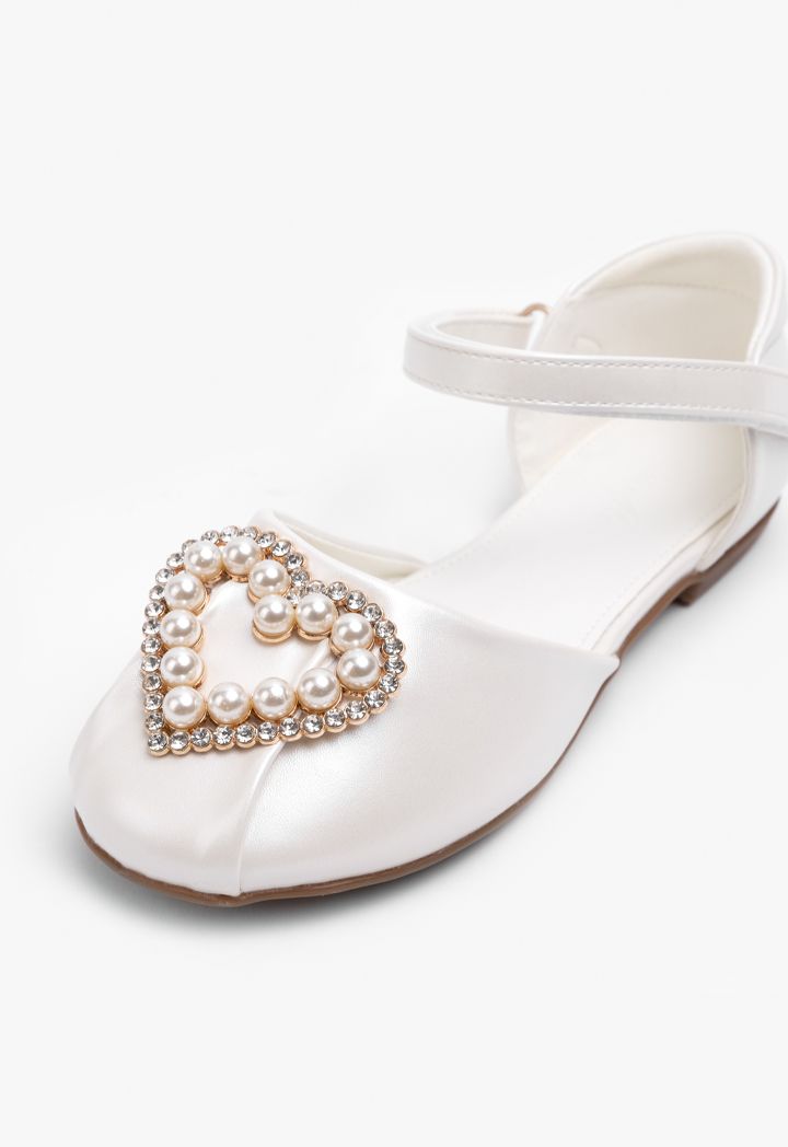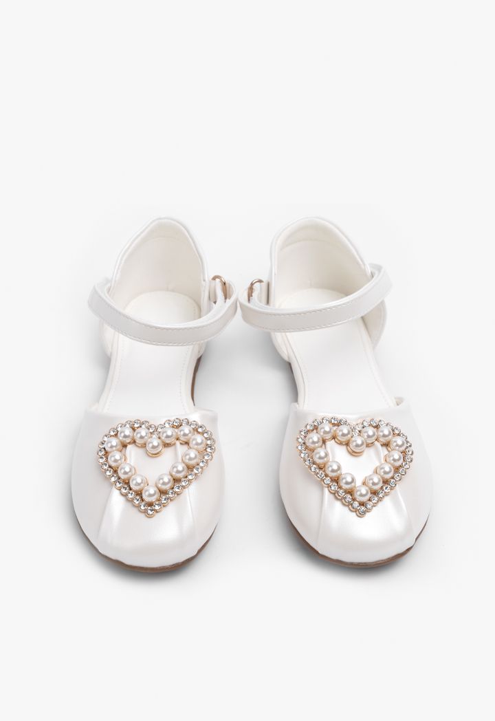 A solid pair of PU leather flat shoes that features a heart charm that is embellished with faux pearls.