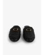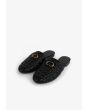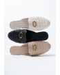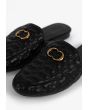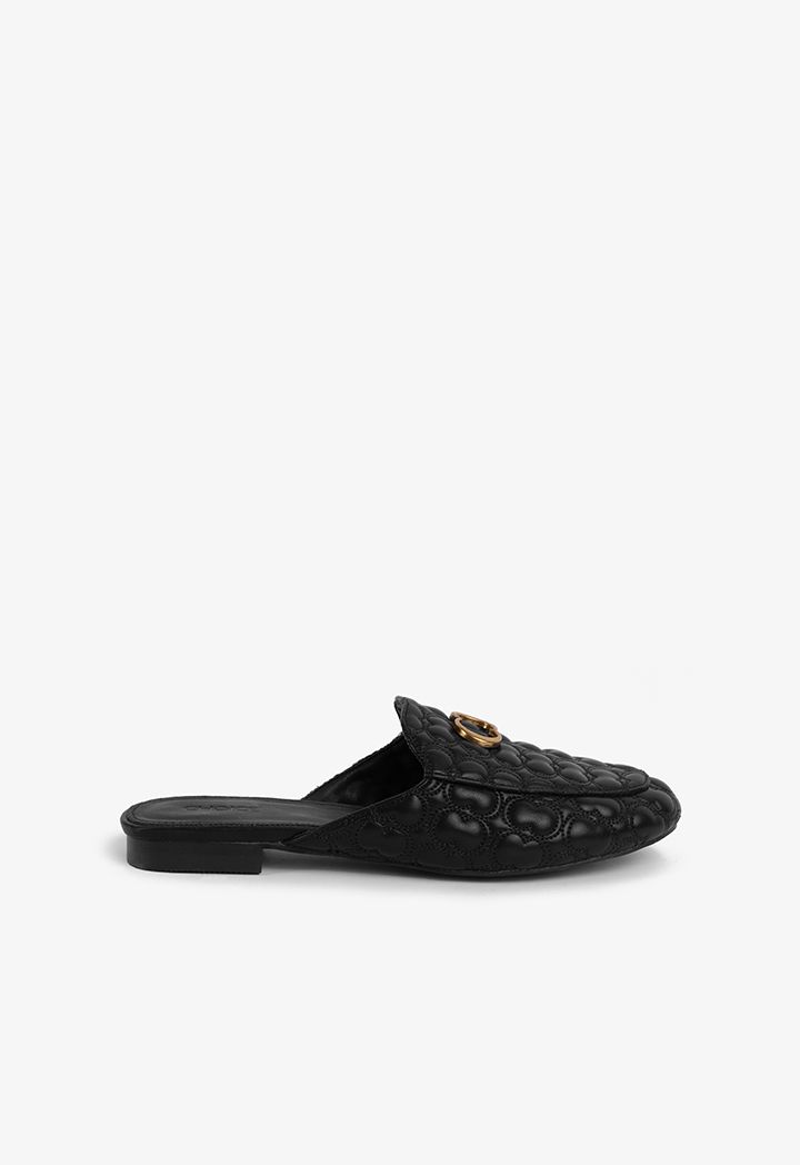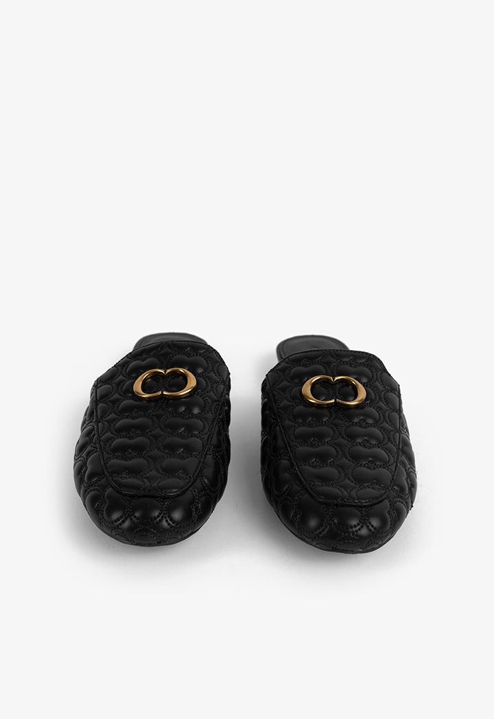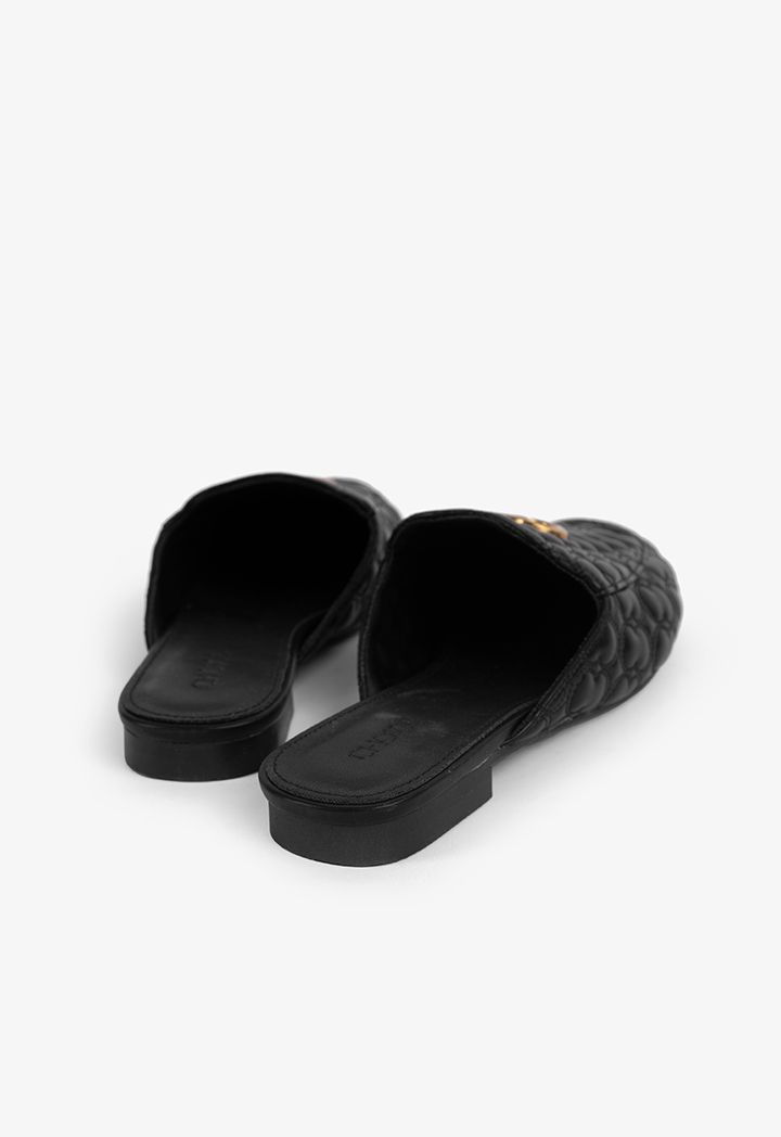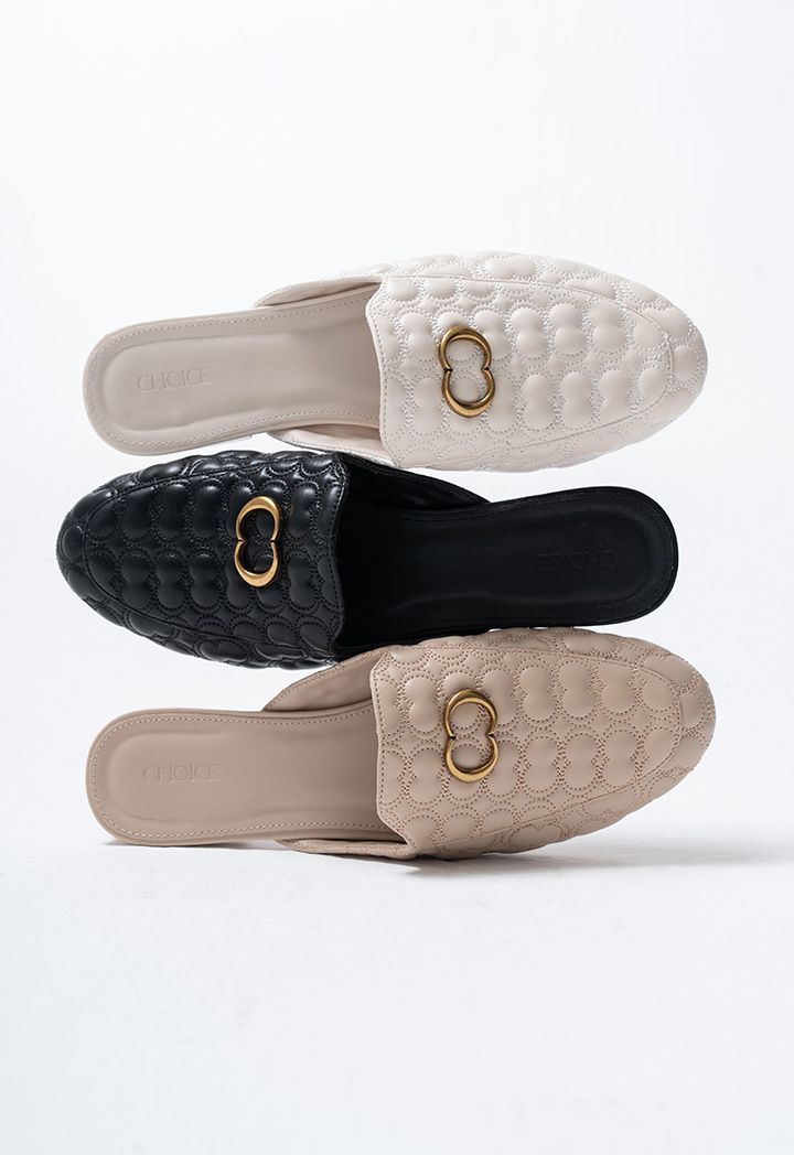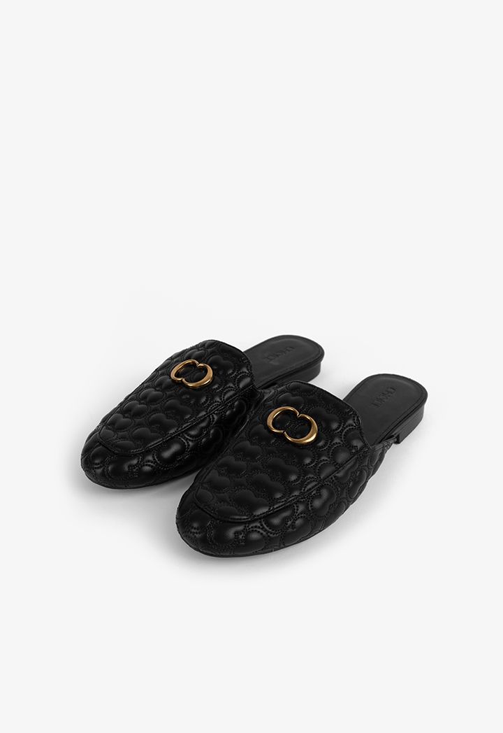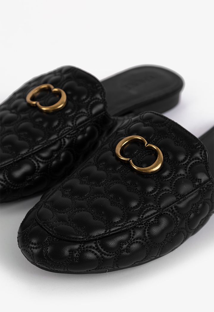 Equip your shoes collection with this unique pair of mules that features a metallic emblem and a quilted design.